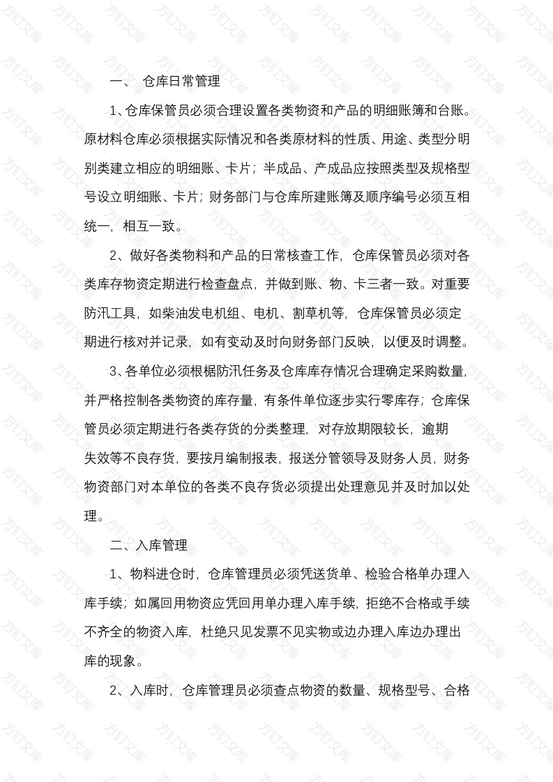仓库日常管理1、仓库保管员必须合理设置各类物资和产品的明细账簿和台账。原材料仓库必须根据实际情况和各类原材料的性质、用途、类型分明别类建立相应的明细账、卡片;半成品、产成品应按照类型及规格型号设立明细账、卡片;财务部门与仓库所建账簿及顺序编号必须互相统一,相互一致。2、做好各类物料和产品的日常核查工作,仓库保管员必须对各类库存物资定期进行检查盘点,并做到账、物、卡三者一致。对重要防汛工具,如柴油发电机组、电机、割草机等,仓库保管员必须定期进行核对并记录,如有变动及时向财务部门反映,以便及时调整3、各单位必须根椐防汛任务及仓库库存情况合理确定采购数量,并严格控制各类物资的库存量,有条件单位逐步实行零库存;仓库保管员必须定期进行各类存货的分类整理,对存放期限较长,逾期失效等不良存货,要按月编制报表,报送分管领导及财务人员,财务物资部门对本单位的各类不良存货必须提出处理意见并及时加以处理。入库管理1、物料进仓时,仓库管理员必须凭送货单、检验合格单办理入库手续;如属回用物资应凭回用单办理入库手续,拒绝不合格或手续不齐全的物资入库,杜绝只见发票不见实物或边办理入库边办理出库的现象。2、入库时,仓库管理员必须查点物资的数量、规格型号、合格证件等项目,如发现物资数量、质量、单据等不齐全时,不得办理)库手续。未经办理入库手续的物资一律作待检物资处理放在待检区域内,经检验不合格的物资一律退回,放在暂放区域,同时必须在短期内通知经办人员负责处理。3、入库物资在未收到相应发票前,仓管员必须建立货到票未到材料明细账,并根据检验单等有效单据及时填开货到票未到收料单在收到发票后,冲销原货到票未到收料单,并开具材料票到收料单月底将货到票未到材料清单上报财务。4、收料单的填开必须正确完整,供应单位名称应填写全称并与发票单位一致,如属票到抵冲的,应在备注栏中注明原入库时间。收料单上必须有保管员及经手人签字,并且字迹清楚三、出库管理1、各类材料的发出,原则上采用先进先出法。根据工程技术人员制定的施工计划,做到限额发放。2,领料人员必须持有主管领导鉴字的领料单,方可领取。领料员和仓库保管员应核对物品的名称、规格、数量、质量状况,核对正确后方可发料;仓管员应开具领料单,经领料人签字,登记入卡、入帐。四、报表及其他管理1、仓库保管员在月末结账前要与财务部门做好物料进出的衔接工作各相关部门的计算口径应保持一致,以保障防汗物资核算的正确性。2必须正确及时报送规定的各类报表,收付存报表、材料耗用汇总表、积压物资报表等,并确保其正确无误。3、库存物资清查盘点中发现问题和差错,应及时查明原因,并进行相应处理。如属短缺及需报废处理的,必须按审批程序经领导审核批准后才可进行处理,否则一律不准自行调整。发现物料失少或质量上的问题(如超期、受潮、生锈、老化、变质或损坏等),应及时用书面的形式向有关部门汇报五、保管员工作职责1、保管员必须作风正派,责任心强,公私分明。努力学习、钻研业务知识,做到四懂二会:懂品名、规格、型号、一般性能用途懂保管常识,懂业务手续,懂消耗规律;会保管维护,会利废节约代用。2、准确地做好材料进出仓库的帐务工作和各种报表。3、严格按照材料的验收要求做好材料验收工作,不合要求或不合格的原材物料坚决不予验收。4、认真做好仓库材料的分类摆放和保管工作5、认真做好仓库安全防范及仓库卫生工作。6、保管员必须严格履行出入库手续,及时准确地记好物资账目随时反映库存变化情况,在规定时间内办好核算、结账和有关报表。六、本制度自公布之日起施行。仓库重地,安全管理制度要落实。万文万万文方万万