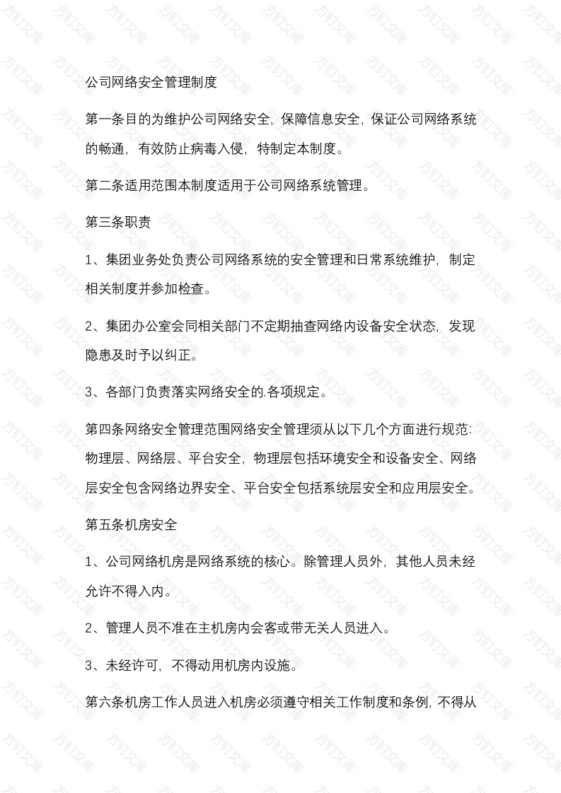 公司网络安全管理制度第一条目的为维护公司网络安全,保障信息安全,保证公司网络系统的畅通,有效防止病毒入侵,特制定本制度。第二条适用范围本制度适用于公司网络系统管理方第三条职责1、集团业务处负责公司网络系统的安全管理和日常系统维护,制定相关制度并参加检查。2、集团办公室会同相关部门不定期抽查网络内设备安全状态,发现隐患及时予以纠正。3、各部门负责落实网络安全的各项规定。第四条网络安全管理范围网络安全管理须从以下几个方面进行规范物理层、网络层、平合安全,物理层包括环境安全和设备安全、网络层安全包含网络边界安全、平台安全包括系统层安全和应用层安全。第五条机房安全1、公司网络机房是网络系统的核心。除管理人员外,其他人员未经允许不得入内。2、管理人员不准在主机房内会客或带无关人员进入3、未经许可,不得动用机房内设施。第六条机房工作人员进入机房必须遵守相关工作制度和条例,不得从事与本职工作无关的事宜,每天上、下班前须检查设备电源情况,在确保安全的情况下,方可离开。第七条为防止磁化记录的破坏,机房内不准使用磁化杯、收音机等产生磁场的物体。第八条机房工作人员要严格按照设备操作规程进行操作,保证设备处于良好的运行状态。网络安全管理制度14第一条为维护公司计算机网络安全、正常运行,确保服务器及各个终端正常使用。使网络资源充分安全共享,为业务经营活动提供安全的网络环境。第二条本制度适用于公司内部办公局域网络和业务局域网络。第三条职责。(1)信息部。①)系统管理岗负责公司整体网络安全的规划、管理及其相关的技术支持。②系统管理岗负责公司网络系统数据的安全备份。③其他岗位协助系统管理岗进行公司网络的安全管理(2)各部门。)负责各自部门使用的计算机网络设备的安全管理。万②负责各自部门数据的安全备份。③负责及时通知信息部有关计算机病毒发生情况及其他安全隐患情况。第四条系统管理岗工作程序。方(1)公司整体网络安全的规划、管理。(2)网络安全信息的追踪,黑客、病毒的日常防护工作。①每天至少一次上网浏览相关网站,下载最新病毒代码。②跟踪最新防病毒信息及其防杀方法,将其及时发布在公司内部网络③及时跟踪防火墙的软硬件升级信息。方订(3)负责公司本部办公网络安全防护工作。①及时升级本公司网络的最新病毒代码。②实时对各个工作终端进行病毒监测。③及时将染病毒的工作终端逐一脱离网络。④对染毒终端逐一进行全面查杀毒。⑤及时对防火墙软、硬件进行升级。⑥建立日常病毒记录日志,记录病毒代码。万文(4)监督、检查、落实公司本部业务的网络安全防护措施等工作。