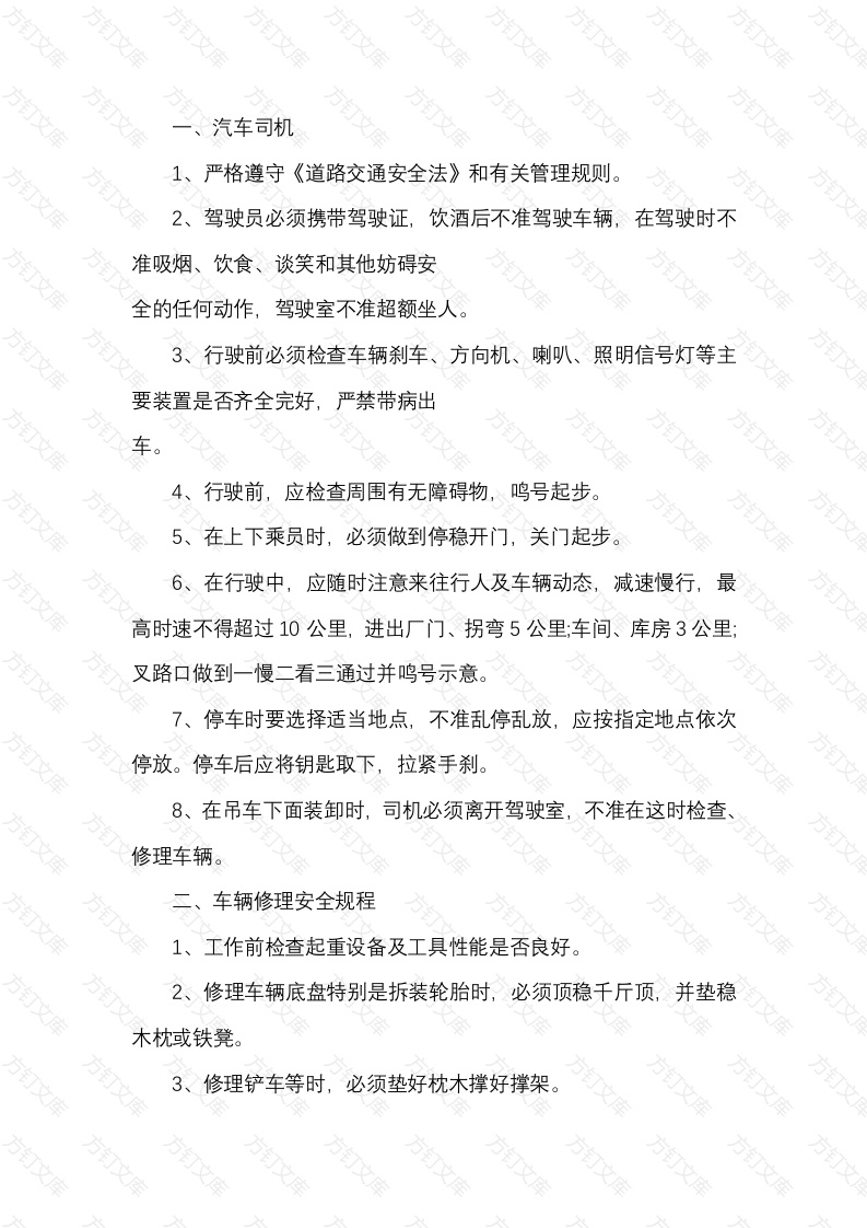 汽车司机严格遵守《道路交通安全法》和有关管理规则2、驾驶员必须携带驾驶证,饮酒后不准驾驶车辆,在驾驶时不准吸烟、饮食、谈笑和其他妨碍安全的任何动作,驾驶室不准超额坐人3、行驶前必须检查车辆刹车、方向机、喇叭、照明信号灯等主要装置是否齐全完好,严禁带病出行驶前,应检查周围有无障碍物,鸣号起步5、在上下乘员时,必须做到停稳开门,关门起步6、在行驶中,应随时注意来往行人及车辆动态,减速慢行,最高时速不得超过10公里,进出厂门、拐弯5公里:车间、库房3公里:叉路口做到一慢二看三通过并鸣号示意。7、停车时要选择适当地点,不准乱停乱放,应按指定地点依次停放。停车后应将钥匙取下,拉紧手刹。8、在吊车下面装卸时,司机必须离开驾驶室,不准在这时检查、修理车辆。二、车辆修理安全规程1、工作前检查起重设备及工具性能是否良好2、修理车辆底盘特别是拆装轮胎时,必须顶稳千斤顶,并垫稳木枕或铁凳。3、修理铲车等时,必须垫好枕木撑好撑架文文4、试车启动前,应先检查周围环境情况。在运转时检查故障须随时注意旋转部位,以防打伤头、手。5、凡需进行试车,必须由持证人员驾驶,试刹车时,必须思想集中,注意车前行人、堆物,并看清车后有无车辆。无驾驶证的修理人员,不准开动各种车辆。只准原地发动。6、试高压火花时不准在加注机油入口处,以防失火。7、油路系统发生故障时,汽油不准以直流方式使用或用软管直接注入化油器发动引擎。8、车辆进行试车时严禁带人,驾驶室两旁不准站人,车辆未停严禁上下。9、凡在夜晚途中修理抛锚车辆时,不准用明火照明10、车辆须气割、烧焊动明火时,事先要采取防火措施三、牵引车、叉车、拖拉机、铲车安全操作规程1、司机必须牢固树立安全第一的观念,加强安全行车责任感严格遵守本规程。2、司机必须持有驾驶证,严禁无证驾驶,实习司机除持有实习证外,必须有正式司机随车带教。3、各种生产用车,必须有保证安全音响器、大小灯、方向灯转向器、制动器等必须灵敏可靠。4、在行驶前,应查看周围行人或障碍物,鸣号起步。5、行驶时应注意来往车辆行人的动态,最高时速不得超过10公里,进出厂门、拐弯时速5公里:车间、库房3公里:叉路口要做到文看三通过6、同方向行驶的车辆,前后两车的距离至少在10米以上,不得后车超前车。7、车辆调头、倒车必须密切注意来往车辆、行人和周围情况慢速进行。8、随车乘员驾驶室设有坐位的只准坐二人(包括司机),其他部位律不准乘坐,挂车一律禁止乘人。9、车辆在行驶中和尚未停稳时,严禁任何人上、下和扒车、跳车10、夜间临时停车在车间门口和交叉路口,应开放小灯,司机不得远离11、车辆在吊车下面装卸物件时,司机必须离开驾驶室以防落物伤人12、叉车作业时铲件升起高度不得超过全车高度的2/3,行驶时铲件离地高度不得高于0.5米。13、行驶时,禁止吸烟、饮食、谈笑或其他妨碍安全动作。14、司机离开车辆必须将开关钥匙随身带走。工作完毕后,必须将车辆刹稳,并摘档熄灭,叉车铲脚应放落地面。15、机动车如发生重大事故,要保护现场,及时报告,经有关部门现场观察分析后才可变动现场。方万万万万
