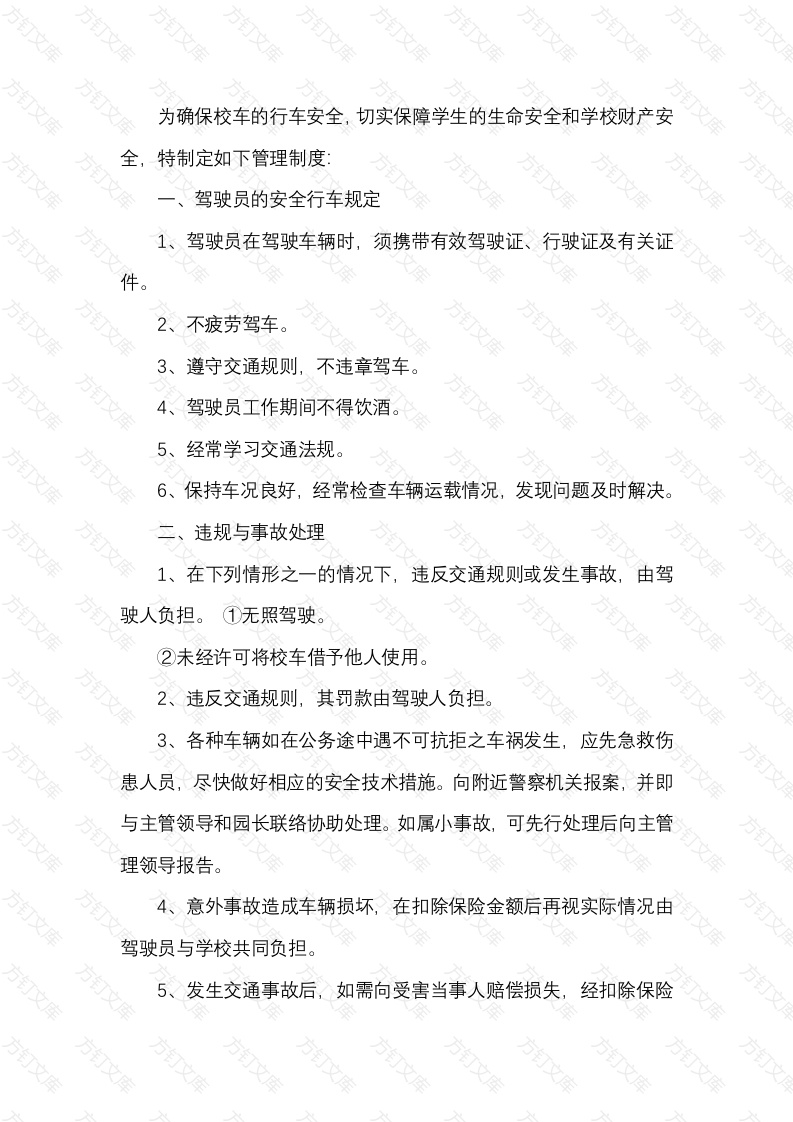 为确保校车的行车安全,切实保障学生的生命安全和学校财产安特制定如下管理制度驾驶员的安全行车规定驾驶员在驾驶车辆时,须携带有效驾驶证、行驶证及有关证件。不疲劳驾车。3、遵守交通规则,不违章驾车4、驾驶员工作期间不得饮酒。5、经常学习交通法规。6、保持车况良好,经常检查车辆运载情况,发现问题及时解决。违规与事故处理1、在下列情形之一的情况下,违反交通规则或发生事故,由驾驶人负担。①无照驾驶。②未经许可将校车借予他人使用。2、违反交通规则,其罚款由驾驶人负担3、各种车辆如在公务途中遇不可抗拒之车祸发生,应先急救伤患人员,尽快做好相应的安全技术措施。向附近警察机关报案,并即与主管领导和园长联络协助处理。如属小事故,可先行处理后向主管理领导报告。4、意外事故造成车辆损坏,在扣除保险金额后再视实际情况由驾驶员与学校共同负担。5、发生交通事故后,如需向受害当事人赔偿损失,经扣除保险文金额后,其差额由驾驶人与学校各负担三、汽车例行保养修理规定1、车辆例行保养是各级保养的基础,属于预防性的日常维护作业,以清洁、检查为中心内容,司机应单独完成。要求:附件齐全螺栓、螺母不松、不缺,保持轮胎气压正常制动可靠、转向灵活,润滑良好、灯光喇叭正常等。2、车辆需维修或保养时,应提前报告学校,经主管领导和校长同意并签名即可。由校长记录公里数,主管领导会同司机一起进维修否则校方将不承认此款项。3、维修车辆出厂,司机必须仔细检验、确认修理妥当,才可签字提车,否则立即告知厂方再次检查或报告主管、另安排检修四、司机日常工作规定1、必须保持车内外清洁整齐。3、若司机于工作期间违反交通规则而遭交警处理司机必须即时呈交案发报告,然后通知学校。五、司机的职责1、学校司机必须遵守《中华人民共和国道路交通安全法》及有关交通安全管理的规章规则。2、司机应爱惜学校车辆,平时要注意车辆的保养,经常检查车辆的主要机件。3、司机每天抽适当时间擦洗车辆,以保持车辆的清洁。出车前要例行检查车辆的水、电、油及其他性能是否正常发现不正常时,要立即加补或调查。出车回来要检查存油量,发现油量不足,应立即加油。加油单据先由主管签名,然后由园长签名,财务方报销。5、司机发现所驾驶的车辆有故障时要立即检修,不会检修的应立即报告学校,并提出具体的维修意见。未经批准不允许私自将车辆送修理维修。6、当接送学生回来,按指定地点停放车辆,下车后检查车内是否遗漏孩子和物品,然后锁好车门并将钥匙交到学校办公室。7、对车辆的各种证件的有效性经常检查,整齐证件才出车。8、晚间司机要注意休息,逢星期日至星期五晚上23点前必须睡觉(特殊情况例外),不准开疲劳车,不准酒后驾车。9、司机驾车一定要遵守交通规则,文明开车,不准危险驾车。10、司机故意违章或证件不全被罚款的费用不予以报销。违章造成后果由当事人负责。11、校内不准按喇叭,车内不准吸烟。12、未出车时,司机应在办公室或门卫室,随时等候出车。13、司机要服从主管的安排,不准借故拖延或拒不出车。14、司机出车执行任务时,遇特殊情况不能按时返回,应立即通知学校,并说明原因。15下班后,应将车辆停放地点保管,并把钥匙交到办公室,不