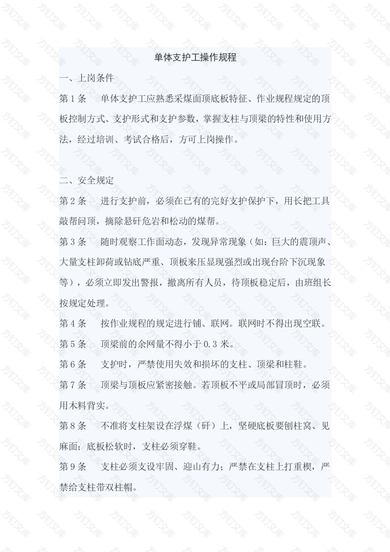 单体支护工操作规程上岗条件第1条单体支护工应熟悉采煤面顶底板特征、作业规程规定的顶板控制方式、支护形式和支护参数,掌握支柱与顶梁的特性和使用方法,经过培训、考试合格后,方可上岗操作。安全规定第2条进行支护前,必须在已有的完好支护保护下,用长把工具敲帮问顶,摘除悬矸危岩和松动的煤帮。第3条随时观察工作面动态,发现异常现象(如:巨大的震顶声大量支柱卸荷或钻底严重、顶板来压显现强烈或出现台阶下沉现象等),必须立即发出警报,撤离所有人员,待顶板稳定后,由班组长按规定处理。第4条按作业规程的规定进行铺、联网。联网时不得出现空联。第5条顶梁前的余网量不得小于0.3米。第6条支护时,严禁使用失效和损坏的支柱、顶梁和柱鞋。第7条顶梁与顶板应紧密接触。若顶板不平或局部冒顶时,必须用木料背实。第8条不准将支柱架设在浮煤(矸)上,坚硬底板要刨柱窝、见麻面:底板松软时,支柱必须穿鞋第9条支柱必须支设牢固、迎山有力;严禁在支柱上打重楔,禁给支柱带双柱帽。文万第10条必须根据支护高度的变化,选用相应高度的支柱。选用1.0米以上的摩擦式金属支柱和单体液压支柱时,支设最大高度应小于支柱设计最大高度的0.1米,最小高度应大于支柱设计最小高度的0.2米,选用其他支柱时,严禁超高支设。第11条工作面内不得使用不同类型和不同性能的支柱。特殊情况下需使用时,必须经矿上研究确定并制定安全措施。第12条不准站在输送机上或跨着输送机进行支护第13条调整顶梁、架设支柱时,其下方5米内不得有人第14条临时支柱的位置应不妨碍架设基本支柱:基本支柱架设好前,不准回撤临时支柱。第15条平行作业的距离必须符合规定。支柱与回柱间的间隔距离不得小于15米;支柱与推移输送机的距离不得大于15米;其他的符合作业规程规定。当支护工序与其他工序发生脱节时,支护工有权要求暂停或减缓其他工序,优先进行支护。第16条在采煤面架设摩擦式金属支柱时,必须使用液压升柱器,保证支柱初撑力不小于5OkN;架设单体液压支柱时,要掌握好注液用力与时间,保证支柱的初撑力其柱径为100毫米的不小于90千牛、柱径为80毫米的不小于60千牛三、操作准备第17条备齐注液枪、卸荷手把、液压升柱器、支柱定位卡具、锨、镐、锤、斧子、锯等工具,并检查工具是否完好、牢固可靠第18条检查液压管路是否完好第19条检查工作地点的顶板、煤帮和支护是否符合质量要求,发现问题及时处理。万四、正常操作(一)单体液压支柱与摩擦式金属支柱支护操作第20条架设带帽点柱程序单体液压支柱:量好排、柱距→清理柱位→竖立支柱→用注液枪清洗注液阀煤粉→将注液枪卡套卡紧注液阀→给支柱带帽→供液升柱。摩擦式金属支柱:量好排、柱距→清理柱位→竖立支柱→挂液压升柱器→给柱带帽→升柱。第21条架设挂梁支柱程序单体液压支柱:挂梁(使用顶网的先挂网)→插调角楔→背顶一打紧调角楔→·清理和定柱位→竖立支柱→清洗注液阀煤粉·供液升柱。摩擦式金属支柱:挂梁(使用顶网的先挂网)→插调角楔一→背顶一→打紧调角楔一→清理和定柱位→竖立支柱→挂液压升柱器→升柱一→打紧水平楔。第22条操作时应符合下列规定:1.挂网时将网展开拉直,按作业规程规定要求进行连接:文2.挂梁支柱时,每组不少于二人,一人站在支架完整处两手抓住铰接顶梁将其插入己安设好的顶梁两耳中,另一人站在人行道,插上顶梁圆销并用锤将圆销打到位: