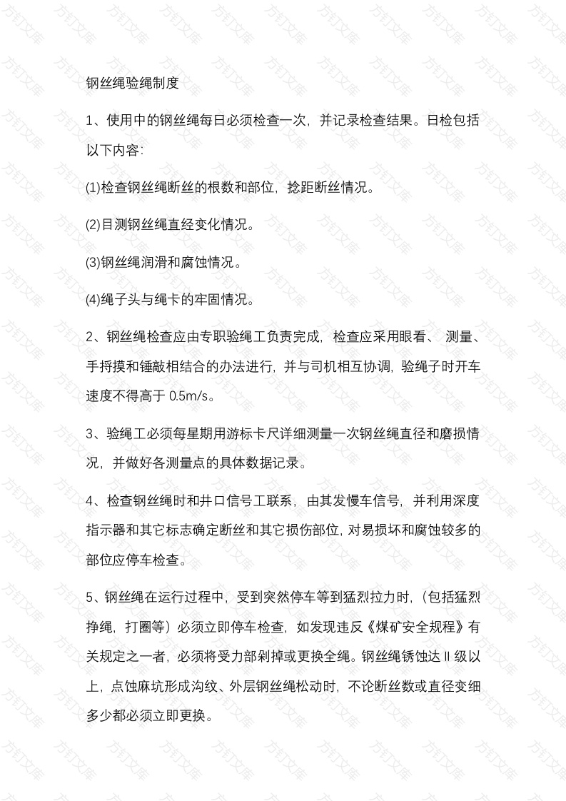钢丝绳验绳制度1、使用中的钢丝绳每日必须检查一次,并记录检查结果。日检包括以下内容:(1)检查钢丝绳断丝的根数和部位,捻距断丝情况。方(2)目测钢丝绳直经变化情况。文方(3)钢丝绳润滑和腐蚀情况。(4)绳子头与绳卡的牢固情况。2、钢丝绳检查应由专职验绳工负责完成,检查应采用眼看、测量、手捋摸和锤敲相结合的办法进行,并与司机相互协调,验绳子时开车速度不得高于0.5m/s。3、验绳工必须每星期用游标卡尺详细测量一次钢丝绳直径和磨损情况,并做好各测量点的具体数据记录。4、检查钢丝绳时和井口信号工联系,由其发慢车信号,并利用深度指示器和其它标志确定断丝和其它损伤部位,对易损坏和腐蚀较多的部位应停车检查。5、钢丝绳在运行过程中,受到突然停车等到猛烈拉力时,(包括猛烈挣绳,打圈等)必须立即停车检查,如发现违反《煤矿安全规程》有关规定之一者,必须将受力部剁掉或更换全绳。钢丝绳锈蚀达‖级以上,点蚀麻坑形成沟纹、外层钢丝绳松动时,不论断丝数或直径变细多少都必须立即更换。6各种股捻钢丝绳在个捻距内断丝断面积,同钢丝绳总断面积之比达到10%必须更换,7、上提或下放重物时,每次都必须执行下列规定。(1)验绳工要对钢丝绳和连接钩头进行一次详细检查(2)下放重物时绞车司机与井口把钩工密切合作,待钢丝绳伸直重物静止后,方可慢下放。8、运输区工程师至少每月检查一次钢丝绳检查记录本,查阅后签名,运输区区长每月应根据月检记录,进行一次统计分析,并整理出技术资料。9、使用中的钢丝绳每月至少涂油一次,钢丝绳的涂油可用人工和喷油器,一般用手逆钢丝绳运动方向往绳上抹油或用喷油机(绳速为1m/s),涂油前应将钢丝绳上的油圬清除掉。提升用钢丝绳定期检查、试验与更换安全规定1、提升钢丝绳必须每天检查1次。对易损坏或断丝、锈蚀较多的段应停车详细检查。断丝的突出部分应在检查时剪下。检查结果应记入钢丝绳检查记录簿。2、提升钢丝绳的定期试验,应遵守下列规定(1)升降人员或升降人员和物料用的钢丝绳,自悬挂时起每隔6个月试验1次;悬挂吊盘的钢丝绳,每隔12个月试验1次,2)升降物料用的钢丝绳,自悬挂时起经过1年进行第1次试验以后每隔6个月试验1次,直径在18mm及其以下的专为升降物料用的钢丝绳,不受上述限制。提升钢丝绳有下列情况之一者必须更换(1)各种股捻钢丝绳在1个捻距内断丝断面积,同钢丝总断面积之比达到下列规定时,必须更换:①升降人员或升降人员和物料用的钢丝绳为5%②专为升降物料用的钢丝绳为10%;③专为无极绳运输用的钢丝绳为25%。(2)钢丝绳在运行中遭受到卡车、突然停车等猛烈拉力时,必须立即停车检查,发现有下列情况之一者,必须将受力段剁掉或更换全绳①钢丝绳产生严重扭曲或变形文②断丝超过本条(1)的规定③直径减小值超过本条(3)的规定,方④遭受猛烈拉力的一段,其长度伸长0.5%以上。在钢丝绳使用后期,断丝数突然增加或伸长突然加快(例如:连续3天出现显著伸长,或在某一捻距内每天都有断丝出现)必须立即更换。(3)以钢丝绳标称直径为准计算的直径减小量达到下列数值时,必须更换:提升钢丝绳或制动钢丝绳为10%;
