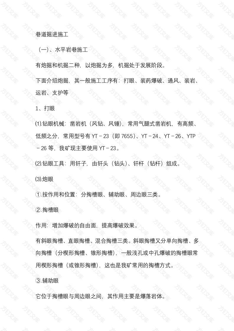 巷道掘进施工万(一)、水平岩巷施工万有炮掘和机掘二种,以炮掘为多,机掘处于发展阶段。下面介绍炮掘,其一般施工工序有:打眼、装药爆破、通风、装岩、运岩、支护等文1、打眼(1).钻眼机械:凿岩机(风钻、风锤),常用气腿式凿岩机,有高频低频之分,常用型号有YT-23(即7655)、YT-24、YT-26、YTP26等,我矿现主要使用YT-23。(2)钻眼工具:用钎子,由钎头(钻头)、钎杆(钻杆)组成。方(3).炮眼①按作用和位置:分掏槽眼、辅助眼、周边眼三类。2.掏槽眼作用:增加爆破的自由面,提高爆破效果。有斜眼掏槽、直眼掏槽、混合掏槽三类。斜眼掏槽又分单向掏槽、多向掏槽(分楔形掏槽、锥形掏槽),一般浅孔或中孔爆破的掏槽眼常用楔形掏槽(或锥形掏槽),这也是我矿常用的掏槽方式。③.辅助眼它位于掏槽眼与周边眼之间,其作用主要是爆落岩体。周边眼它是位于巷道轮廓周边的炮眼,最主要作用是保证巷道成型。2、装药爆破(1).炸药方丁煤矿使用炸药一般是工业用的硝铵类炸药煤矿还必须使用煤矿许用炸药,我矿是突出矿井,必须使用安全等级不低于三级的煤矿许用炸药,煤与瓦斯突出危险工作面,必须使用安全等级不低于三级的煤矿许用含水炸药。(2).雷管煤矿只允许使用煤矿许用瞬发电雷管和煤矿许用毫秒延期电雷管,毫秒电雷管的延期时间不得超过130ms,实际使用中即只能使用1~5段毫秒电雷管(3).装药文装药结构有正向装药、反向装药。对高瓦斯矿井,正向装药(即起爆药包位于所有炸药包的最外端,雷管底部朝向眼底)(正向起爆)安全性较好。(4).联线有串联、并联、混合联(串并联、并串联)三种般采用串联和串并联较多。万万文(5).爆破毫秒爆破、光面爆破是常用的较先进的爆破技术,尤其应大力推广光面爆破技术。3、通风万文掘进基本上是采用局部通风机通风,方式有压入式、抽出式、混合式三种,掘进通风一般应采用局扇压入式(我矿都是),突出煤层煤巷必须采用压入式。4、装岩有人工装岩、机械装岩二种装岩机械主要有耙斗装岩机、铲斗式装岩机。耙斗装岩机的耙斗有0.15、0.3、0.6、0.9m3等几种方方铲斗装岩机有后卸式、侧卸式二种。5、运岩有人工或机车矿车运输、机械连续运输(如刮板运输机、皮带运输机等)等方式,机械连续运岩是发展方向。采用配套的岩石装运作业线是优选方案。万万岩石装运作业线主要形式有:铲斗后卸式装岩机(或耙斗装岩机)普通矿车小型电机车万万万万