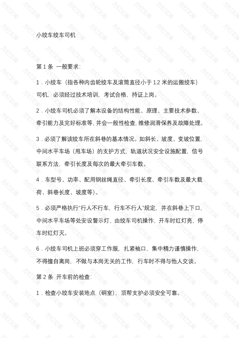小绞车绞车司机方第1条一般要求小绞车(指各种内齿轮绞车及滚筒直径小于1.2米的运搬绞车)文司机,必须经过技术培训,考试合格,持证上岗。2·小绞车司机必须了解本设备的结构性能、原理、主要技术参数、牵引能力及完好标准等,并会一般性检查,维修润滑保养及故障处理。3·必须了解该绞车所在斜巷的基本情况。如斜长、坡度、变坡位置中间水平车场(甩车场)的支护方式,轨道状况安全设施配置,信号联系方法,牵引长度及每次的最大牵引车数。4·车型号、功率、配用钢丝绳直径、牵引长度、牵引车数及最大载荷、斜巷长度、坡度等)。5.必须严格执行“行人不行车,行车不行人"规定,并在斜巷上下口中间水平车场等处安设警示灯,由绞车司机操作,开车时红灯亮,停车时红灯灭。6·小绞车司机上班必须穿工作服,扎紧袖口,集中精力谨慎操作不得擅自离岗,不做与本岗无关的工作,行车时不得与他人交谈。第2条开车前的检查:检查小绞车安装地点顶帮支护必须安全可靠。万检查小绞车的安装固定应平稳牢固,压紧支柱应无松动、腐朽变质等,用地锚或混凝土基础的小绞车要检查地锚,:基础螺栓无松动、变位,视察滚筒中心是否与斜巷中心一致。安装在巷道一帮的绞车其最突出的部位应距轨道外侧不小于400mm。3·检查小绞车制动闸、离合闸。闸带必须完整无断裂,磨损余厚不得小于4m,铜或铝锚钉不得磨闸轮,闸轮磨损不得超过2m,表面清洁平滑,无明显痕迹,无油泥,各部螺栓、销、轴、拉杆螺栓及背帽、限位螺栓完整齐全,无弯曲变形。施闸后,闸把位置在水平线以上30一40度即应闸死,闸把位置严禁低于水平线。(其它小绞车闸的工作行程不得超过全行程的2/3一4/5闸位即应闸死)。4.检查钢丝绳。要求无弯曲变形、硬伤、无打结、无严重锈蚀,断丝不超限,在滚筒上的一端固定要牢固,不准剁股穿绳,在滚筒上排列应整齐,无严重咬绳、爬绳现象。缠绕绳不得超过绞车规定容绳量,绳径符合要求,松绳至终点,滚筒上余绳不得小于3圈,保险绳直径与主绳直径应相同,并连接牢固,绳端连接装置应符合《煤矿安全规程》的规定,有可靠的护绳板。5,检查小绞车的控制开关。操纵按扭、电机、电铃等应无失爆现象。信号必须声光兼并,声音清晰,准确可靠6.试空车,可松开离合闸,压紧制动闸,启动绞车空转,应无异常响声和振动,无甩油现象。通过以上检查,发现问题必须向上级汇报,待处理发后才能开动绞车。万万第3条起动1·听到清晰、准确的信号后,首先应送上红灯,向行人示警准备提车,严禁行人行走,闸紧制动闸,松开离合闸,按信号指令方向起动空车运转。2.缓缓压紧离合闸,同时缓缓松开制动闸把,使滚筒慢转,平稳起动加速,最后压紧合闸,松开制动闸,达到正常运行速度。3.绞车司机必须在护绳挡板后进行操作,严禁在侧面或滚筒前面(出绳侧)操作,严禁一手开车,另一手处理爬绳。4.下放矿车时,应与把钩工配合好,随推车随放绳,不得留有余绳以免车过变坡点时突然加速而崩断钢丝绳。5.禁止两个闸把同时压紧,以防烧坏电机。第4条运行文1·小绞车运行中,司机应集中精力,注意观察,手不离闸把,如收到不明信号时应立即停车查明原因,采取紧急措施。2.注意小绞车各部运行情况,如发现以下情况时,应立即停车采取措施待处理好后再运行。1)有异常响声、异味、异状。钢丝绳有异常跳动,负载增大或突然松驰。万万