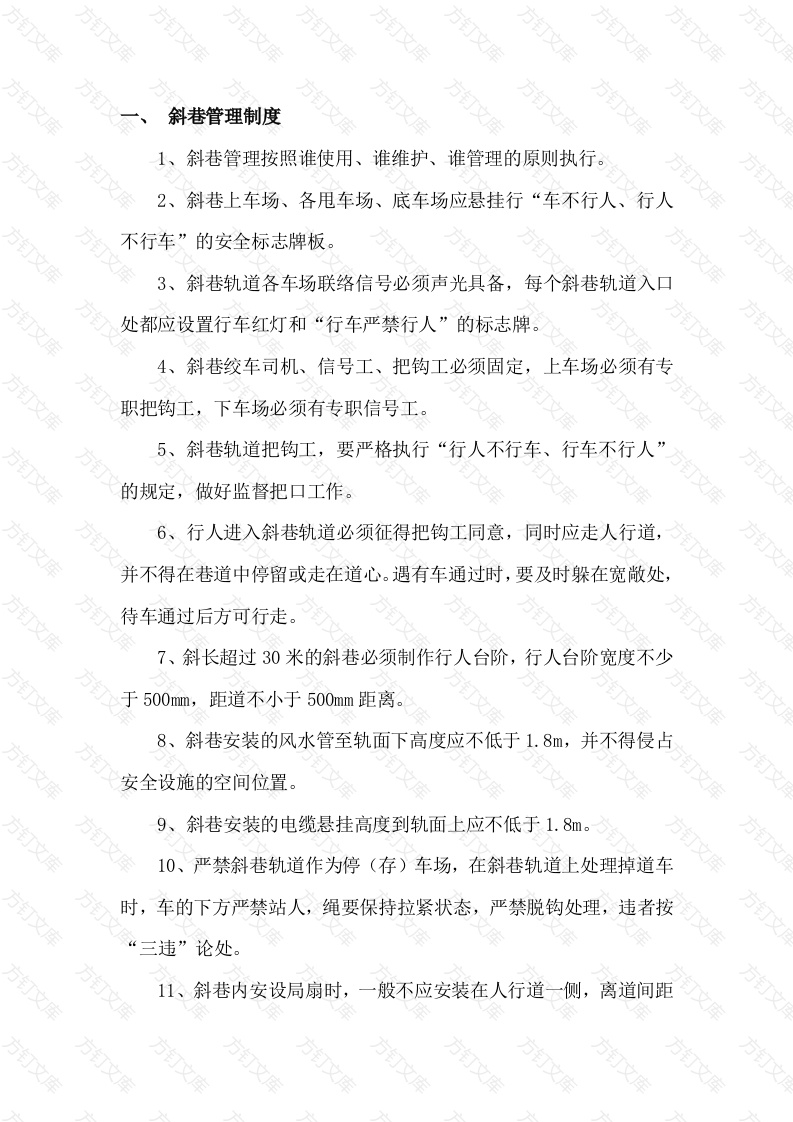 斜巷管理制度斜巷管理按照谁使用、谁维护、谁管理的原则执行2、斜巷上车场、各甩车场、底车场应悬挂行“车不行人、行人不行车”的安全标志牌板。3、斜巷轨道各车场联络信号必须声光具备,每个斜巷轨道入口处都应设置行车红灯和“行车严禁行人”的标志牌。4、斜巷绞车司机、信号工、把钩工必须固定,上车场必须有专职把钩工,下车场必须有专职信号工。5、斜巷轨道把钩工,要严格执行“行人不行车、行车不行人的规定,做好监督把口工作。6、行人进入斜巷轨道必须征得把钩工同意,同时应走人行道,并不得在巷道中停留或走在道心。遇有车通过时,要及时躲在宽敞处,待车通过后方可行走7、斜长超过30米的斜巷必须制作行人台阶,行人台阶宽度不少于500mm,距道不小于500mm距离。8、斜巷安装的风水管至轨面下高度应不低于1.8m,并不得侵占安全设施的空间位置。9、斜巷安装的电缆悬挂高度到轨面上应不低于1.8m。10、严禁斜巷轨道作为停(存)车场,在斜巷轨道上处理掉道车时,车的下方严禁站人,绳要保持拉紧状态,严禁脱钩处理,违者按违”论处11、斜巷内安设局扇时,一般不应安装在人行道一侧,离道间距不小于500mm,条件不允许时,局扇必须吊挂一定高度,确保人行道畅通。斜巷安全设施要求1、斜巷水平上车场,必须装有灵活有效,自动复位的阻车器阻车器坑应保持干净,不得有杂物、积水。2、变坡点以下略大于一列车长度处装设一道常闭挡车栏。1.2米以上绞车装设自动联锁挡车栏,1.2米以下绞车装设手动绳式挡车器。3、各斜巷中部车场及上部车场入口处要设置防止车辆误入的挡车栏。4、上部车场挡车栏到中部巷道之间必须设置一道自动防跑车装置,根据巷道变化情况,坡度较大段可增设一套自动防跑车装置。5、各种安全设施应刷红白相间的防锈标志漆,每道间距为200mm。6、斜巷安全设施要实行编号管理,挂牌管理,明确日常维修人每天检查一遍,确保灵活可靠。7、各种挡车栏、阻车器必须经常处于关闭状态,行车时方可打开,每发现一次不常闭罚责任者100元。8、阻车器、挡车杠因操作不当造成挡车设施损坏的,必须按价赔偿,使用维护单位必须在8小时内恢复,否则每拖延一天罚款200元,并追究队领导责任。9、斜巷提升应使用标准三环链和连接销子,并做特殊标记,发现次不正确使用,对责任者罚款200元,联责队长罚款20元。10、斜巷专用连接装置在初次使用前和使用后,每两年应送检验部门进行拉力试验,合格后方可使用,由机电科运管组负责。11、运输队要建立车辆连接装置台帐和检查记录,连接装置的安全系数必须符合规程规定。12、私自拆除安全设施的按破坏生产论处,由矿组织追查处理。13、掘进施工工程结束后,需移交后续单位使用的各种运输安全设施,在移交巷道时,由机电科运管组参加一并移交后续单位,并办理移交手续,数量不够或损坏的,由原使用单位在规定期限内配齐。14、需拆除的运输安全设施,由拆除单位会同机电科运管组移交给机修厂维修,维修完好后,变机电科库房。15、运输区应经常检查库存运输安全设施情况,及时通知机修加工补充,因运输区未通知加工而造成影响的,由矿追查运输区的责任。因机修厂加工不及时而影响使用的,由运输区追查机修厂的责任。三、斜巷及采区轨道质量标准要求1、轨道的轨距误差在10mm之内,发现一处不符合要求罚款202、接头的间隙不得大于10mm,高低和左右偏差不得大于2mm,发现一处不符合要求罚款10元。3、两根轨道水平差不得超过5mm,直线巷道两轨保持同一水平消灭阴阳道,发现一处不符合要求罚款10元。4、轨道接头必须使用合格的道夹板和4个螺栓固定,消灭无眼道,零部件齐全,紧固,无撑棍,处不符合要求罚款20元。