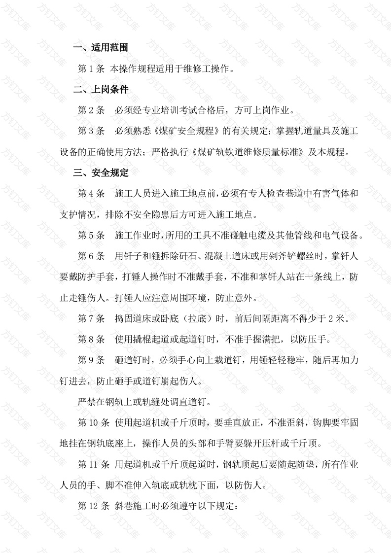 适用范围万第1条本操作规程适用于维修工操作。二上岗条件第2条必须经专业培训考试合格后,方可上岗作业。第3条必须熟悉《煤矿安全规程》的有关规定;掌握轨道量具及施工设备的正确使用方法:严格执行《煤矿轨铁道维修质量标准》及本规程三、安全规定第4条施工人员进入施工地点前,必须有专人检查巷道中有害气体和支护情况,排除不安全隐患后方可进入施工地点。第5条施工作业时,所用的工具不准碰触电缆及其他管线和电气设备第6条用钎子和锤拆除矸石、混凝土道床或用剁斧铲螺丝时,掌钎人要戴防护手套,打锤人操作时不准戴手套,不准和掌钎人站在一条线上,防止走锤伤人。打锤人应注意周围环境,防止意外。第7条捣固道床或卧底(拉底)时,前后间隔距离不得少于2米第8条使用撬棍起道或起道钉时,不准手握满把,以防压手。第9条砸道钉时,必须手心向上栽道钉,用锤轻轻稳牢,随后再加力钉进去,防止砸手或道钉崩起伤人严禁在钢轨上或轨缝处调直道钉。第10条使用起道机或千斤顶时,要垂直放正,不准歪斜,钩脚要牢固地挂在钢轨底座上,操作人员的头部和手臂要躲开压杆或千斤顶。第11条用起道机或千斤顶起道时,钢轨顶起后要随起随垫,所有作业人员的手、脚不准伸入轨底或轨枕下面,以防伤人。第12条斜巷施工时必须遵守以下规定:严格执行“行人不行车,行车不行人、不作业”的规定。2、开工前要与信号把钩工联系好,并关闭上车场阻车器后方可进入现场。3、进入现场前,必须将斜巷上口附近5米以内的浮杂物清理干净,并设专人监护看守,以防异物滑落伤人。4、工作时必须由下向上进行。上端工作人员要注意保护下端工作人员的安全。一条斜巷中严禁两个或两个以上地点同时施工。5、作业时要站在平稳可靠地点,所用工具要放稳、放牢,传递工具时要互叫互应,不准乱扔乱放。6、工作中清理出来的煤、矸石及杂物应及时装车运走:施工完毕后必须将矸石、物料清理干净,确保安全行车。7、需要运送钢轨或物料时,必须和斜巷上、下端的信号工及绞车司机联系好,说明运送地点、行车速度及安全注意事项等。8、运送钢轨时要捆绑牢固,下端必须兜揽防护装置,防止钢轨在运行中脱落或窜出。9、使用特别车辆运送钢轨、物料、器材等(简称物件),需要装卸或跟送(监护)时,必须遵守下列规定:(1)向上运行时装卸人员不准跟车,必须提前到达工作地点。(2)当物件车向下运行时,跟车人应在物件车上方并保持5米以上的距离。(3)监护物件的跟车人员必须精力集中,发现物件车刮碰或脱轨,必须立即停车。10装卸物件时必须用绳扣将车栓牢后方可进行。施工地点的新旧钢轨、连枕都必须整齐的码放在宽阔地带。第13条维修轨道时不准单人作业。第14条认真执行岗位责任制和交接班制度。四、操作准备第15条开工前,首先检查所用工具是否齐全、完好。第16条凡铺设、维修轨道前,必须经调度及有关人员同意后方可施工。五、正常操作第17条在有机车运行的线路上施工时,施工区段的两端40米以外必须设红灯示警,并设专人防护和指挥机车的停车。曲线段施工时,防护人员必须站在直线段。第18条机车通过施工区段前,必须经专人检查轨道线路,确认无影响列车安全通过的隐患后方可放行。车辆通过时,所有工作人员必须躲在安全地点。第19条在有架线的地点施工时,应先停电、后施工;不能停电时,长柄工具要平拿、平放,操作时不准碰架线,以防触电。第20条凡双轨运输,遇特殊情况不能行驶机车时,必须在此线路的两端用明显的标志示警,并通知调度。第21条在主要运输大巷施工时,防护人员与施工地点之间的距离不得少于60米;遇有弯道时,防护人员必须在直道部位。第22条运送、装卸钢轨时应注意下列各项:1、运送钢轨应使用专用车或平板车、材料车。2、装卸钢轨时要由一个喊号,一头先起或一头先放。3、运送钢轨的专车不准乘人,并有专人前后监护。车速不得大于2米