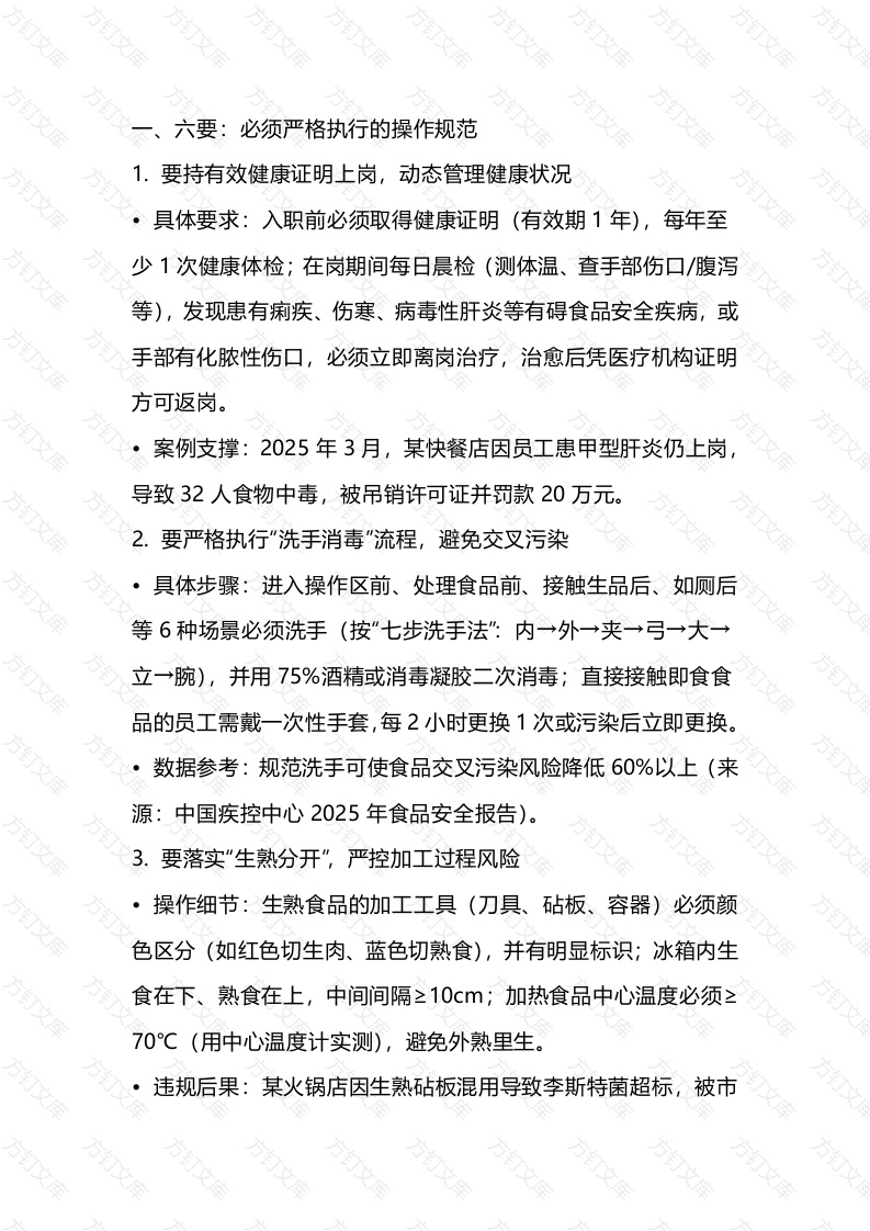 六要:必须严格执行的操作规范要持有效健康证明上岗,动态管理健康状况具体要求:入职前必须取得健康证明(有效期1年),每年至少1次健康体检;在岗期间每日晨检(测体温、查手部伤口/腹泻等),发现患有痢疾、伤寒、病毒性肝炎等有碍食品安全疾病,或手部有化脓性伤口,必须立即离岗治疗,治愈后凭医疗机构证明方可返岗。案例支撑:2025年3月,某快餐店因员工患甲型肝炎仍上岗,导致32人食物中毒,被吊销许可证并罚款20万元。2.要严格执行”洗手消毒”流程,避免交叉污染具体步骤:进入操作区前、处理食品前、接触生品后、如厕后等6种场景必须洗手(按”七步洗手法”:内→外→夹→弓→大→立→腕),并用75%酒精或消毒凝胶二次消毒;直接接触即食食品的员工需戴一次性手套,每2小时更换1次或污染后立即更换。数据参考:规范洗手可使食品交叉污染风险降低60%以上(来源:中国疾控中心2025年食品安全报告)。3.要落实“生熟分开,严控加工过程风险操作细节:生熟食品的加工工具(刀具、砧板、容器)必须颜色区分(如红色切生肉、蓝色切熟食),并有明显标识;冰箱内生食在下、熟食在上,中间间隔≥10cm;加热食品中心温度必须≥70℃(用中心温度计实测),避免外熟里生。违规后果:某火锅店因生熟砧板混用导致李斯特菌超标,被市场监管部门罚款5万元(2025年1月案例)4要规范存储食材,严格把控原料质量执行标准:食材入库前必须查验供货商资质(许可证、检测报告)和保质期,台账记录保存≥2年;冷藏食材(0-4℃)存储不超过72小时,冷冻食材(-18℃以下)不超过3个月,每日检查并记录冰箱温度;散装食材需标注“品名+入库日期+保质期"。实操工具:使用”色标管理法”(绿色合格、黄色待检、红色不合格)分区存放食材。5.要定期清洁消毒设备,保持操作环境整洁频次要求:操作台、地面每日收工后用200mg/儿含氯消毒液擦拭;蒸箱、炸炉等每周深度清洁1次(拆洗滤网、管道);消毒柜每日开机消毒≥30分钟,记录消毒时间和温度(≥121℃)垃圾桶必须带盖,日产日清。关键区域:后厨”三防设施”(防蝇灯、鼠笼、纱窗)每周检查1次,确保无破损。6.要主动学习安全知识,及时处置突发问题学习要求:每月参加1次食品安全培训(内容包括添加剂使用规范、应急处理等),考核合格方可上岗;发现食材变质、包装破损等问题,立即停止使用并上报店长,同步记录“问题食品处理台账”(含销毁记录、拍照存档)。应急流程:发生顾客疑似食物中毒,立即封存可疑食品及原料保留呕吐物样本,拨打12315并配合调查。六不要:绝对禁止的危险行为1.不要带病上岗或隐瞒健康异常禁止情形:明知自己有发热、腹泻、咽部炎症等症状仍坚持工作;隐瞒乙肝、痢疾等病史;手部有伤口未包扎直接接触食品。·法规依据:违反《食品安全法》第34条,个人最高可处5000元罚款,企业最高罚10万元。2.不要违规使用食品添加剂禁止行为:超范围使用添加剂(如包子中加柠檬黄)、超限量添加(如肉制品中亚硝酸盐超标):使用非食用物质(如甲醛泡毛肚、工业碱发海参);添加剂未专人保管、专柜存放(需上锁并记录使用量)。数据警示:2024年全国餐饮抽检中,38%的不合格项为添加剂超标(来源:市场监管总局通报)。3.不要使用来源不明或过期的原料禁止情形:采购“三无”食品(无厂名、无厂址、无保质期);使用过期原料“翻新”(如过期面包做布丁);回收顾客剩余食品二次销售(如未开封的饮料重新上架)。典型案例:2025年5月,某蛋糕店使用过期奶油制作裱花蛋糕,被吊销执照并罚款100万元。4.不要在操作区从事与工作无关的行为禁止动作:在食品加工区抽烟、嚼口香糖、耳环等饰品操作食品;将私人物品(包、化妆品)带入后厨;穿