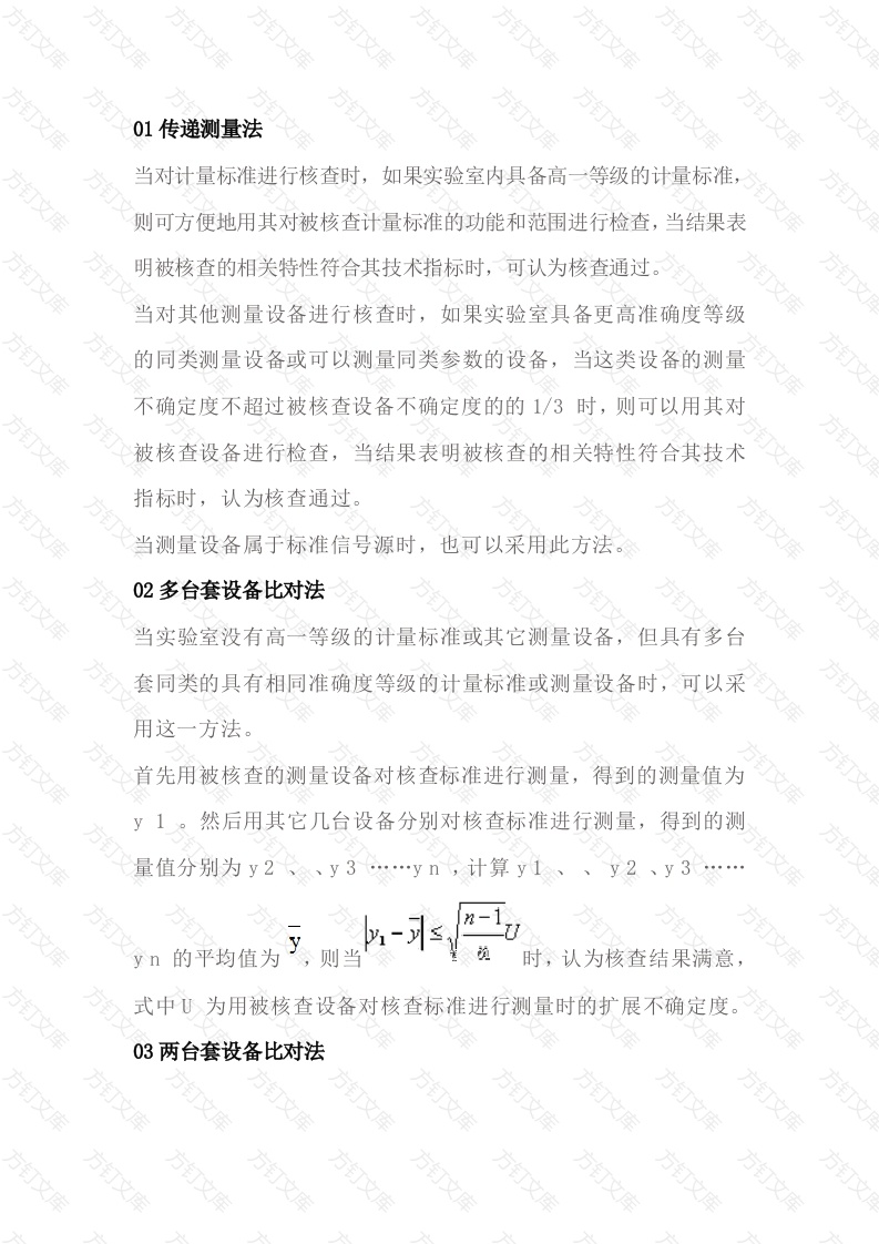 01传递测量法当对计量标准进行核查时,如果实验室内具备高一等级的计量标准,则可方便地用其对被核查计量标准的功能和范围进行检查,当结果表明被核查的相关特性符合其技术指标时,可认为核查通过。当对其他测量设备进行核查时,如果实验室具备更高准确度等级的同类测量设备或可以测量同类参数的设备,当这类设备的测量不确定度不超过被核查设备不确定度的的1/3时,则可以用其对被核查设备进行检查,当结果表明被核查的相关特性符合其技术指标时,认为核查通过。当测量设备属于标准信号源时,也可以采用此方法。文02多台套设备比对法当实验室没有高一等级的计量标准或其它测量设备,但具有多台套同类的具有相同准确度等级的计量标准或测量设备时,可以采用这一方法。首先用被核查的测量设备对核查标准进行测量,得到的测量值为然后用其它几台设备分别对核查标准进行测量,得到的测量值分别为y2…yn,计算y1的平均值为则当认为核查结果满意式中U为用被核查设备对核查标准进行测量时的扩展不确定度。03两台套设备比对法文万万万万当实验室只有两台套同类测量设备时,可用它们对核查标准进行测量,得到的测量值分别为y1假如它们的测量不确2定度分别为U1、U则当满足:认为核查结果满意。若这两台套设备是溯源到同一计量标准,它们之间具有相关性,在评定不确定度时应予考虑。04标准物质法当实验室具有被核查设备的标准物质时,可用标准物质作为核查标准。若用标准物质去检查被核查设备的参数,得到的测量值为,判别准则为y:万式中:万△一与被核查设备准确度等级对应的允差限。用于期间核查的标准物质应能溯源至SI,或是在有效期内的有证标准物质。当无标准物质时,可用已经过定值的标准溶液对测量设备进行核查。如pH计、离子计、电导仪等可用定值溶液进行核查。05留样再测法万万万万当测量设备经检定或校准得到其性能数据后,立即用其对核查标准进行测量,把得到的测量值值y1作为参考值。这时的核查标准可以是测量设备,也可以是实物样品。然后在规定条件下保存好该核查标准,并尽可能不作为他用。在规定或计划的核查频次上,用测量设备分别对该核查标准进行测量,得到测量值y2、y3…yn。判别准则为:式中:一扣除由系统效应引起的标准不确定度分量后的扩展不确定度。06实物样件检查法某些测量设备是用于测量限值的,当测量值超过限定值时即自动报警。对于这类设备可用本方法进行期间核查。首先根据被核查设备的工作原理以及被核查参数的性质,设计制作或购买相应的实物样件。然后设定该参数的限定值,将实物样件施加于测量设备上,操作设备并调节到规定的输出量,观察测量设备是否具有相应的响应。例如,对准确度等级为5级、输出电压为1500V、、设置的泄漏电流为5mA的耐压测试仪进行期间核查时,可以用300k2的电阻作为核查标准。将其接入耐压测试仪的两测试棒中,调节输出电压在(1500士5%)V时应报警,此时认为耐压测试仪的性能正常。07直接测量法万文万万