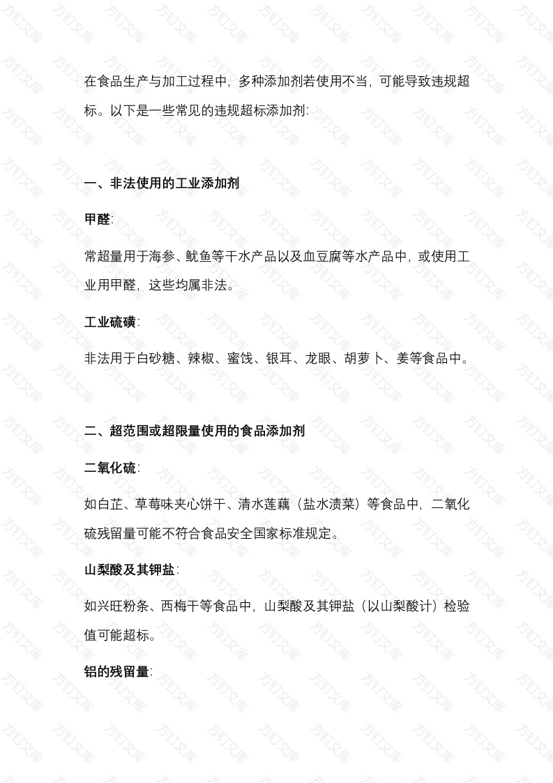 在食品生产与加工过程中,多种添加剂若使用不当,可能导致违规超标。以下是一些常见的违规超标添加剂非法使用的工业添加剂甲醛常超量用于海参、鱿鱼等干水产品以及血豆腐等水产品中,或使用工业用甲醛,这些均属非法。工业硫磺非法用于白砂糖、辣椒、蜜饯、银耳、龙眼、胡萝卜、姜等食品中方超范围或超限量使用的食品添加剂二氧化硫:如白芷、草莓味夹心饼干、清水莲藕(盐水渍菜)等食品中,二氧化硫残留量可能不符合食品安全国家标准规定山梨酸及其钾盐如兴旺粉条、西梅干等食品中,山梨酸及其钾盐(以山梨酸计)检验值可能超标。铝的残留量万万方万如油条、大禾米糍、兴旺粉条等食品中,铝的残留量(干样品,以AI计)可能不符合食品安全国家标准规定胭脂红和柠檬黄如草莓味夹心饼干中,这些色素的检验值可能超标。方黄曲霉毒素B1如油炸花生米(自制)、花生芝麻酱等食品中,黄曲霉毒素B1检验值可能不符合食品安全国家标准规定。大肠菌群数、霉菌数、菌落总数:如燕麦麸皮、坚果八珍糕等食品中,这些微生物指标可能超标。亚硝酸盐如饮用天然泉水中,亚硝酸盐(以NO2-计)检验值可能不符合食品安全国家标准规定。三、农药残留超标咪鲜胺和咪鲜胺锰盐在山药等食品中可能超标,原因可能是菜农对使用农药的安全间隔期不了解从而违规使用或滥用农药。丙环唑方万万万万万万在葱等食品中可能超标,同样可能与农药使用不当有关。噻虫胺在食荚豌豆、芹菜、姜等食品中可能超标,原因可能是菜农对农药安全间隔期不了解。吡虫啉在生姜中可能超标,也与农药使用不当有关。倍硫磷在辣椒中可能超标,原因同样可能是农药使用不当。氯氟氰菊酯和高效氯氟氰菊酯:在葱等食品中可能超标,与果农对农药安全间隔期不了解有关。2,4-滴和2,4-滴钠盐:在柑、橘等食品中可能超标,也与农药使用不当有关。四、其他违规添加剂甜蜜素在发酵面制品等食品中不得使用,但一些生产经营企业为增加产品甜味可能超限量、超范围使用。氯霉素万万万