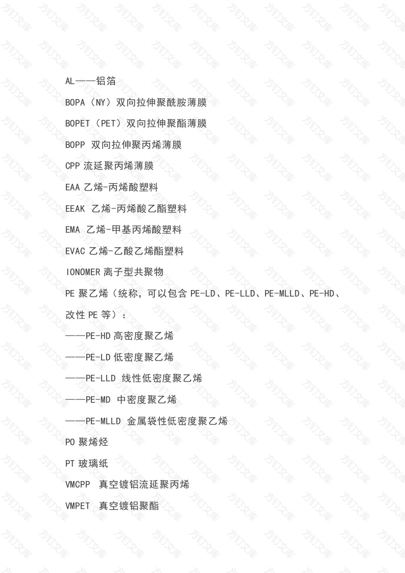 方订铝箔BOPA(NY)双向拉伸聚酰胺薄膜BOPET(PET)双向拉伸聚酯薄膜方BOPP双向拉伸聚丙烯薄膜CPP流延聚丙烯薄膜EAA乙烯-丙烯酸塑料EEAK乙烯-丙烯酸乙酯塑料方订EMA乙烯-甲基丙烯酸塑料EVAC乙烯-乙酸乙烯酯塑料IONOMER离子型共聚物PE聚乙烯(统称,可以包含PE-LD、PE-LLD、PE-MLLD、PE-HD、改性PE等)PE-HD高密度聚乙烯PE-LD低密度聚乙烯PE-LLD线性低密度聚乙烯PE-MD中密度聚乙烯方PE-MLLD金属袋性低密度聚乙烯PT玻璃纸VMCPP真空镀铝流延聚丙烯VMPET真空镀铝聚酯万方万万BOPPOPP)即双向拉伸聚丙烯薄膜,它是一种用聚丙烯作为主要原材料,用平膜法经过双向拉伸而制得的薄膜,它具有拉伸强度高、刚性高、透明度好、光泽度好、低静电性能、优异的印刷性能和涂层附着力、优异的水蒸气和阻隔性能,所以它广泛地用于各类包装行业。PE聚乙烯。是乙烯经聚合制得的一种热塑性树脂。在工业上,包括乙烯与少量ā一烯烃的共聚物。聚乙烯无臭,无毒,手感似蜡,具有优良的耐低温性能(最低使用温度可达-100ˇ-70°C),化学稳定性好,能耐大多数酸碱的侵蚀(不耐具有氧化性质的酸)。常温下不溶于一般溶剂,吸水性小,电绝缘性优良CPP即流延聚丙烯薄膜cast polypropyl ene,也称未拉伸聚丙烯薄膜,按用途不同可分为通用CPp(GeneralCPP,简称GCPP)薄膜、镀铝级cpp(MetalizeCPP,简称MCPP)薄膜和蒸煮级CPP(RetortCPP,简称RCPP)薄膜等。VMPET指的是聚酯镀铝膜。应用于饼干等干燥、膨化食品包装以及一些医药、化妆品的外包装上的保护膜。镀铝膜既有塑料薄膜的特性,又具有金属的特性。薄膜表面镀铝的作用是遮光、防紫外线照射,既延长了内容物的保质期,又提高了薄膜的亮度,从一定程度上代替了铝箔,也具有价廉、美观及较好的阻隔性能,因此,镀铝膜在复合包装中的应用十分广泛,目前主要应用于饼干等干燥、膨化食品包装以及一些医药、化妆品的外包装上。又名耐高温聚酯薄膜。它具有优异的物理性能、化学性能及尺寸稳定性、透明性、可回收性,可广泛的应用于磁记录、感光材料、电子、电气绝缘、工业用膜、包装装饰、屏幕保护、光学级镜面表面保护等领域。耐高温聚酯薄膜型号万FBDW(单面哑黑)FBSW(双面哑黑)万耐高温聚酯薄膜规格厚度宽度卷径卷芯内径38μm250μm5001080mm300mm650mm76mm(3")、152mm(6"注:宽度规格可依据实际需求生产。膜卷常规长度相当于25μm的3000m或6000。PE-LLD线性低密度聚乙烯(LDPE),为无毒、无味、无臭的乳白色颗粒,密度为0.9180.935g/cm3。它与LDPE相比,具有较高的软化温度和熔融温度,有强度大、韧性好、刚性大、耐热、耐寒性好等优点,还具有良好的耐环境应力开裂性,耐冲击强度、耐撕裂强度等性能,并可耐酸、碱、有机溶剂等而广泛用于工业、农业、医药、卫生和日常生活用品等领域。被称为第三代聚乙烯的线性低密度聚乙烯(LDPE)树脂,除具有一般聚烯烃树脂的性能外,其抗张强度、抗撕