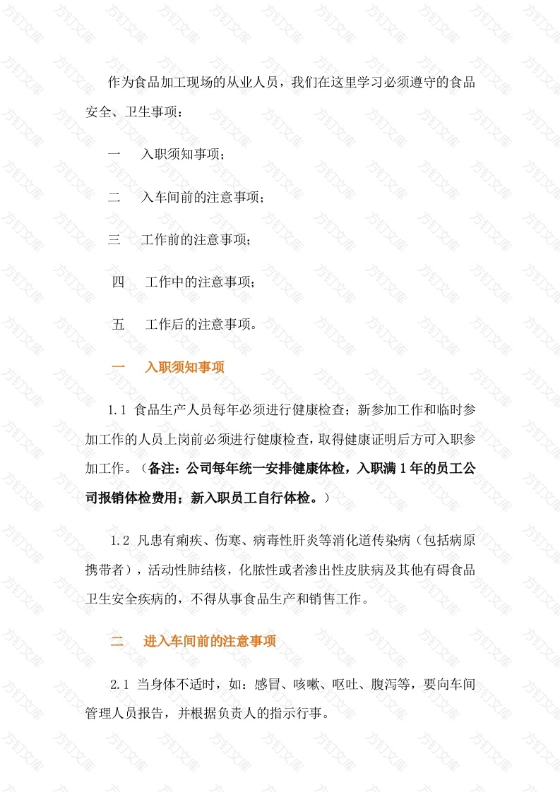 作为食品加工现场的从业人员,我们在这里学习必须遵守的食品安全、卫生事项:入职须知事项;入车间前的注意事项:方丁工作前的注意事项;四工作中的注意事项:工作后的注意事项。万入职须知事项1.1食品生产人员每年必须进行健康检查;新参加工作和临时参加工作的人员上岗前必须进行健康检查,取得健康证明后方可入职参加工作。(备注:公司每年统一安排健康体检,入职满1年的员工公司报销体检费用;新入职员工自行体检。)1.2凡患有痢疾、伤寒、病毒性肝炎等消化道传染病(包括病原携带者),活动性肺结核,化脓性或者渗出性皮肤病及其他有碍食品卫生安全疾病的,不得从事食品生产和销售工作。进入车间前的注意事项2.1当身体不适时,如:感冒、咳嗽、呕吐、腹泻等,要向车间管理人员报告,并根据负责人的指示行事文2.2当手部受伤时要向生产管理人员汇报,并根据实际情况看是否可以继续工作,如要继续工作,需要对受伤部位进行包扎处理后方可继续工作。2.3个人卫生要求:2.3.1要注意个人清洁卫生,勤洗澡、勤理发、勤剪指甲、勤换2.3.2不要把私人物品带入车间,工作时不能佩戴手表、项链戒指、饰针等其他装饰品,不能化妆,喷洒香水,手机、钥匙等私人物品不许带入车间:2.3.3上班前严禁喝酒,在更衣室严禁吸烟,饮食,或做其他有碍食品卫生的活动:2.3.4工作服的穿戴要求:进入车间要穿戴干净的工作服和工作帽:要按指定方法穿戴工作服、工作帽、口罩、工作鞋等;进入车间前要洗手消毒,工作鞋要在脚踏池中浸泡消毒。(工作帽佩戴要求头发不能外露,口罩必须将鼻子遮住,洗手消毒详见附图)2.3.5做好所有准备工作进入车间时,要从风淋通道进入。工作前的注意事项方万万文万万3.1工作前,生产人员要检查所用工器具卫生情况,在对工器具整理清洁后方可进行生产3.2注意环境卫生,确认环境卫生干净后方可进行生产3.3进入车间后因特殊原因不能按时生产需要等待时,员工不能在车间内随意走动串岗,不准在车间内追逐、跑动、嬉闹。文四工作中的注意事项方4.1工作期间离开车间或上厕所时必须换下工作服、帽口罩、工作鞋等,工作服不许穿出车间和更衣室。4.2不准在加工区吸烟、饮食、饮水等,不准随地扔杂物,不准随地吐痰,不准对食品咳嗽、打喷嚏等。4.3工作中,产品、包材、和工器具不能落地。员工捡起落地物品,要送由负责人清洗消毒,本人到洗手点洗手消毒后方可继续工作。4.4工作中人员要注意安全生产,发现有危险时要立即向负责人报告:发现别人从事危险作业时,要及时提醒制止他:对操作不理解的设备不能随便操作;当设备出现异常情况时,要立即停止运转设备并向管理人员汇报。4.5当发现产品有异常情况时要立即停止生产,并向负责人报告。文工作后的注意事项。万文文