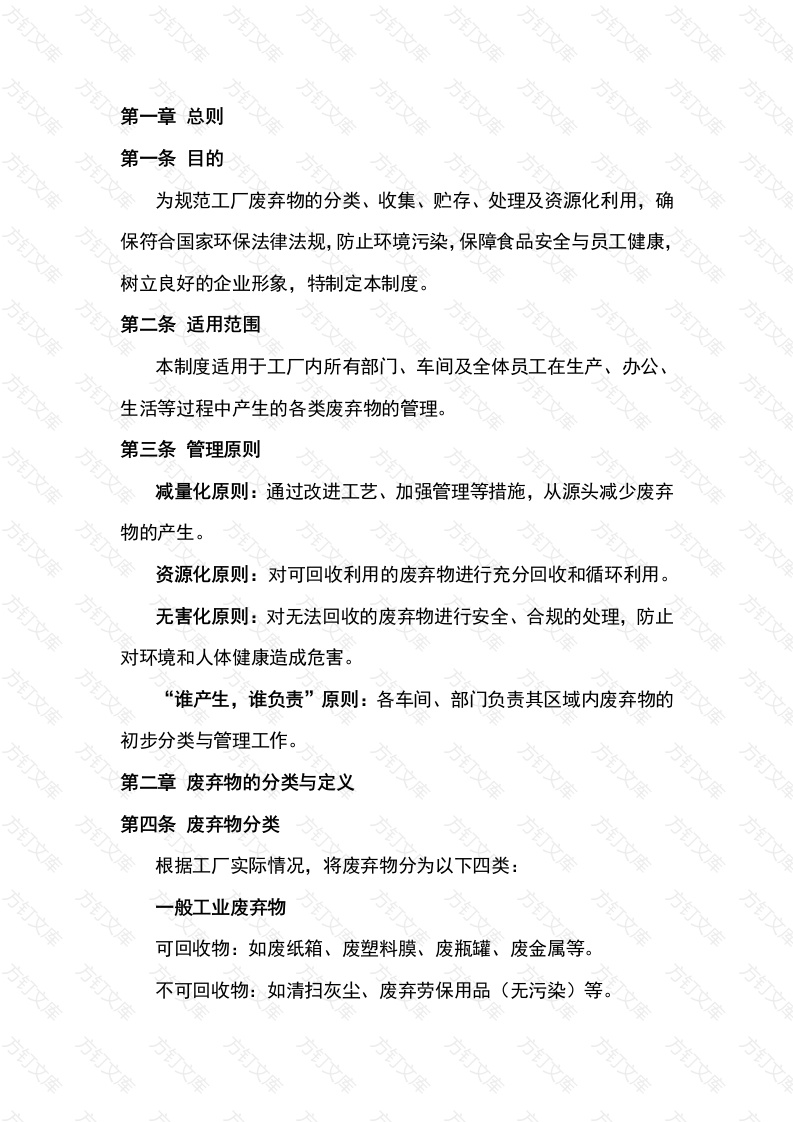 第章总则第一条目的为规范工厂废弃物的分类、收集、贮存、处理及资源化利用,确保符合国家环保法律法规,防止环境污染,保障食品安全与员工健康,树立良好的企业形象,特制定本制度。第二条适用范围文本制度适用于工厂内所有部门、车间及全体员工在生产、生活等过程中产生的各类废弃物的管理。第三条管理原则减量化原则:通过改进工艺、加强管理等措施,从源头减少废弃物的产生。资源化原则:对可回收利用的废弃物进行充分回收和循环利用。无害化原则:对无法回收的废弃物进行安全、合规的处理,防止对环境和人体健康造成危害。“谁产生,谁负责”原则:各车间、部门负责其区域内废弃物的初步分类与管理工作。第二章废弃物的分类与定义第四条废弃物分类根据工厂实际情况,将废弃物分为以下四类:万般工业废弃物可回收物:如废纸箱、废塑料膜、废瓶罐、废金属等。不可回收物:如清扫灰尘、废弃劳保用品(无污染)等食品加工废弃物下脚料:果蔬皮、果核、肉骨、蛋壳等加工过程中产生的非食用部分。不合格品:不符合质量标准但未变质的食品、半成品过期产品:超过保质期的产成品。危险废弃物化学品废弃物:废机油、废润滑油、废清洗剂、废消毒剂瓶、废农药瓶等。实验室废弃物:过期化学试剂、实验废液、沾染化学品的器皿等。含汞废弃物:废荧光灯管、废血压计等。其他:废电池、废油墨盒、废涂料桶等。生活垃圾员工办公、生活中产生的食物残渣、果皮、一次性餐具等万文第三章废弃物的收集与贮存第五条容器设置与标识工厂统一配备分类废弃物容器,并以显著的颜色和文字标识:蓝色:可回收物黑色:不可回收一般废弃物/生活垃圾绿色:食品加工废弃物(可考虑进一步细分用于饲料或堆肥)红色/黄色:危险废弃物所有容器必须保持完好、密闭,防止泄漏和异味散发。第六条分类投放要求文文员工必须严格按照废弃物分类标准,将废弃物投放到对应的容器中,严禁混投食品加工废弃物应沥干水分后投放。危险废弃物必须单独存放于指定危废暂存区,并填写《危险废弃物产生记录表》第七条贮存场所管理废弃物临时贮存场所应设在远离生产车间、办公区和生活区的指定区域。贮存场地必须为硬化地面,具备防雨、防风、防渗、防漏措施危险废弃物暂存区必须严格按照《危险废物贮存污染控制标准》设立,并设置警示标识。废弃物应做到日产日清,特别是食品废弃物,防止腐败、滋生蚊蝇和交叉污染。第四章废弃物的处理与处置第八条处理方式文可回收物:由行政部或指定部门联系合格的再生资源回收公司,进行有偿回收,并记录。食品加工废弃物:优先途径:与有资质的养殖单位或饲料加工厂:签订协议,作为饲料原料。万万万万