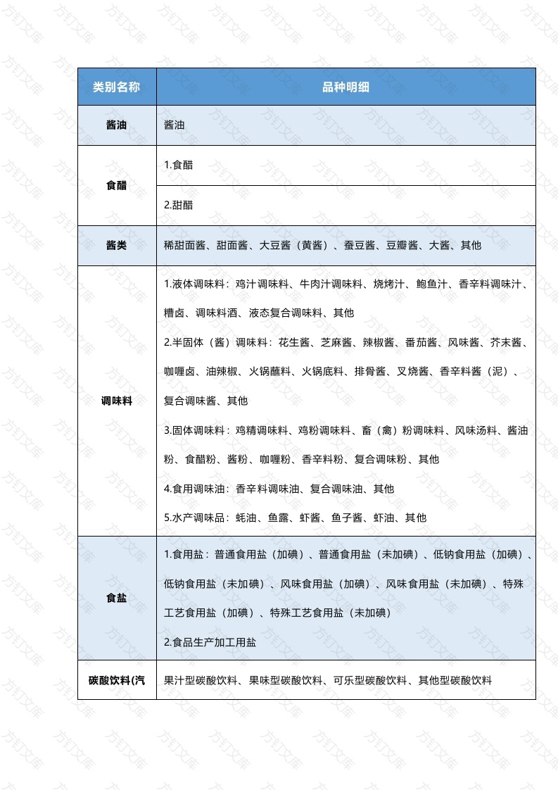 类别名称品种明细酱油酱油1.食醋食醋2.甜醋酱类稀甜面酱、甜面酱、大豆酱(黄酱)、蚕豆酱、豆瓣酱、大酱、其他1液体调味料:鸡汁调味料、牛肉汁调味料、烧烤汁、鲍鱼汁、香辛料调味汁、糟卤、调味料酒、液态复合调味料、其他2半固体(酱)调味料:花生酱、芝麻酱、辣椒酱、番茄酱、风味酱、芥末酱、咖喱卤、油辣椒、火锅蘸料、火锅底料、排骨酱、叉烧酱、香辛料酱(泥)、调味料复合调味酱、其他3固体调味料:鸡精调味料、鸡粉调味料、畜(禽)粉调味料、风味汤料、酱油粉、食醋粉、酱粉、咖喱粉、香辛料粉、复合调味粉、其他4食用调味油:香辛料调味油、复合调味油、其他5水产调味品:蚝油、鱼露、虾酱、鱼子酱、虾油、其他1.食用盐:普通食用盐(加碘)、普通食用盐(未加碘)、低钠食用盐(加碘)低钠食用盐(未加碘)、风味食用盐(加碘)、风味食用盐(未加碘)、特殊食盐工艺食用盐(加碘)、特殊工艺食用盐(未加碘)2.食品生产加工用盐碳酸饮料(汽果汁型碳酸饮料、果味型碳酸饮料、可乐型碳酸饮料、其他型碳酸饮料万万水)方便面1.油炸方便面2.热风干燥方便面3.其他方便面调味面制品调味面制品酥性饼干、韧性饼干、发酵饼干、压缩饼干、曲奇饼干、夹心(注心)饼干、饼干威化饼干、蛋圆饼干、蛋卷、煎饼、装饰饼干、水泡饼干、其他1水果罐头:桃罐头、橘子罐头、菠萝罐头、荔枝罐头、梨罐头、其他果蔬罐头2蔬菜罐头:食用菌罐头、竹笋罐头、莲藕罐头、番茄罐头、豆类罐头、其他其他罐头其他罐头:果仁类罐头、八宝粥罐头、其他1生制品:速冻饺子、速冻包子、速冻汤圆、速冻粽子、速冻面点、速冻其他面速冻面米食品米制品、其他2熟制品:速冻饺子、速冻包子、速冻粽子、速冻其他面米制品、其他膨化食品1.焙烤型2.油炸型3.直接挤压型4.花色型1.干制薯类2.冷冻薯类3.薯泥(酱)类4.薯粉类薯类食品5其他薯类1硬质糖果;2.奶糖糖果;3.夹心糖果;4.酥质糖果5焦香糖果(太妃糖果);6.充气糖果;7凝胶糖果糖果8.胶基糖果;9.压片糖果;10.流质糖果;11.膜片糖果方12花式糖果;13.其他糖果万万万巧克力及巧克1.巧克力方方力制品2.巧克力制品代可可脂巧克1.代可可脂巧克力力及代可可脂万文方订2代可可脂巧克力制品方巧克力制品1绿茶:龙井茶、珠茶、黄山毛峰、都匀毛尖、其他2红茶:祁门工夫红茶、小种红茶、红碎茶、其他3.乌龙茶:铁观音茶、武夷岩茶、凤凰单枞茶、其他4白茶:白毫银针茶、白牡丹茶、贡眉茶、其他5黄茶:蒙顶黄芽茶、霍山黄芽茶、君山银针茶、其他茶叶6黑茶:普洱茶(熟茶)散茶、六堡茶散茶、其他方订7花茶:茉莉花茶、珠兰花茶、桂花茶、其他8袋泡茶:绿茶袋泡茶、红茶袋泡茶、花茶袋泡茶、其他9紧压茶:普洱茶(生茶)紧压茶、普洱茶(熟茶)紧压茶、六堡茶紧压茶、白茶紧压茶、花砖茶、黑砖茶、茯砖茶、康砖茶、沱茶、紧茶、金尖茶、米砖茶青砖茶、其他紧压茶1茶粉:绿茶粉、红茶粉、其他2固态速溶茶:速溶红茶、速溶绿茶、其他茶制品3茶浓缩液:红茶浓缩液、绿茶浓缩液、其他万文4茶膏:普洱茶膏、黑茶膏、其他5调味茶制品:调味茶粉、调味速溶茶、调味茶浓缩液、调味茶膏、其他万万万