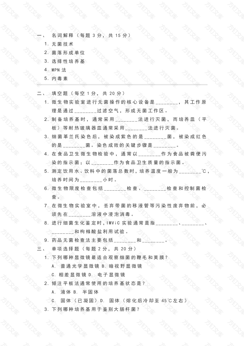 名词解释(每题3分,共15分万无菌技术2.菌落形成单位3.选择性培养基4.MPN法5.内毒素文填空题(每空1分,共20分)1微生物实验室进行无菌操作的核心设备是其工作原理是通过过滤空气,形成无菌工作区2.制备培养基时,通常采用法进行灭菌,而培养皿板)等耐热玻璃器皿通常采用法进行灭菌。3细菌革兰氏染色后,被染成紫色的是被染成红色的是菌。染色成败的关键步骤是在食品卫生微生物检验中,通常以作为食品被粪便污染的指示菌;作为食品卫生质量的指示菌。5测定饮用水、饮料中的菌落总数时,培养温度一般为培养时间为小时6.微生物限度检查包括检查检查和控制菌检查在微生物实验室中,丢弃带菌的移液管等污染性废弃物前,必须先在溶液中浸泡消毒进行细菌生化鉴定时,IMViC实验通常是指和枸橼酸盐利用试验。9.药品无菌检查法主要包括和单项选择题(每题2分,共20分)1下列哪种显微镜最适合观察细菌的鞭毛和荚膜?A.普通光学显微镜B.暗视野显微镜C.相差显微镜D.电子显微镜倾注平板法通常使用的培养基状态是?万文A.液体B.半固体C.固体(已凝固)D.固体(熔化后冷却至45℃左右下列哪种培养基用于鉴别大肠杆菌?A营养肉汤文B伊红美蓝琼脂培养基C.沙氏葡萄糖琼脂培养基D.硫乙醇酸盐流体培养基万4.关于高压蒸汽灭菌锅的操作,下列说法错误的是?A.灭菌前必须将锅内的冷空气排尽B.灭菌结束后,应自然降压降温至零后再开盖C.物品不应装得太满,要留有空隙D.可用于所有培养基和试剂的灭菌5在药品的无菌检查中,用于验证检验方法可靠性的实验是?A.阳性对照试验B,阴性对照试验C.方法适用性试验D.平行试验6.金黄色葡萄球菌在Baird--Parker平板上典型的菌落形态是?A.心粉红色菌落B.黑色菌落、周围有黄色晕圈C.黑色菌落、周围有透明圈和浑浊带D.绿色菌落霉菌和酵母菌计数的适宜培养温度是?A.20-25CB.30-35℃C.36±1℃D.42C8.用于检测样品中是否存在特定细菌毒素的试验是?A.凝集试验B.PCR试验C.动物毒力试验D.药敏试验9.下列哪项不属于微生物快速检测技术?A.酶联免疫吸附测定B.实时荧光定量PCRC.传统平板计数法D.基因芯片技术10.实验室生物安全级别中,BSL-2实验室适用于处理哪类微生物?A.对健康成年人无致病作用的微生物B.能引起人类或动物疾病,但一般情况下对人、动物或环境不构成严重危害的病原体C.能引起人类或动物严重疾病的高致病性病原体D.能引起人类或动物非常严重疾病的病原体简答题(每题5分,共25分)1.简述进行样品稀释时,为何通常按1:10进行系列稀释?制备1:10的样品稀释液时,如何操作?简述倾注平板法和涂布平板法的异同点及各自适用场景。3.什么是“菌落总数”?它在食品卫生学上的意义是什么?简述大肠菌群的定义及其作为食品卫生指示菌的意义。5.微生物实验室质量控制包括哪些主要内容?五论述与应用题(每题10分,共20分)案例分析:某品牌瓶装矿泉水被投诉有异味,现需对其进行全面的微生物学检测。(1)请设计一套检测方案,列出需要检测的项目及理由。6分)(2)如果在检测中发现菌落总数严重超标,请分析可能的生产环节污染原因。(4分)2.综合论述:请比较传统微生物培养法与现代分子生物学快速检测技术(如qPCR)在微生物检测中的优缺点。你认为未来微生物检测技术的发展趋势是什么?参考答案名词解释无菌技术:指在操作过程中,防止一切微生物进入机体或物体的方法。是所有微生物检测的基础。菌落形成单位:是由一个或几个微生物在固体培养基上生长繁殖而形成的肉眼可见的集落,用以表达活菌的数量。选择性培养基:在培养基中加入某种化学物质,以抑制非目的菌的生长,促进目的菌生长的培养基。4.MPN法(最可能数法):一种基于泊松分布的统计方法,用于估算样品中活菌的浓度,特别适用于检测在培养基中不能形成菌落但能引起培养基变化的微生物(如大肠菌群)内毒素:是革兰氏阴性菌细胞壁外壁层的脂多糖成分,只有在菌体死亡裂解后才释放出来,可引起机体发热等反应填空题超净工作台,高效空气过滤器2.高压蒸汽灭菌,干热灭菌3.革兰氏阳性,革兰氏阴性,脱色耐热大肠菌群(或大肠埃希氏菌),菌落总数5.36±1,48±2万万万