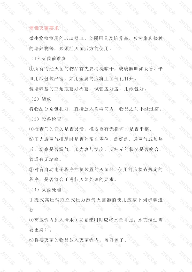 消毒灭菌要求微生物检测用的玻璃器皿、金属用具及培养基、被污染和接种的培养物等,必须经灭菌后方能使用。(1)灭菌前准备①所有需经灭菌的物品首先要清洗晾干,玻璃器皿如吸管、平皿用纸包装严密,如用金属筒应将上面气孔打开。装培养基的三角瓶塞好棉塞,试管盖好盖,用纸包好(2)装放将物品分别包扎好,直接放入消毒筒内,物品之间不能过挤。3)设备检查①检查门的开关是否灵活,橡皮圈有无损坏,是否平整②压力表蒸气排尽时是否停留在零位,盖好盖,通蒸气或加热后,观察是否漏气,压力表与温度计所标示的状况是否吻合,管道有无堵塞。③对有自动电子程序控制装置的灭菌器,使用前应检查规定的程序,是否符合于进行灭菌处理的要求。4)灭菌处理手提式高压锅或立式压力蒸气灭菌器的使用应按下列步骤进①高压锅内加入清水(重复使用时应将水量补足,水变混浊需要更换)②将要灭菌的物品放入灭菌锅内,盖好盖子。文文接通电源,加热,水沸腾后打开放气阀排气,直到压力表指针降到0.05Mpa时,关掉放气阀。指针指到121℃时开始计时,达到要求的灭菌时间关掉开关,冷却直到压力降到0.05Mpa即可通过放气阀缓慢放气。(5)灭菌温度与时间①不同类型培养基的灭菌温度与时间的关系见下表:高压灭菌温度与时间表灭菌时间,min品115℃121℃不含糖等耐热培养基15含糖类等耐热培养基1520染菌培养物30器械器皿30②灭菌处理:灭菌后物品,按正常情况己属无菌,从灭菌器中取出应仔细检查,以免再度污染。物品取出,随即检查包装的完整性,若有破环或棉塞脱掉,可作为无菌物品使用。取出的物品,如外包装有明显的水浸者,不可作为无菌物品使方万培养基或试剂等,应检查是否符合达到灭菌后的色泽或状态,未达到者应废弃。取出的物品掉落在地或误放不洁之处,或沾有水液,均视为受到污染,不可作为无菌物品使用。取出的合格灭菌物品,应存放于贮藏室或防尘柜内,严禁与未灭菌物品混放。凡属合格物品,应标有灭菌日期及有效期限。每批灭菌处理完成后,记录灭菌品名、数量、温度、时间、操作者。6)有毒有菌污物处理要求微生物实验室所用实验器材、培养物等未经消毒处理,律不得带出实验室。经培养的污染材料及废弃物应放在严密的容器或铁丝筐内,并集中存放在指定地点,待统一进行高压灭菌。经微生物污染的培养物,必须经121℃,30min高压灭菌。染菌后的吸管,使用后放入5%煤酚皂溶液或石炭酸溶液中,最少浸泡24小时,再经121℃,30min高压灭菌。涂片染色冲洗片的液体,一般可直接冲入下水道,放入5%煤酚皂液中浸泡24h后,煮沸洗涤。打碎的培养物,立即用5%煤酚皂液或石炭酸喷洒和浸泡被污染部位,浸泡半小时后再擦拭干净。7)玻璃器皿的清洗要求