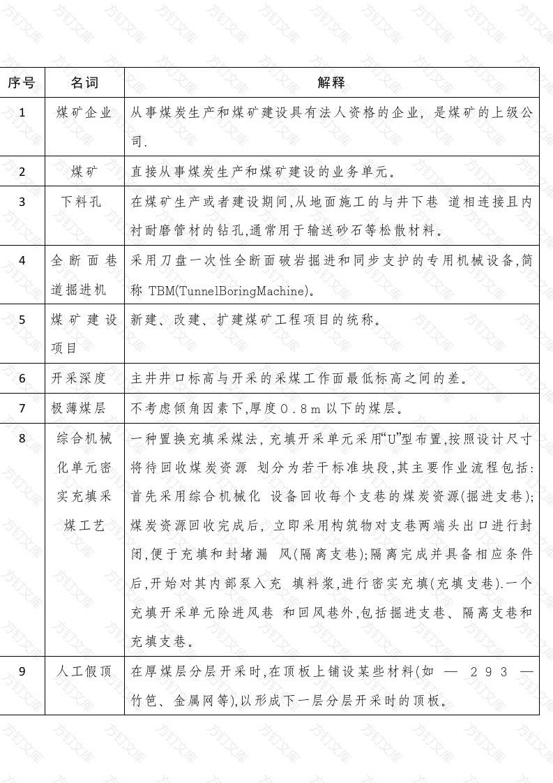 序号名词解释1煤矿企业从事煤炭生产和煤矿建设具有法人资格的企业,是煤矿的上级公司煤矿直接从事煤炭生产和煤矿建设的业务单元。3下料孔在煤矿生产或者建设期间,从地面施工的与井下巷道相连接且内衬耐磨管材的钻孔,通常用于输送砂石等松散材料。全断面巷采用刀盘一次性全断面破岩掘进和同步支护的专用机械设备,简道掘进机TBM(TunnelBoringMachine).5煤矿建设新建、改建、扩建煤矿工程项目的统称。项目6开采深度主井井口标高与开采的采煤工作面最低标高之间的差。极薄煤层不考虑倾角因素下,厚度0.8m以下的煤层。8综合机械种置换充填采煤法,充填开采单元采用“U”型布置,按照设计尺寸化单元密将待回收煤炭资源划分为若干标准块段,其主要作业流程包括:实充填采首先采用综合机械化设备回收每个支巷的煤炭资源(掘进支巷):煤工艺◇煤炭资源回收完成后,立即采用构筑物对支巷两端头出口进行封闭,便于充填和封堵漏风(隔离支巷):隔离完成并具备相应条件后,开始对其内部泵入充填料浆,进行密实充填(充填支巷).一个充填开采单元除进风巷和回风巷外,包括掘进支巷、隔离支巷和充填支巷。9人工假顶在厚煤层分层开采时,在顶板上铺设某些材料(如竹笆、金属网等),以形成下一层分层开采时的顶板。文10沿空留巷沿空留巷采用一定的技术手段将上一区段的顺槽重新支护留给下一个区段使用,其做法是沿着采空区边缘施工人工构筑物隔离采空区,并对顶板进行支护,将原顺槽原位保留下来。11沿空掘巷完全沿采空区边缘或者小煤柱掘进,把巷道布置在位于靠煤柱一侧的低应力场,便于巷道维护,减少变形量。12倾斜巷道倾斜巷道(斜巷)井工开采时,整体倾角超过8°的巷道。(斜巷)13分区通风分区通风每个生产水平、每个生产采(盘)区的回风直接进入总回风巷或者回风井的通风方式。14风吹一风吹在巷道排放瓦斯或者恢复通风过程中,没有采取可靠的控制风量排放瓦斯的措施,造成排出瓦斯与全风压风流混合处的甲烷或者二氧化碳浓度超过规定值的排放方法。15井巷揭煤井巷揭煤立井、斜井、平硐、石门自底(顶)板岩柱穿过煤层进入顶(底)板的全部作业过程。16突出预兆突出预兆煤与瓦斯突出发生前出现的异常现象。分为有声突出预兆(如劈裂声、闷雷声、煤炮声等)和无声突出预兆(如顶板压力增大、煤层层理紊乱、煤壁被挤出、煤壁温度明显降低、煤壁挂汗、喷孔、顶钻、卡钻、瓦斯涌出忽大忽小等)两类。17采动应力采动应力叠加区域煤矿井下受两个以上采、掘工作面影响而形成叠加区域的合成应力影响区域,其影响因素主要包括主应力角度、断层间距大小、煤柱的稳定性等。18水力挤出水力挤出(挤压)在采掘工作面施工孔深一般不大于15m的钻孔文(挤压)并封孔,向孔内注入高压水使煤体挤压开裂并向外移动,以释放瓦斯、卸除应力为目的的局部防突措施。19应力集中应力集中区应力在一定范围内明显增高的区域。区20冲击地压冲击地压预卸压经评价具有冲击地压危险的区域,在监测未达到预卸压预警临界值前实施的预防性卸压措施。21“掏根”式开“掏根”式开采违反采矿设计提高露天煤矿边帮最终边坡角,不留采保安平盘或者提高单台阶坡面角进行并段开采的采煤方法。22重点边坡重点边坡上下有重要建(构)筑物及人员、设备的边坡。23危险边坡危险边坡滑坡危险性鉴定中稳定系数不满足安全储备系数的边坡。24复合边坡复合边坡由外排土场边坡和采场边坡、内排土场边坡和采场边坡内排土场边坡和外排土场边坡以及采场边坡组成的边坡。25外委剥离外委剥离工程承包单位由煤矿企业或者煤矿委托开展露天煤矿坑工程承包下土岩等剥离物采装、运输、排弃的单位。单位26本质安全电气设备的一种防爆型式,将设备内部和暴露于爆炸性环境的连型设备接导线可能产生的电火花或者热效应能量限制在不能产生点燃的水平。