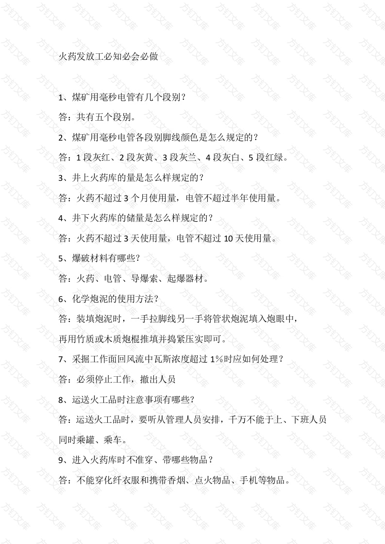 火药发放工必知必会必做1、煤矿用毫秒电管有几个段别?答:共有五个段别。2、煤刊矿用毫秒电管各段别脚线颜色是怎么规定的?答:1段灰红、2段灰黄、3段灰兰、4段灰白、5段红绿。3、井上火药库的量是怎么样规定的?答:火药不超过3个月使用量,电管不超过半年使用量。4、井下火药库的储量是怎么样规定的?答:火药不超过3天使用量,电管不超过10天使用量。万5、爆破材料有哪些?答:火药、电管、导爆索、起爆器材方订6、化学炮泥的使用方法?答:装填炮泥时,一手拉脚线另一手将管状炮泥填入炮眼中,再用竹质或木质炮棍推填并捣紧压实即可。7、采掘工作面回风流中瓦斯浓度超过1%时应如何处理?答:必须停止工作,撤出人员8、运送火工品时注意事项有哪些?答:运送火工品时,要听从管理人员安排,千万不能于上、下班人员同时乘罐、乘车9、进入火药库时不准穿、带哪些物品?答:不能穿化纤衣服和携带香烟、点火物品、手机等物品。万10、采掘工作面及其他作业地点风流中、电动机或其开关安设地点附近20米以内瓦斯浓度达到1.5%时应如何处理?答:必须停止工作,切断电源,撤出人员,进行处理。11、运输火工品不许使用哪些车辆?文答:翻斗车、自卸车、拖车、拖拉机、机动三轮车、人力三轮车、自行车和摩托车。12、发放火工品时应遵守什么原则?答:应按出厂时间和有效期的先后顺序发放。13、爆破材料销毁有哪几种方法?答1、爆炸法:2、梦烧法;3水解法14、乳化炸药的保质期为多少天?方订答:120天。15、乳化炸药有哪几种成分组成?答:方1)氧化剂盐水溶液:2)3)4)乳化剂。16、爆破器材管理工禁作内容:答严禁超储爆破器材:万方万万万严禁其他人员进入爆破器材库;3)严禁脱岗。17、爆破器材管理工危险源:答:蹬、跳车:方订1)扒、2)顶板破碎;万3)火灾;4)火工品混放;5)矿灯带入库房内:6)电缆漏电或照明灯不合格万18、为什么不能随意支风门或撞风门?答:人员和车辆通过风门时,不能把两道风门同时打开。支风门或风门损坏易打乱风流,造成漏风和瓦斯积聚引起事故。文19、临时停风地点有何规定?1)断电撤人:2)在开门口设栅栏警标,严禁人员进入。20、瓦斯爆炸的条件有哪些?(1)瓦斯浓度5-16%:2)引爆火源温度650-750℃:空气中氧气浓度大于等于12%。万万