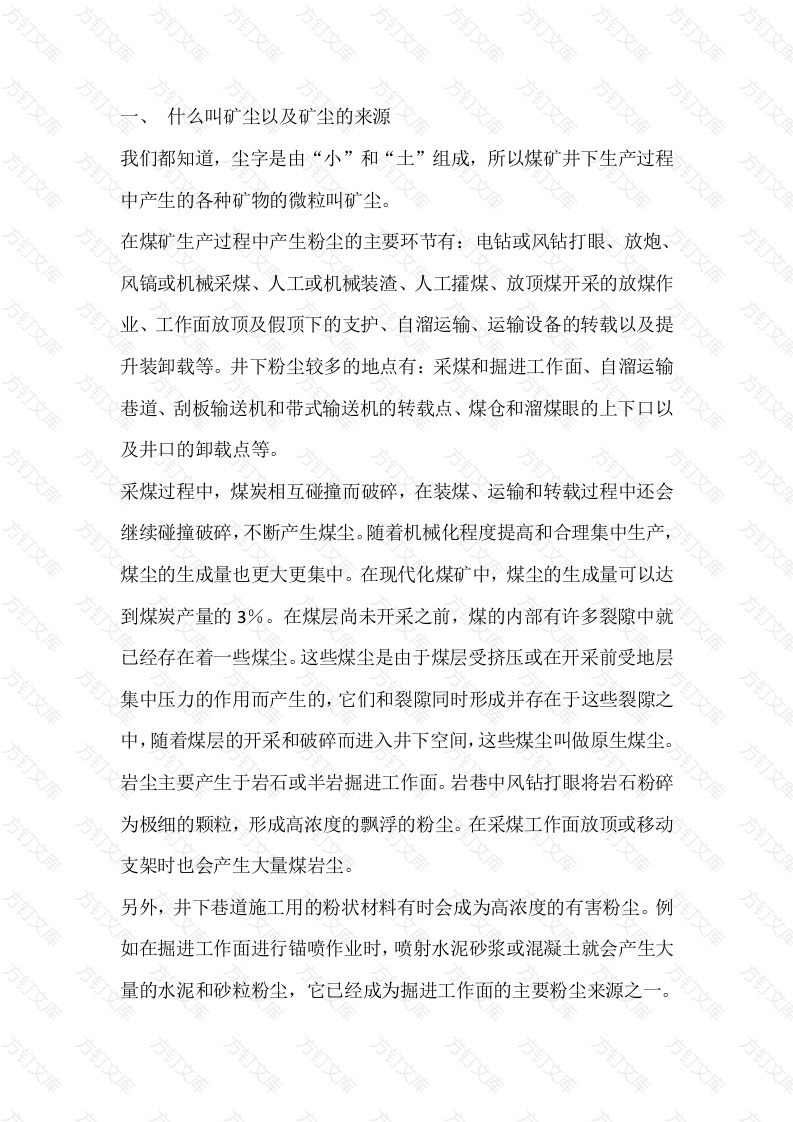 什么叫矿尘以及矿尘的来源我们都知道,尘字是由“小”和“土”组成,所以煤矿井下生产过程中产生的各种矿物的微粒叫矿尘。在煤矿生产过程中产生粉尘的主要环节有:电钻或风钻打眼、放炮、风镐或机械采煤、人工或机械装渣、人工攉煤、放顶煤开采的放煤作业、工作面放顶及假顶下的支护、自溜运输、运输设备的转载以及提升装卸载等。井下粉尘较多的地点有:采煤和掘进工作面、自溜运输巷道、刮板输送机和带式输送机的转载点、煤仓和溜煤眼的上下口以及井口的卸载点等。采煤过程中,煤炭相互碰撞而破碎,在装煤、运输和转载过程中还会继续碰撞破碎,不断产生煤尘。随着机械化程度提高和合理集中生产,煤尘的生成量也更大更集中。在现代化煤矿中,煤尘的生成量可以达到煤炭产量的3%。在煤层尚未开采之前,煤的内部有许多裂隙中就己经存在着一些煤尘。这些煤尘是由于煤层受挤压或在开采前受地层集中压力的作用而产生的,它们和裂隙同时形成并存在于这些裂隙之中,随着煤层的开采和破碎而进入井下空间,这些煤尘叫做原生煤尘。岩尘主要产生于岩石或半岩掘进工作面。岩巷中风钻打眼将岩石粉碎为极细的颗粒,形成高浓度的飘浮的粉尘。在采煤工作面放顶或移动支架时也会产生大量煤岩尘。另外,井下巷道施工用的粉状材料有时会成为高浓度的有害粉尘。例如在掘进工作面进行锚喷作业时,喷射水泥砂浆或混凝土就会产生大量的水泥和砂粒粉尘,它己经成为掘进工作面的主要粉尘来源之一煤矿粉尘的危害煤矿粉尘的危害主要是,能造成矿工尘肺病:发生煤尘爆炸或瓦斯煤尘爆炸:影响作业安全和危害矿区生态平衡。(一)、造成矿工尘肺病万1、患病煤矿尘肺病已成为严重危及我国煤矿职工生命安全与健康的“瘟疫”2、发病原因和影响因素(1)发病原因主要有两方面:1)煤岩中的二氧化硅能使人的肺部纤维化而失去收缩扩张的功能:2)煤尘堆积漂浮也是造成尘肺病的主要原因。(2)发病影响因素1)煤尘的成份:漂浮的煤尘含有的二氧化硅越多,发病危险性越大:2)分散度:各种直径的粉尘占总粉尘的百分比的多少叫分散度。呼吸性粉尘越多,发病危险性越大:00.5微米可被人吸入后又呼出体外,危害不大:25微米的粉尘是能进入人的肺细泡的主要粉尘,并绝大部分能停留在肺细泡中造成尘肺病:3)粉尘浓度:工作环境粉尘浓度越高,4)接触粉尘时间:在有粉尘场所工作时间越长,越容易发病:5)其它:如身体状况、环境因素等3、尘肺病严重程度及主要症状根据尘肺病严重程度一般分为1期、2期、3期,数字越大,病情越人的肺部主要由吞噬细胞组成,而二氧化硅进入肺部能使吞噬细胞中毒死亡,吞噬细胞中毒死亡的越多,肺的纤维网孔越小,3期矽肺变为浅灰色,呼吸浅而短,基本丧失行走能力。4、我们对尘肺病的预防一般应注意以下方面:(1)加强个体防护,尽量使粉尘不要或少量吸入肺部:(2)在地面多加强体育锻炼,增强肺部健康:平时饮食要多食用肉、蛋、奶、血块、动物油、蜂蜜类食物,多吃纤维长蔬菜:方(4)平时尽量不吸或少吸烟,减少肺部疾病。(二)煤尘爆炸1、瓦斯煤尘爆炸事故的严重性瓦斯煤尘爆炸事故是对煤矿安全生产威肋最大、最为突出的事故。2、煤尘爆炸的条件煤尘爆炸是煤矿主要自然灾害之一。同时具备以下三个条件就可以发生煤尘爆炸:(1)煤尘本身具有爆炸性。煤尘是否具有爆炸性,应当在井下采取煤样,送国家规定的鉴定单位进行煤尘爆炸性鉴定后确定。一般来说各类煤炭多数都有爆炸性。一般认为煤的挥发分越高,煤尘的爆炸性就越强。据爆炸性鉴定结果统计,我国90%以上的煤矿均有煤尘爆炸危险。煤尘发生爆炸时,粒径为1毫米及更小的煤尘颗粒都能参与爆炸,但爆炸的主体是粒径小于0.75毫米(75微米)的煤尘飘浮煤尘达到一定的浓度。煤尘能够发生爆炸的最低或最高浓
