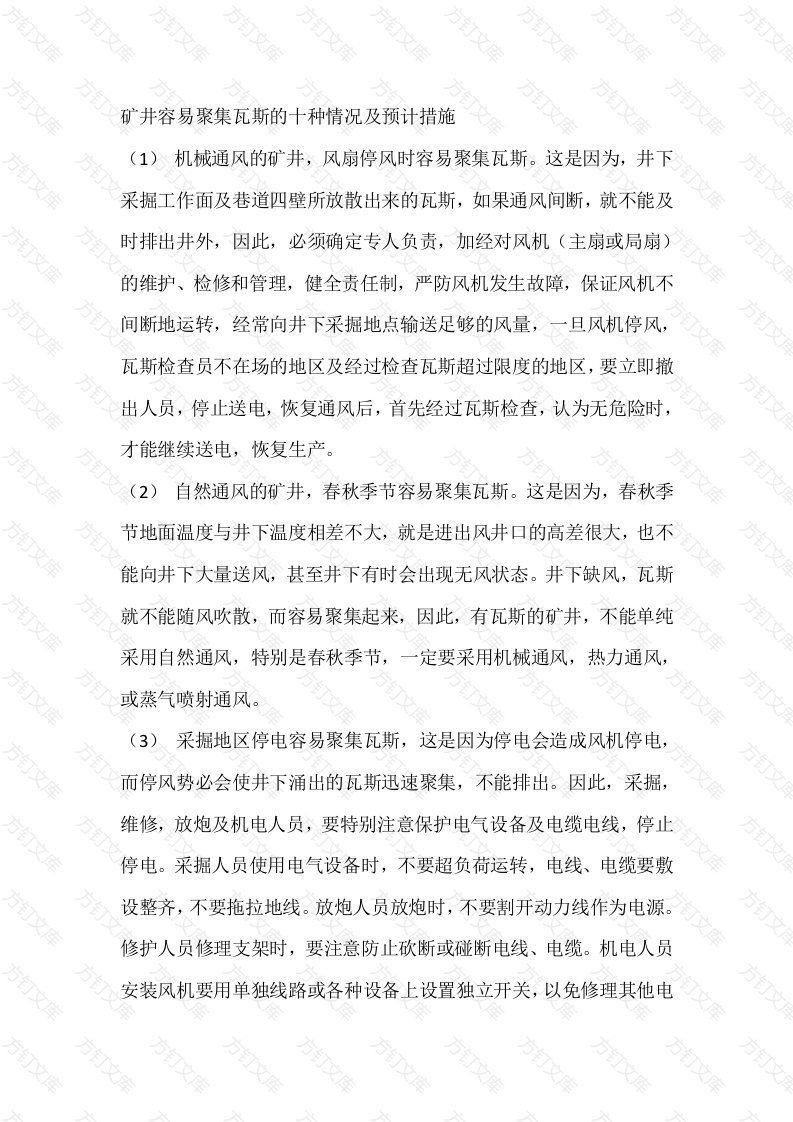矿井容易聚集瓦斯的十种情况及预计措施(1)机械通风的矿井,风扇停风时容易聚集瓦斯。这是因为,井下采掘工作面及巷道四壁所放散出来的瓦斯,如果通风间断,就不能及时排出井外,因此,必须确定专人负责,加经对风机(主扇或局扇)的维护、检修和管理,健全责任制,严防风机发生故障,保证风机不间断地运转,经常向井下采掘地点输送足够的风量,一旦风机停风,瓦斯检查员不在场的地区及经过检查瓦斯超过限度的地区,要立即撤出人员,停止送电,恢复通风后,首先经过瓦斯检查,认为无危险时,才能继续送电,恢复生产。2)自然通风的矿井,春秋季节容易聚集瓦斯。这是因为,春秋季节地面温度与井下温度相差不大,就是进出风井口的高差很大,也不能向井下大量送风,甚至井下有时会出现无风状态。井下缺风,瓦斯就不能随风吹散,而容易聚集起来,因此,有瓦斯的矿井,不能单纯采用自然通风,特别是春秋季节,一定要采用机械通风,热力通风,或蒸气喷射通风。(3)采掘地区停电容易聚集瓦斯,这是因为停电会造成风机停电,而停风势必会使井下涌出的瓦斯迅速聚集,不能排出。因此,采掘,维修,放炮及机电人员,要特别注意保护电气设备及电缆电线,停止停电。采掘人员使用电气设备时,不要超负荷运转,电线、电缆要敷设整齐,不要拖拉地线。放炮人员放炮时,不要割开动力线作为电源。修护人员修理支架时,要注意防止砍断或碰断电线、电缆。机电人员安装风机要用单独线路或各种设备上设置独立开关,以免修理其他电气设备时停止风扇运转。认真采取这些措施,就会即可防止停电、停风,避免瓦斯聚集,又可防止电气线路和设备放炮,引起瓦斯燃烧爆炸(4)停止工作后不通风的掘进巷道及未充填的废洞,容易聚集瓦斯。这也是因为巷道放散瓦斯是不停止的,不通风就必然要聚集。因此,暂时停止工作的巷道,仍要继续通风:长期停止工作不能继续通风和废弃的巷道,要立即密闭或充填起来。打开充满瓦斯的巷道密闭,恢复通风,恢复工作时,决不能不加控制地将风筒送入巷道内部吹风。因为这样可能将大量瓦斯吹出来,与新风混合,达到爆炸限度,遇有引燃火源发生爆炸。因此,这巷道内排放瓦斯时,绝不能草率从事,必须采取专门的措施,指派专人或由通风区,救护队负责,逐步地有控制地进行排放。独头上山中途停止工作的现象,应严格禁止。在接通独头上山时非常危险,应事先打眼探放瓦斯。(5)掘进穿透不通风的老窿、老巷及接近封闭断层时容易聚集瓦斯。这是因为不通风的老窿、老巷及封闭断层聚集有大量的瓦斯,一旦掘穿,瓦斯会突然涌出发生事故,所以在即将掘透前,要首先通知通风机电部门,制定排放瓦斯的专门措施,做好通风及杜绝各种火源的准备工作后,再进行排放。如有条件,通过原有的老窿、老巷将瓦斯排出去最好,无法进入的老窿、老洞,必须从掘进巷道中进行排放时,定要采取先进后放、逐渐扩大排放洞口的措施,有控制地排放。无论从老窿,老洞排放,还是从掘进巷道排放,如果无把握将回风流中的瓦斯含量控制在安全限度,那么,在排放瓦斯回流中,必须切断电V撤退人员6)独头回采及长距离的巷道掘进容易聚集瓦斯。因为,独头回采没有回风巷,靠局扇通风,常因机电故障或接脱风筒等原因中断通风。在中断通风时,压缩在老塘里的瓦斯必然会向回采地点聚集。同时独巷道越远,局扇距离越长,风量越小,不能与巷道越远瓦斯涌出量越大的情况相适应。因此,长距离独巷巷回风流中的瓦斯含量较大,特别是在局扇停风,气压突然下降时,压缩在煤壁及顶底板裂缝里的瓦斯会迅速向巷道内聚集。为防止工作面瓦斯聚集,应该消灭独头回采,利用有进风,有回风的全风压通风。防止煤巷、独巷太长,要按照局扇的通风能力和矿井的瓦斯等级适当的规定通风横贯的距离。一级瓦斯矿井一般不应超过30米,三级瓦斯矿井不应超过30米。现有的独巷过长的掘进巷道,除及时加开通风横贯外,还要特别注意全巷道的瓦斯检查,发现瓦斯聚集地点,要立即进行处理。(7)放炮采煤的地点容易聚集瓦斯,也容易发生瓦斯爆炸事故。这是因为放炮崩落大量的煤炭,暴露出大面积的新的煤壁及顶底板,它们会放出大量的瓦斯;同时在放炮时及放炮前后爆炸火源较多,电钻,电缆可能放火,放炮器可能放火,炸药爆炸时也可能放火。因此在放炮前后要认真检查瓦斯,使用确定安全可靠的电缆、电钻及放炮工具,并且要严格禁止一次装药,分次放炮,或用延性雷管放炮,以防发生火花,引起瓦斯爆炸。8)气压下降时容易聚集瓦斯,这是因为气压下降后压缩在老塘及煤缝里的瓦斯突然涌出,因此,发现气压下降时,要立即检查气压下