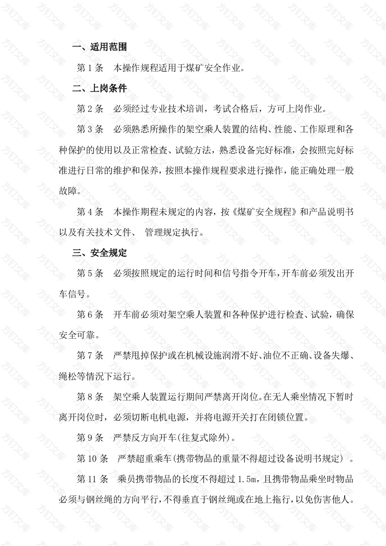 适用范围万第1条本操作规程适用于煤刊矿安全作业。二上岗条件第2条必须经过专业技术培训,考试合格后,方可上岗作业。第3条必须熟悉所操作的架空乘人装置的结构、性能、工作原理和各种保护的使用以及正常检查、试验方法,熟悉设备完好标准,会按照完好标准进行日常的维护和保养,按照本操作规程要求进行操作,能正确处理一般故障。第4条本操作期程未规定的内容,按《煤矿安全规程》和产品说明书以及有关技术文件、管理规定执行。三、安全规定第5条必须按照规定的运行时间和信号指令开车,开车前必须发出开车信号。第6条开车前必须对架空乘人装置和各种保护进行检查、试验,确保安全可靠。第7条严禁甩掉保护或在机械设施润滑不好、油位不正确、设备失爆绳松等情况下运行。第8条架空乘人装置运行期间严禁离开岗位。在无人乘坐情况下暂时离开岗位时,必须切断电机电源,并将电源开关打在闭锁位置。第9条严禁反方向开车(往复式除外)。第10条严禁超重乘车(携带物品的重量不得超过设备说明书规定)第11条乘员携带物品的长度不得超过1.5m,且携带物品乘坐时物品必须与钢丝绳的方向平行,不得垂直于钢丝绳或在地上拖行,以免伤害他人第12条严禁反向或斜向等不正确姿势乘坐(正确乘坐姿势是面向运行方向坐在座椅上,手抓紧扶手,脚踏在脚踏上)。第13条人员上下时不得拥挤或争抢,要遵守管理制度和服从有关人员的管理。第14条严禁携带易燃、易爆物品的人员与其他人员同时乘坐第15無严禁用手抓钢丝绳或托绳轮。文第16条存在影响安全行车的隐患时不得开车。第17条上下人员的地点必须有醒目的标志。第18条认真执行岗位责任制和交接班制度四、操作准备第19条接班司机必须向交班司机详细询问架空乘人装置的运行情况及存在同题,并对架空乘人装置认真进行如下检查:1.保护是否灵敏可靠。万文2.钢些绳断丝是否超过规定3.机械运转是否灵活,各润滑点相滑效果是否正常。4.制动装置、连接装置、张紧装置是否可靠。5.信号、通讯是否畅通。第20条按规定对齿轮或减速箱等调滑点加注合格的润滑油,且油位符合规定。五、正常操作第21条接正常順序接通电源,试验电气保护、制动装置是否可靠。第22条接到开车信号,先鸣笛(或警铃)警示,确认无误后,再按启动按钮。第23条架空乘人装置启动运行后,先空转一方可乘人,应尽量避免带人启动。第24条架空乘人车运行期间,如果显示屏先是保护装置动作,司机应该到该保护装置区域进行查看,恢复后开车。六、特殊操作第25条发现显示屏显示保护装置动作警报响起。例如急停保护装置,该保护动作后,在显示屏右上角显示动作区域。第26条按下故障复位按钮,如果警报再次响起,按照显示屏显示区域进行查看复位:如果警报不响,显示屏显示正常,按照启动顺序,启动索道。七、操作中注意事项第27条乘坐人须知1.必须遵守安全规程,服从调度和值班人员的指挥,不得擅自启动架空乘人装置运行。2.听到打点和喊话以及开车预警铃声后,架空乘人装置即将启动运行,请做好乘坐准备。3.在乘坐时,先将乘人器的抱索器卡挂住钢丝绳,挂稳后快速跨坐在吊椅座板上,双脚置于脚踏杆上。运行时,保持正确坐姿,集中注意前方,双手抓紧吊椅杆。不得打瞌睡、不得用手抓摸索引索和托(压)绳轮以防伤手,下车时先右脚落地,随即抬起臀部,左脚落地后,手握吊椅杆继续向前走几步,迅速从侧面离开。4.乘车人员必须到指定的有明显标志的区域内上、下车,严禁越位乘车,确保上下车安全5.乘坐过程中,不得左右摆动吊椅,上下乘车人员途中相遇时,不得互