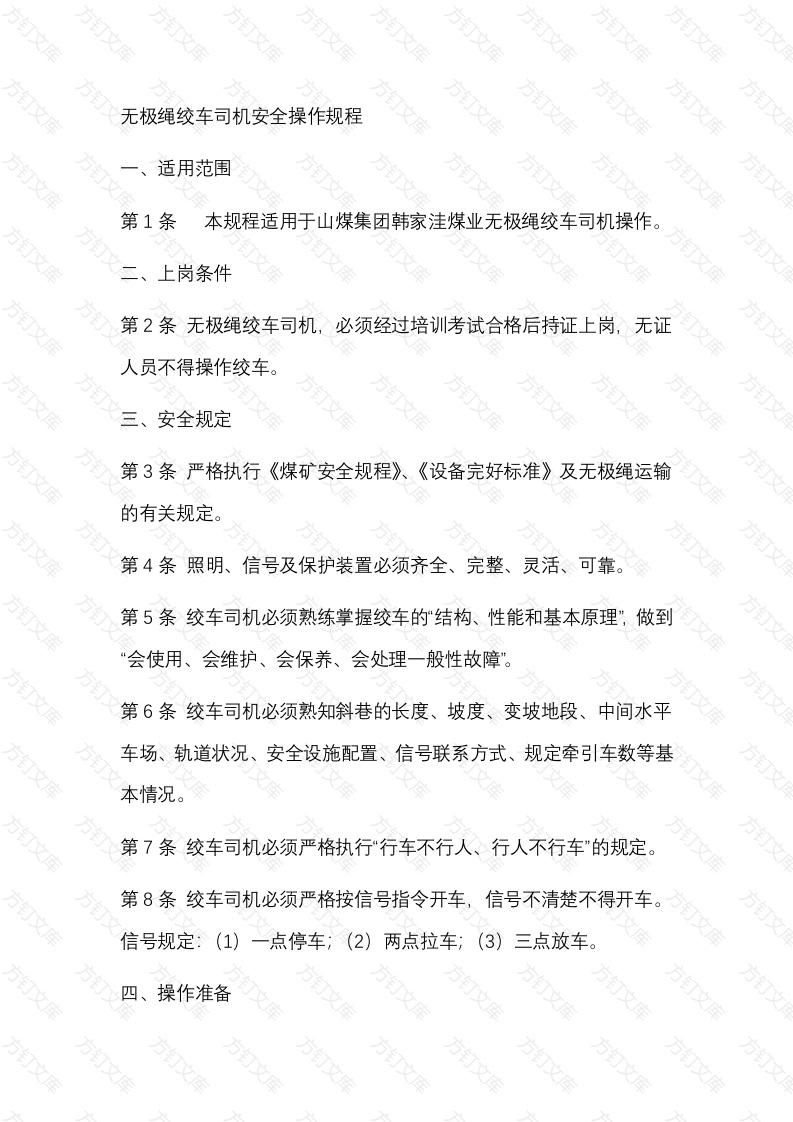 万文无极绳绞车司机安全操作规程万适用范围第1条本规程适用于山煤集团韩家洼煤业无极绳绞车司机操作。上岗条件第2条无极绳绞车司机,必须经过培训考试合格后持证上岗,无证人员不得操作绞车。三、安全规定第3条严格执行《煤矿安全规程》、《设备完好标准》及无极绳运输的有关规定。第4条照明、信号及保护装置必须齐全、完整、灵活、可靠。第5条绞车司机必须熟练掌握绞车的结构、性能和基本原理,做到“会使用、会维护、会保养、会处理一般性故障。第6条绞车司机必须熟知斜巷的长度、坡度、变坡地段、中间水平车场、轨道状况、安全设施配置、信号联系方式、规定牵引车数等基本情况。第7条绞车司机必须严格执行“行车不行人、行人不行车"的规定。第8条绞车司机必须严格按信号指令开车,信号不清楚不得开车。信号规定:(1)三点放车。四、操作准备文万第9条开车前要检查试验操作按钮是否灵活可靠信号是否声光语音兼备,清晰响亮。第10条检查绞车周围无极绳车跑道内有无障碍物,钢丝绳在滚筒上有无垒绳(咬绳)现象,尾轮、老轮是否正常。第11条检查保险绳有无问题,张紧绳轮、动轮组、转向轮固定是否牢靠,对轮木塞是否齐全,防脱装置是否起作用。第12条检查制动装置是否起作用,如发现有破损或失灵应立即处理。第13条检查滚筒、减速器、电机、联轴节、抱闸装置的零部件是否有松动、短缺,油脂是否适量,防护装置是否松动变形。第14条检查绞车开关及抱闸开关手把位置、减速器挡位、闸位置是否正确。第15条检查钢丝绳的磨损、断丝情况是否符合要求。第16条检查梭车固定钢丝绳的两只楔块是否紧固,储绳筒是否固定牢靠。五、正常操作第17条开车前检查完毕后,应打点联系,经联系确认全部上岗后将绞车开关与控制抱闸开关打到正确的合闸位置。第18条按下启动按钮,开车试运行,作以下检查1)运转部位声音、温度是否正常:万万万2)观察绞车的运行方向是否正确,3)电液制动闸是否正常;4)沿线岗位人员各自试验自己的信号系统是否正常;5)无异常后方可带负荷(挂车)运行;万文第19条正常停车:各岗位人员打点或司机按下停止按钮即可正常停六、特殊操作第20条绞车在运行过程中遇有下列情况之一的要及时停车1、启动或运行过程中,发现地锚松动、拉紧装置异常、张紧轮过于靠近主滚筒等情况;2、绞车运行中听到停车信号万3、发现由于车辆掉道、超负荷或主绳突然松弛;4、发现其它不安全因素。七、操作中注意事项第21条无信号或信号不清不准开车。万第22条运转设备有异常现象必须停车检查第23条绞车运行中,要定期检查各运转部位声音是否正常,温度是否超限,运行时注意滑轮和配重是否上下移动灵活,不得有卡滞现象。文文