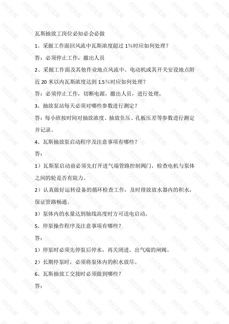 瓦斯抽放工岗位必知必会必做1、采掘工作面回风流中瓦斯浓度超过1%时应如何处理?答:必须停止工作,撤出人员2、采掘工作面及其他作业地点风流中、电动机或其开关安设地点附近20米以内瓦斯浓度达到1.5%时应如何处理?答:必须停止工作,切断电源,撤出人员,进行处理。方3、抽放泵站每天必须对哪些参数进行测定?答:每小班按时间对抽放浓度、抽放负压、孔板压差等参数进行测定并记录。瓦斯抽放泵启动程序及注意事项有哪些?文答:1)瓦斯泵启动前必须先打开进气端管路控制阀门,检查电机与泵体之间的轮是否有阻力。2)认真做好运转设备的循环检查工作,及时排放放水器内的积水,保证管路畅通。方3)泵体内的水量达到轴线高度时方可送电启动。5、停泵操作程序及注意事项有哪些?万答1)停泵时必须先停泵后停水,再关闭进、出气端的闸阀。2)长期停泵时,必须将泵体内的积水放尽。万6、瓦斯抽放工交接时必须做到哪些?答万万万万泵站内的所有仪器、仪表必须保证完好,做到现场交接班。2)认真填写好本班各种记录,保证准确可靠。7、井下供电应做到“三无、四有、两齐、三全、三坚持”,其内容是什么?答:三无:无鸡爪子、无明接头、无羊尾巴四有:有过流和漏电保护装置,有螺丝和弹簧垫,有密封圈和挡板,有接地装置。两齐:电缆悬挂整齐,设备硐室清洁整齐。方三全:防护装置全,绝缘用具全,图纸资料全。三坚持:坚持使用检漏继电器,坚持使用煤电钻、照明和信号综合保护装置,坚持使用风电、瓦斯电闭锁。8、瓦斯抽放泵及其附属设置至少有几套备用?答:1套。9、抽放泵站必须安设什么?答:安设瓦斯传感器。方10、井下移动泵站安装地点有什么要求?答:必须安装在新鲜风流中。11、抽放管路离地高度不小于多少米?答:0.3米。12、管路检查工工作时必须携带什么?万文答:便携式甲烷报警仪。13、在下风侧栅栏外必须设什么?当巷道风流中瓦斯浓度超限报警时,万文应怎样做?答:必须设有甲烷检测报警仪。当浓度超限时,应断电、停止抽放瓦斯,进行处理14、抽出的瓦斯排入回风巷时,在抽放瓦斯管路出口处必须设置栅栏对栅栏的位置有什么要求?答:栅栏设置的是上风侧距管路出口5m,下风侧距管路出口30m,两栅栏间禁止任何作业。15、管路铺设时每隔多少米要有一吊挂点,保持平、直、稳。答:3~4米。16、瓦斯泵工严禁做哪些?答:方方订1)瓦斯泵电机发热时,严禁用水对其进行冷却2)瓦斯泵运转时严禁用手脚触摸泵体旋转部位方3)瓦斯泵电机受潮不能在井下打开进行检修处理。17、瓦斯抽放工应注意哪些危险源?答:1)瓦斯抽放泵的运转情况,有无异常声响。2)抽放管路有无漏气。3)抽放管路上的放水装置及时放水4)各抽放地点的抽放参数有无明显变化万18、总经理令对采掘工作面瓦斯抽放是如何规定的?采煤工作面瓦斯绝对涌出量大于5立方米/分钟,上隅角瓦斯大