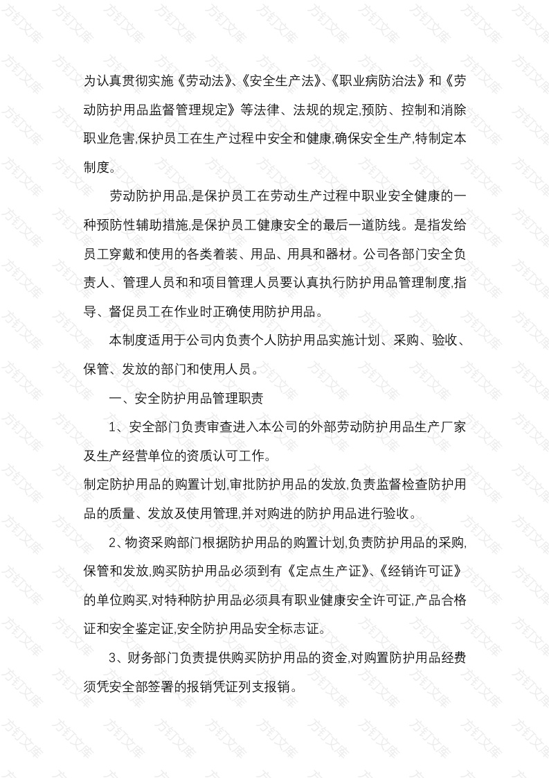 为认真贯彻实施《劳动法》、《安全生产法》、《职业病防治法》和《劳动防护用品监督管理规定》等法律、法规的规定,预防、控制和消除职业危害,保护员工在生产过程中安全和健康,确保安全生产,特制定本制度。劳动防护用品,是保护员工在劳动生产过程中职业安全健康的种预防性辅助措施,是保护员工健康安全的最后一道防线。是指发给员工穿戴和使用的各类着装、用品、用具和器材。公司各部门安全负责人、管理人员和和项目管理人员要认真执行防护用品管理制度,指导、督促员工在作业时正确使用防护用品。本制度适用于公司内负责个人防护用品实施计划、采购、验收保管、发放的部门和使用人员。安全防护用品管理职责1、安全部门负责审查进入本公司的外部劳动防护用品生产厂家及生产经营单位的资质认可工作。制定防护用品的购置计划,审批防护用品的发放,负责监督检查防护用品的质量、发放及使用管理,并对购进的防护用品进行验收。2、物资采购部门根据防护用品的购置计划,负责防护用品的采购,保管和发放,购买防护用品必须到有《定点生产证》、《经销许可证》的单位购买,对特种防护用品必须具有职业健康安全许可证,产品合格证和安全鉴定证,安全防护用品安全标志证。3、财务部门负责提供购买防护用品的资金,对购置防护用品经费须凭安全部签署的报销凭证列支报销。各分公司负责对佩戴个人防护用品人员、数量、种类的进行统计上报。按照公司的要求领用个人防护用品并发放到员工。对员工佩戴个人防护用品进行指导、督促正确佩戴。5、工会是防护用品的监督部门,有权对劳动防护用品的质量、放、使用进行监督。6、安全部每年定期或不定期对公司内防护用品进行抽查与检查,需要技术鉴定的送国家授权的防护用品检验站检验。二、安全防护用品的采购1、安全防护用品的采购计划由项目部提出,经项目经理审核后,由项目部材料员统一购买。采购的特种劳动保护用品质量必须达到国家或行业标准要求的合格标准,并在项目部入库、建账。2、安全防护用品采购前,材料员应向安全部提供生产和经营安全防护用品单位的营业执照及产品质量证明文件,安全部签字认可。采购发票复印件应在安全部备案,加强安全部在采购过程中的监督作用。3、采购的安全防护用品应是取得安全防护用品安全标志(“la"标识)的产品。安全防护用品安全标志证书由国家安全生产监督管理总局监制,加盖安全防护用品安全标志管理中心印章。4、特种劳动保护用品的采购必须在专门从事劳保用品生产经营的厂家或商家处采购,经营商家必须在市级以上工商行政管理部门备案,并办理正规合法的供购手续。5、项目部租赁的旧安全防护用品必须是合格品,并具有齐全、合文格的质量证明文件6、所购买劳动防护用品必须符合国家或行业标准,必须有“三证”即生产许可证、安全鉴定证和产品合格证,由安全部门验收后方可入7、安全部负责及时收集已取得安全防护用品安全标志证书的安全防护用品供方名录,及时传递给相关部门和管理人员,作为他们采购的参考依据。三、安全防护用品的验收1、施工项目部负责安全防护用品进场的验收,新采购或租赁的安全防护用品应质量合格,质量证明文件齐全、有效。2、特殊劳动防护用品实行安全标志管理,安全防护用品安全标志包括安全防护用品安全标志证书和安全防护用品安全标志标识(“la'标识)两部分。3、为了保证安全防护用品质量,安全防护用品厂家应提供合格的质量证明文件。合格的质量证明文件必须有生产许可证、安全鉴定证书、产品合格证、型式检验报告和安全防护用品安全标志证书,在产品的明显位置应有安全防护用品安全标志标识。4、安全部负责对安全防护用品的检验过程和合格性进行监督检查。5、公司工会对安全防护用品管理的违法行为有权要求纠正并对纠正情况进行监督。四、安全防护用品的保管万万万