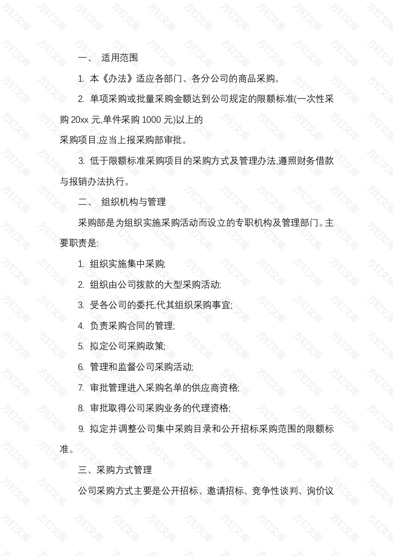 适用范围本《办法》适应各部门、各分公司的商品采购。单项采购或批量采购金额达到公司规定的限额标准(一次性采购20xx元,单件采购1000元)以上的采购项目,应当上报采购部审批。3.低于限额标准采购项目的采购方式及管理办法,遵照财务借款与报销办法执行。组织机构与管理采购部是为组织实施采购活动而设立的专职机构及管理部门。主要职责是:1.组织实施集中采购:2组织由公司拨款的大型采购活动:方3.受各公司的委托,代其组织采购事宜:负责采购合同的管理:5.拟定公司采购政策:6.管理和监督公司采购活动:7.审批管理进入采购名单的供应商资格8.审批取得公司采购业务的代理资格9.拟定并调整公司集中采购目录和公开招标采购范围的限额标三、采购方式管理公司采购方式主要是公开招标、邀请招标、竞争性谈判、询价议标和单一来源。1.凡纳入公司采购计划资金超过10万元以上的采购项目,原则上应实行公开招标。2能从有限范围的供应商处采购的或者公开招标时间长、费用高,不能达到节约的目的,经总经理批准可采用邀请招标。3.符合下列情况之一的经总经理批准可采用竞争性谈判方式采购。(1)招标后没有供货急需采购,而无法按招标方式得到的:(3)投标文件的准备需较长应商投标或者没有合格标的:(2)出现了不可预见的的时间才能完成或投标文件需要高额费用:(4)有特别要求的。4采购的货物符合规格、标准统一,现货货源充足,价格弹性较小售后服务好,经总经理批准可采用询价议标采购。5.下列情况可采用单一来源方式采购,(1)只能从唯一供应商处获得,或供应商拥有专利权,且无其他合适(2)因原采购项目的后续维修、零配件供应、更换或扩充等一致性和兼容性要求,必须继续从原供应万四物资采购审批程序1.公司采购管理程序包括下列主要步骤:万万(1)编制公司采购预算;(2)编制并批复公司采购计划:(3)确定采购方式:(4)订立及履行采购合同;(6)结算。方订2.采购单位的采购计划按以下要求报送:(1)采购计划的报送。各品牌经理报送采购计划时,填报《采购计划表》(以下统称《计划表》),本表一式两份部门留存一份,采购部一份。采购部对《计划表》进行审查,财务中心把关,并于2日内将审查意见(附《计划表》)送采购单位。(2)采购单位报送的月份执行计划,应是本月已经确定要购置且采购资金已经落实的项目,按规定应办理审批的采购项目,应办理审批手续。(3)没有审批手续,不能下达采购月份执行计划。3.采购部要根据批准的采购计划,对采购清单审核无误后,确定具体采购方式。其中,属于集中采购的项目,由采购部按要求统一进行采购。4.合同内容一经确定,采购单位应将合同草案的有关文件报采购部。采购部收到合同草案经财务中万文