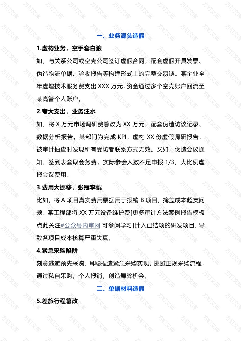 业务源头造假1.虚构业务,空手套白狼如,与关系公司或空壳公司签订虚假合同,配套虚假开具发票伪造物流单据、验收报告等构建形式上的完整交易链。某企业全年虚增技术服务费支出XX万元,资金通过多个空壳账户回流至某高管个人账户。2.夸大支出,业务注水如,将X万元市场调研费篡改为X万元,配套伪造访谈记录数据分析报告。某部门为完成KPI,虚构X份虚假调研报告,被审计抽查时发现所有受访者联系方式无效。又如,伪造会议通知、签到表套取会务费,实际参会人数不足申报1/3,大比例虚报会议费用。3.费用大挪移,张冠李戴比如,将A项目真实费用票据用于报销B项目,掩盖成本超支问题。某工程部将X万元设备维护费[更多审计方法案例报告模板点此关注#公众号内审网可参阅学习]计入已结项的研发项目,导致各项目成本核算严重失真。4.紧急采购陷阱刻意逃避预先采购,耳聪捏造紧急采购实现,逃避正规采购流程通过私自采购,个人报销,创造舞弊机会。单据材料造假5.差旅行程篡改万利用报销管理漏洞,篡改机票/火车票/出租车行程,将私人旅行包装成公务出差或外出。如,某员工将度假机票配套客户拜访照片,成功报销X万元差旅费,如,修改滴滴行程明细后打印报销(重点抽查订票系统后台数据,要求现场出示或视频检查,或重点关注格式细节是否有瑕疵,如对齐位置、字体大小等)6.医疗黑产套利如,串通医疗机构,购买虚假诊断证明、挂号单、病历本,伪造重病事实。某员工提交伪造XX诊断书申请大病补助,保险公司核查发现就诊医院无相关治疗记录。7.培训空转,证书骗局比如,联合培训机构伪造培训证书,配套虚假课程文件、课程表。在某企业领导力培训项目中,X%人员系虚假培训,并未参与,相关培训照片存在明显PS痕迹。8利用考核漏洞,绩效注水,骗取绩效奖金如,篡改绩效考核表、客户评价表,虚构业绩达标事实,或者联合客户签订意向协议,甚至支付款项(后申请退款)。某销售经理通过一番操作将季度达成率从X%升为106%,成功骗取X万元季度绩效奖金。9.仓储黑洞,虚假损耗如,某仓库主管与供应商合谋,将正常货物鉴定、标记为破损报废,套取X万元损耗补偿款,一起分赃。10.物流幽灵,运输造假万虚构物流运输单据,配套虚假签收单,骗取运输。某区域经销商半年内累计虚增、伪造30车皮货物运输记录,套取运费X万元。11.办公黑洞,耗材虚领利用低耗品关注度低的管理漏洞,伪造办公耗材验收、入库、领用记录,虚报打印机硒鼓、纸张消耗量。某行政人员与供应商勾结,每季度虚报X%耗材用量,套取X万元。12.福利蚕食,签收造假伪造签收单、节日慰问品清单,截留福利预算,某工会人员虚报XXX份节日礼盒发放记录,将X万元款项转入个人账户13.时空穿越,择期报销如,为完成本考核期间业绩,获得绩效奖金,将费用隐匿挪腾至下一个考核期间,或考虑到本期业绩过剩,为逃避可能被提高考核标准,并为下一期间业绩提前准备,将未来费用挪至本期报销造成业务、财务、绩效奖金数据虚假。14.利用漏洞,重复报销利用单位查重管控不力的漏洞,及电子发票可重复下载特性,同张发票在不同账期反复提交。三、流程审批环节舞弊造假15.人情报销的道德绑架以帮领导处理费用为由,迫使下属配合造假。某主管要求实习生虚开发票冲抵其私人宴请,否则以辞退相逼,形成部门舞弊链条。16.伪造审批,移形换影