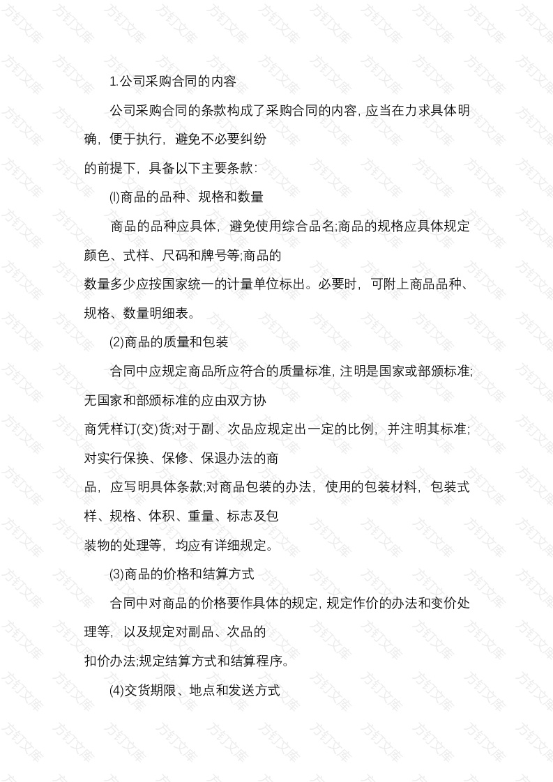 1.公司采购合同的内容公司采购合同的条款构成了采购合同的内容,应当在力求具体明便于执行,避免不必要纠纷的前提下,具备以下主要条款:)商品的品种、规格和数量商品的品种应具体,避免使用综合品名;商品的规格应具体规定颜色、式样、尺码和牌号等;商品的数量多少应按国家统一的计量单位标出。必要时,可附上商品品种、规格、数量明细表。(2)商品的质量和包装合同中应规定商品所应符合的质量标准,注明是国家或部颁标准无国家和部颁标准的应由双方协商凭样订(交)货:对于副、次品应规定出一定的比例,并注明其标准对实行保换、保修、保退办法的商品,应写明具体条款:对商品包装的办法,使用的包装材料,包装式样、规格、体积、重量、标志及包装物的处理等,均应有详细规定。文(3)商品的价格和结算方式合同中对商品的价格要作具体的规定,规定作价的办法和变价处理等,以及规定对副品、次品的扣价办法:规定结算方式和结算程序。(4)交货期限、地点和发送方式万万万交(提)货期限(日期)要按照有关规定,并考虑双方的实际情况商品特点和交通运输条件等确定。同时,应明确商品的发送方式是送货、代运,还是自提。文(5)商品验收办法合同中要具体规定在数量上验收和在质量上验收商品的办法、期限和地点。(6)违约责任签约一方不履行合同,必将影响另一方经济活动的进行,因此违约方应负物质责任,赔偿对方遭受的损失。在签订合同时,应明确规定,供应者有以下三种情况时应付违约金或赔偿金:①不按合同规定的商品数量、品种、规格供应商品:②不按合同中规定的商品质量标准交货③逾期发送商品。购买者有逾期结算货款或提货,临时更改到货地点等,应付违约金或赔偿金。(7)合同的变更和解除条件合同中应规定,在什么情况下可变更或解除合同,什么情况下不可变更或解除合同,通过什么手续来变更或解除合同等。此外,采购合同应视实际情况,增加若干具体的补充规定,使签订的合同更切实际,行之有效。2采购合同的签订)签订采购合同的原则①合同的当事人必须具备法人资格。这里所指的法人,是有一定的组织机构和独立支配财产,能够独立从事商品流通活动或其他经济活动,享有权利和承担义务,依照法定程序成立的企业。②合同必须合法。也就是必须遵照国家的法律、法令、方针和政策签订合同,其内容和手续应符合有关合同管理的具体条例和实施细则的规定。③签订合同必须坚持平等互利、充分协商的原则④签订合同必须坚持等价、有偿的原则。⑤当事人应当以自己的名义签订经济合同。委托别人代签,必须要有委托证明。⑥采购合同应当采用书面形式。(2)签订采购合同的程序签订合同的程序是指合同当事人对合同的内容进行协商,取得致意见,并签署书面协议的过程。一般有以下五个步骤①订约提议。订约提议是指当事人一方向对方提出的订立合同的要求或建议也称要约。订约提议应提出订立合同所必须具备的主要条款和希望对方答复的期限等,以供对方考虑文
