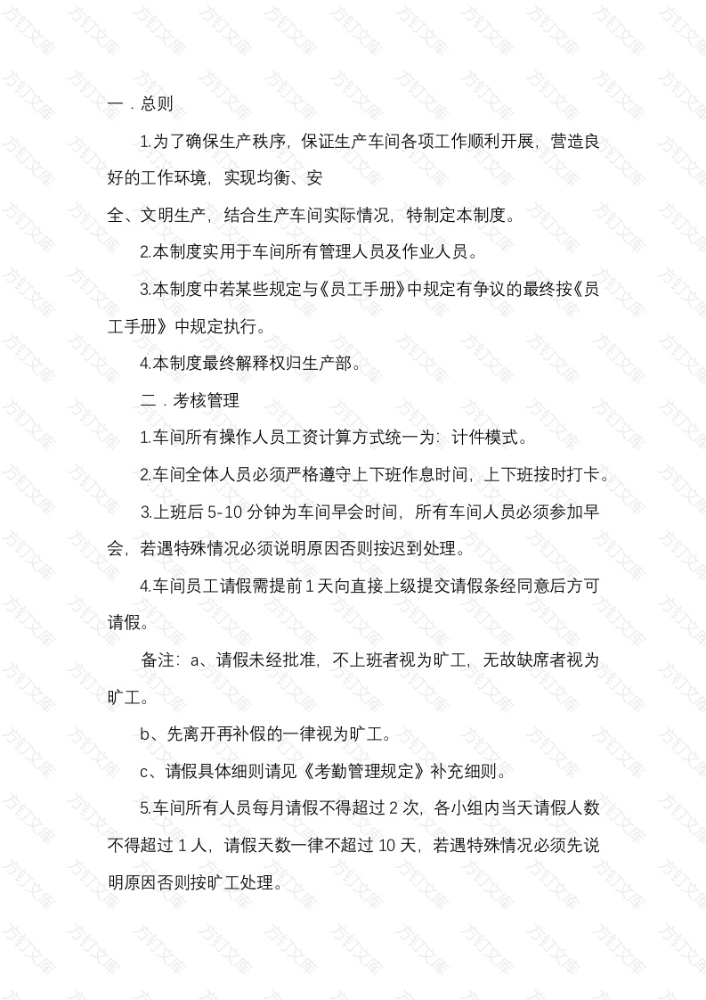 总则1为了确保生产秩序,保证生产车间各项工作顺利开展,营造良好的工作环境,实现均衡、安全、文明生产,结合生产车间实际情况,特制定本制度。2.本制度实用于车间所有管理人员及作业人员。3本制度中若某些规定与《员工手册》中规定有争议的最终按《员工手册》中规定执行。4.本制度最终解释权归生产部。二考核管理1.车间所有操作人员工资计算方式统一为:计件模式。2车间全体人员必须严格遵守上下班作息时间,上下班按时打卡3.上班后5-10分钟为车间早会时间,所有车间人员必须参加早会若遇特殊情况必须说明原因否则按迟到处理。4.车间员工请假需提前1天向直接上级提交请假条经同意后方可请假。备注:a、请假未经批准,不上班者视为旷工,无故缺席者视为b、先离开再补假的一律视为旷工。C、请假具体细则请见《考勤管理规定》补充细则5.车间所有人员每月请假不得超过2次,各小组内当天请假人数不得超过1人,请假天数一律不超过10天,若遇特殊情况必须先说明原因否则按旷工处理6.车间员工(签订合同正式工)主动离职需提前向人事部门递交辞职报告,提前天数按劳动合同上规定天数执行,试用期员工主动离职需提前3天,经同意后方可办理相关手续。备注:辞职期间,员工不得无故请假,若劳动合同注明提前一个月提出离职,则员工必须工作日满一个月方可离职,未满离职天数按每天50元对其进行扣除。7.上班期间车间员工禁止在车间内部接听与工作不相关的私)电话(特殊情况经领导批准后到车间外部接听,时长不超过五分)禁止在工作时间玩手机,违反者按违纪处理。(包括组长或组长以上8车间员工必须服从工作安排,尽职尽责做好本职工作,不得疏忽或以任何理由拒绝其工作安排;因车间生产任务需要安排加班时无特殊情况(未经领导同意请假者)不允许擅自离开,未经同意后擅自离开按旷工处理。9.车间全体人员上班期间必须整齐着装工作服、佩戴防静电手环不得穿拖鞋、露肩背心进入车间,违反者按违纪处理。10.上班期间禁止将私人物品、零食等带入车间,违反者按违纪处理。11.未经同意私自挪用他人工具者一经查实按严重违纪处理。12.不得私自携带公司内任何物品出厂(特殊情况需领导批准)若此行为经查核实,员工按实赔偿公司经济损失,并将予以辞退处理13.车间每月结合产量、质量、综合纪律评选出一名优秀员工,给予300元现金或等值物品奖励,并在全公司通报表扬14.当天值日人员负责对车间卫生进行清扫,离开车间时,关闭门、窗电等。三质量管理1.车间应严格执按照工艺规程和作业指导书要求进行生产2.车间月成品送检合格率不得低于98%。对新工人和工种变动)员进行岗位技能培训,经考核合格并有专人指导方可上岗操作。3对关键过程严格控制,对出现的异常情况,要查明原因,及时排除,使质量始终处于稳定的受控状态。4.原材料、半成品、进入车间后首先进行自检,符合标准方可投否则不得投入生产;若需要让步接收,需要办理让步接收手续。5认真执行“三检"制度(自检、互检、巡检),操作人员对自己生产的产品要做到自检,检查合格后,方能转入下工序,下工序对上工序的产品进行检查,不合格产品有权拒绝接收。6车间区域划分明确,产品做到标识明显、数量准确7生产中因操作不当或故意损坏导致产品报废,经查实后将按产品成本价格的(10-20%)要求个人赔偿。8新制作的测试工装应专人进行检查和校准,判定无异常且首件产品合格方可投入使用。9.严禁在使用中故意磕、碰、摔、划车间设备、量具、测试工装违反者按严重违纪处理。10,车间设备、量具、测试工装使用完后按规定摆放到指定位置