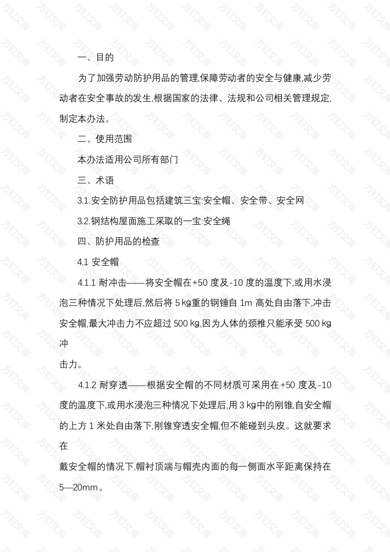 目的为了加强劳动防护用品的管理保障劳动者的安全与健康,减少劳动者在安全事故的发生,根据国家的法律、法规和公司相关管理规定制定本办法。使用范围本办法适用公司所有部门三、术语3.1.安全防护用品包括建筑三宝:安全帽、安全带、安全网方3.2.钢结构屋面施工采取的一宝:安全绳四、防护用品的检查方4.1安全帽4.1.1耐冲击将安全帽在+50度及-10度的温度下,或用水浸泡三种情况下处理后,然后将5kg重的钢锤自1m高处自由落下,冲击安全帽,最大冲击力不应超过500kg,因为人体的颈椎只能承受500kg击力。4.1.2耐穿透根据安全帽的不同材质可采用在+50度及-10度的温度下,或用水浸泡三种情况下处理后,用3kg中的刚锥,自安全帽的上方1米处自由落下,刚锥穿透安全帽,但不能碰到头皮。这就要求戴安全帽的情况下,帽衬顶端与帽壳内面的每一侧面水平距离保持在54.1.3耐低温性良好一当在-10度以下的气温中,帽的耐冲击及耐穿透能不改变4.1.4侧向刚性能达到规范要求等4.2安全带4.2.1安全带的抽查:安全带在2年以后,安全员应对现场的安全带进行批量抽查,选择一定比例的数量,做一次抽检,采用80kg的沙袋做自由坠落试验,若未断段可继续使用,但抽检的样带应更换,严禁继续使用。试验不合格的对本批采购的严禁使用,就此报废。4.3安全网4.3.1安全网的冲击冲击物:直径500mm,质量100kg的铸铁空心铁球或直径550mm,高度在900mm,重量120kg的圆柱形沙包自由坠落。4.3.2安全网在使用时必须经常地检查,并有跟踪使用记录,不符合要求的安全网应及时处理。安全网在不使用时,必须妥善的存放、保管,防止受潮发霉。若是旧网在使用前必须做试验,并有试验报告书或相关人员见证,试验不合格的严禁使用。4.4安全绳4.4.1安全绳必须使用必须使用∮8的,安全绳的两头搭接处采用钢丝绳卡子进行固定,挂设处采用u型卡子连接,使用150斤的重物自由坠落,不符合要求的严禁使用。五、安全防护用品的简介5.1安全帽,必须做到以下四点:方万万文万①帽衬顶端与帽壳内顶,必须保持25~50cm的空间,有了这个空间,才能够成为一个能量吸收系统,才能使冲击分部在头盖骨的整个面积上,减轻对头部的伤害;②必须系好下颏带,带安全帽如果不系下颏带,一旦发生高处坠落安全帽将被甩掉离开头部造成严重后果:③安全帽必须戴正,戴稳,如果帽子歪戴着,一旦头部受到打击,就不能减轻对头部的伤害。④安全帽在使用过程中会逐渐损坏。要定期不定期进行检查,如果发现开裂、下凹、老化、裂痕和磨损等情况,就要及时更换,确保使用安全5.2.安全带安全带是高处作业工人预防坠落伤亡事故的个人防护用品,被厂大建筑工人誉为救命带。安全带是由带子、绳子和金属配件组成,总称安全带。安全带的正确使用方法:在没有防护设施的高处施工时,必须系好安全带。安全带应该高挂低用,注意防止摆动碰撞。若安全带低挂高用,一旦发生坠落,将增加冲击力,带来危险。安全绳的长度限制在1.5~2.0m,使用3m以上长绳应加缓冲器。不准将绳打结使用,也不准将钩直接挂在安全绳上使用,应挂在连接环上用。安全带上的各种部件不得任意拆掉,使用2年以上应抽检一次。频繁使用的绳,要经常作外观检查,发现异常时,应提前报废。新使用的安全带必须有产品检验合格证,无证明不准使用。