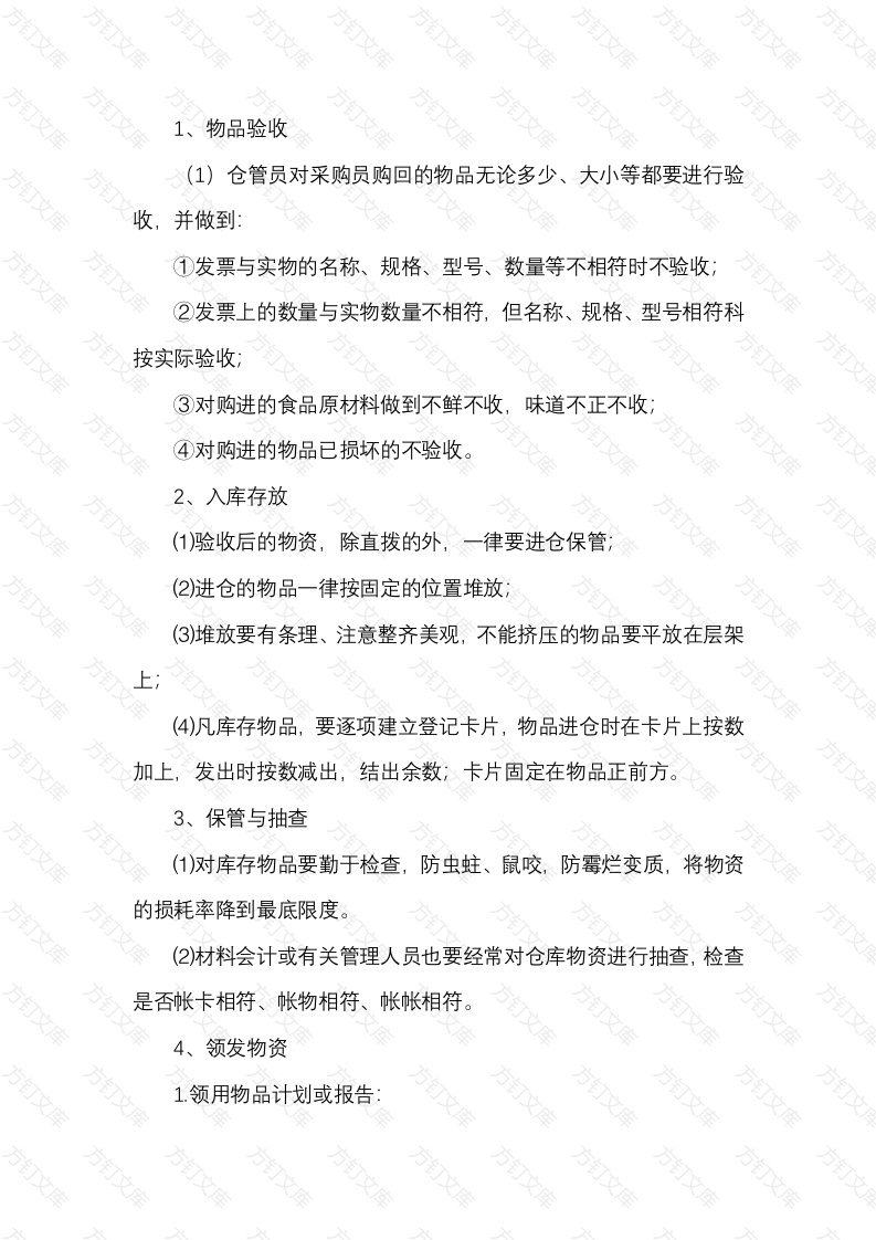 物品验收仓管员对采购员购回的物品无论多少、大小等都要进行验收并做到:①发票与实物的名称、规格、型号、数量等不相符时不验收②发票上的数量与实物数量不相符,但名称、规格、型号相符科按实际验收;③对购进的食品原材料做到不鲜不收,味道不正不收:④对购进的物品已损坏的不验收2、入库存放除直拨的外,律要进仓保管(2)进仓的物品一律按固定的位置堆放;(3)堆放要有条理、注意整齐美观,不能挤压的物品要平放在层架(4)凡库存物品,要逐项建立登记卡片,物品进仓时在卡片上按数加上,发出时按数减出,结出余数;卡片固定在物品正前方。3、保管与抽查(1)对库存物品要勤于检查,防虫蛀、鼠咬,防霉烂变质,将物资的损耗率降到最底限度。(2)材料会计或有关管理人员也要经常对仓库物资进行抽查,检查是否帐卡相符、帐物相符、帐帐相符。4领发物资1.领用物品计划或报告万万万①凡领用物品,根据规定必须提前做计划,报库存部门准备②仓管员将报来的计划按每天发货的顺序编排好,做好目录,准备好物品,以便取货人领取。2.发货与领货①各部门各单位的领货一般要求专人负责:②领料员要填好领料单(含日期、名称、规格、型号、数量、单价、用途等)并签名,仓管员凭单发货:③领料单一式三份,领料单位自留一份,单位负责人凭单验收仓管员一份,凭单入帐;材料会计一份,凭单记明细帐;④发货时仓管员要注意物品先进的先发、后进的后发3.货物计价①货物一般按进价发出,若同一种商品有不同的进价,一般按平均价发出;②需调出以外的单位的物资,一般按原进价或平均价家手续费和管理费调出5、盘点51仓库物资要求每月月中小盘点,月底大盘点,半年和年终彻5.2将盘点结果列明细表报财务部审核;5.3盘点期间停止发货万6、记帐6.1设立帐薄和登记帐,帐薄要整齐、全面、一目了然,62帐薄要分类设置,物资要分品种、型号、规格等设立帐户6.3记帐时要先审核发票和验收单,无误后在入帐,发现有差错时及时解决,在未弄清和更正前不6.4审核验收单、领料单要手续完善后才能入帐,否则要退回仓官员补齐手续后才能入帐:6.5发出的物资用加权平均发计价,月终出现的发货计价差额分品种列表一式三份,记帐员、部门、财务部各一份:6.6直拨物资的收发,同其他入库物资一样入帐;6.7调出本企业的物资所用的管理费、手续费,不得用来冲减材料成本,应由财务部冲减费用;6.8进口物资要按发票的数量、金额、税金、检疫费等如实折为单价人民币入帐,发出时按加权平6.9对于发票、税单、检疫费等尚未到的进口物资,于月底估价发放,待发票、税单、检疫费等收到、冲减估价后,在按实入帐,并调整暂估价,报财务部材料会计调6.10月底按时将材料会计报表连同验收单、领料单等报送财务部6.11与仓管员校对事物帐,每月与财务部材料会计对帐,保证帐