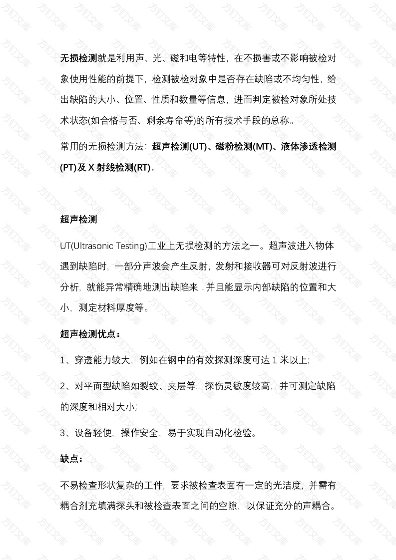无损检测就是利用声、光、磁和电等特性,在不损害或不影响被检对象使用性能的前提下,检测被检对象中是否存在缺陷或不均匀性,给出缺陷的大小、位置、性质和数量等信息,进而判定被检对象所处技术状态(如合格与否、剩余寿命等)的所有技术手段的总称。常用的无损检测方法:超声检测(UT、磁粉检测(MT)、液体渗透检测(PT)及X射线检测(RT)超声检测UT(Ultrasonic Testing)工业上无损检测的方法之一。超声波进入物体遇到缺陷时,一部分声波会产生反射,发射和接收器可对反射波进行分析,就能异常精确地测出缺陷来·并且能显示内部缺陷的位置和大小,测定材料厚度等超声检测优点:1、穿透能力较大,例如在钢中的有效探测深度可达1米以上:文2、对平面型缺陷如裂纹、夹层等,探伤灵敏度较高,并可测定缺陷的深度和相对大小;3、设备轻便,操作安全,易于实现自动化检验。缺点:不易检查形状复杂的工件,要求被检查表面有一定的光洁度,并需有耦合剂充填满探头和被检查表面之间的空隙,以保证充分的声耦合。磁粉检测首先来了解一下,磁粉检测的原理。铁磁性材料和工件被磁化后,由于不连续性的存在,工件表面和近表面的磁力线发生局部畸变,而产生漏磁场,吸附施加在工件表面的磁粉,形成在合适光照下目视可见的磁痕,从而显示出不连续性的位置、形状和大小。磁粉检测的适用性和局限性有:1、磁粉探伤适用于检测铁磁性材料表面和近表面尺寸很小、间隙极窄目视难以看出的不连续性。2、磁粉检测可对多种情况下的零部件检测,还可多种型件进行检3、可发现裂纹、夹杂、发纹、白点、折叠、冷隔和疏松等缺陷。4、磁粉检测不能检测奥氏体不锈钢材料和用奥氏体不锈钢焊条焊接的焊缝,也不能检测铜铝镁钛等非磁性材料。对于表面浅划伤、埋藏较深洞和与工件表面夹角小于20°的分层和折叠很难发现。液体渗透检测液体渗透检测的基本原理,零件表面被施涂含有荧光染料或着色染料后,在一段时间的毛细管作用下,渗透液可以渗透进表面开口缺陷中;经去除零件表面多余的渗透液后,再在零件表面施涂显像剂。同样,在毛细管的作用下,显像剂将吸引缺陷中保留的渗透液,渗透液回渗到显像剂中,在一定的光源下(紫外线光或白光),缺陷处的渗透液痕迹被显示,(黄绿色荧光或鲜艳红色)从而探测出缺陷的形貌及分布状态。渗透检测的优点有:1、可检测各种材料;2、具有较高的灵敏度;方3、显示直观、操作方便、检测费用低。而渗透检测的缺点有:1、不适于检查多孔性疏松材料制成的工件和表面粗糙的工件2、渗透检测只能检出缺陷的表面分布,难以确定缺陷的实际深度因而很难对缺陷做出定量评价。检出结果受操作者的影响也较大。X射线检测最后一种,射线检测,是因为X射线穿过被照射物体后会有损耗,不同厚度不同物质对它们的吸收率不同,而底片放在被照射物体的另侧,会因为射线强度不同而产生相应的图形,评片人员就可以根据影像来判断物体内部的是否有缺陷以及缺陷的性质。射线检测的适用性和局限性:1、对检测体积型的缺陷比较敏感,比较容易对缺陷进行定性。2、射线底片易于保留,有追溯性。直观显示缺陷的形状和类型万万万万