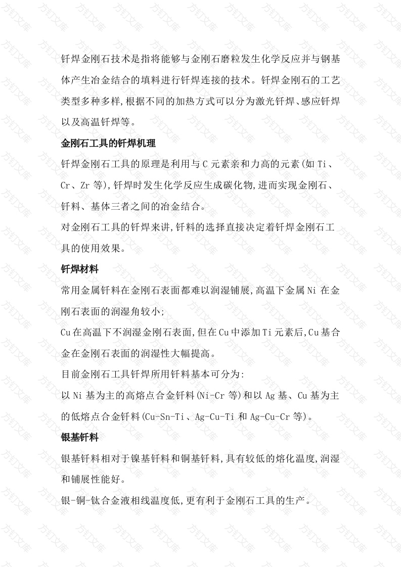 钎焊金刚石技术是指将能够与金刚石磨粒发生化学反应并与钢基体产生治金结合的填料进行钎焊连接的技术。钎焊金刚石的工艺类型多种多样,根据不同的加热方式可以分为激光钎焊、感应钎焊以及高温钎焊等。金刚石工具的钎焊机理钎焊金刚石工具的原理是利用与C元素亲和力高的元素(如Ti、C、Zr等),钎焊时发生化学反应生成碳化物,进而实现金刚石、钎料、基体三者之间的治金结合。对金刚石工具的钎焊来讲,钎料的选择直接决定着钎焊金刚石工具的使用效果。常用金属钎料在金刚石表面都难以润湿铺展,高温下金属i在金刚石表面的润湿角较小:Cu在高温下不润湿金刚石表面,但在Cu中添加Ti元素后,Cu基合金在金刚石表面的润湿性大幅提高。目前金刚石工具钎焊所用钎料基本可分为:以Ni基为主的高熔点合金钎料(Ni-Cr等)和以Ag基、Cu基为主的低熔点合金钎料(Cu-Sn-Ti、Ag-Cu-Ti和Ag-Cu-Cr等)银基轩料银基钎料相对于镍基钎料和铜基钎料,具有较低的熔化温度,润湿和铺展性能好。银-铜-钛合金液相线温度低,更有利于金刚石工具的生产在金属银中添加少量的钛颗粒,可以增强钎焊的效果,其中活性元素钛,能与金刚石中的碳反应生成碳化钛(TiC)但由于Ag金属价格较高,Ti元素对真空度要求较高,钎焊成本高;同时该钎料对金刚石的把持力较小,工作时易脱落,故其在金刚石工具钎焊中的应用并不十分广泛银基钎料常用于耐磨性低的特殊情况。文铜基钎料铜是用作电缆的一种金属,具有良好的耐腐蚀性。金属铜己被广泛用于电力和化工行业,但铜的高成本,在一定程度上限制了其规模铜基钎料主要分为铜锡钛和铜锡锆钛。根据Cu-C的金属合金相图,元素C在Cu中的溶解度几乎为零。因此一般将金属铜和其他金属进行混合,来制作混合钎料,提高钎焊接头强度。铜由于融化温度相对较高,所需钎焊温度高,会造成金刚石石墨化般通过添加金属锡来降低反应温度,节约反应成本。在工作环境较好、耐磨性要求不高的领域,可选择铜基或银基钎料,以降低金刚石的石墨化程度。镍基钎料钎焊层硬度高、耐蚀性好、耐磨性好、高温性能好,己被广泛用于航空航天领域。镍基钎料自诞生以来已有大量的基础和应用研究,其商业化发展也备受重视,其中Ni-Cr合金是钎焊金刚石工具常用的钎料。采用镍基钎料钎焊金刚石工具,二者优势互补,工具可用于高强度切割、磨削与钻进等场合。复合钎料由于材料加工难度的提高,原始的银基、铜基、镍基等钎料制作的金刚石工具无法满足加工的更高要求,如在原有钎料情况下增强工具的强度,保持工具的强度条件下降低工具的内应力等不少学者提出复合钎料的观点,通过向钎料中添加硬质或软质颗粒进一步改善钎焊工具的性能:向Ag-Cu-Ti钎料中添加纳米和微米A1203陶瓷颗粒,增强了钎焊接头的强度,有助于提高工具的耐磨性:向Ag-Cu-Ti复合钎料中添加μ-TiC颗粒来改善钎料和金刚石的磨损性,并阻止金刚石砂轮在钎焊过程中裂纹的产生:添加不同含量的Hf来增强Ni-Cr-Si-Cu-Sn无硼钎料,达到降低钎料熔点,细化晶粒的目的。方方方订万万万