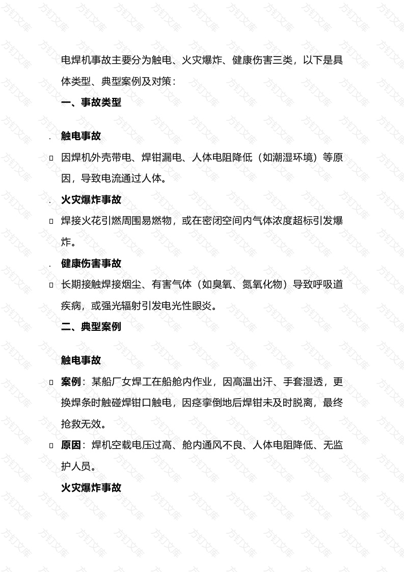 电焊机事故主要分为触电、火灾爆炸、健康伤害三类,以下是具体类型、典型案例及对策:事故类型触电事故因焊机外壳带电、焊钳漏电、人体电阻降低(如潮湿环境)等原因,导致电流通过人体。火灾爆炸事故焊接火花引燃周围易燃物,或在密闭空间内气体浓度超标引发爆炸。健康伤害事故长期接触焊接烟尘、有害气体(如臭氧、氮氧化物)导致呼吸道疾病,或强光辐射引发电光性眼炎。二、典型案例触电事故案例:某船厂女焊工在船舱内作业,因高温出汗、手套湿透,更换焊条时触碰焊钳口触电,因痉挛倒地后焊钳未及时脱离,最终抢救无效。原因:焊机空载电压过高、舱内通风不良、人体电阻降低、无监护人员。火灾爆炸事故万万万万案例:洛阳某商业大厦装修时,无证焊工违规作业,焊渣引燃地下室木制家具,火势蔓延至顶层歌舞厅,造成309人死亡。原因:焊工无证操作、未采取防火措施、易燃物末清理、灭火方法不当文健康伤害事故案例:某工厂焊工长期接触焊接烟尘,未佩戴防护用具,导致肺部功能受损。0原因:通风设备缺失、个人防护用品未正确使用三预防对策万触电预防万确保焊机外壳接地或接零,定期检查绝缘性能焊工穿戴绝缘手套、绝缘鞋,潮湿环境作业时增加绝缘垫。配备自动电击防止装置,定期检测焊机空载电压。方火灾爆炸预防动火作业前办理审批手续,清理周围易燃物。万密闭空间作业前检测气体浓度,确保通风良好配备灭火器、沙袋等消防器材,严禁在易燃易爆区域作业。健康伤害预防设置局部排风装置,定期清理焊接烟尘。焊工佩戴防尘口罩、焊接面罩、护目镜等防护用具。万文定期进行职业健康检查,加强安全培训。万四、总结电焊机事故多因操作违规、防护缺失导致。通过严格遵守操作规程、加强设备维护、落实安全防护措施,可有效降低事故风险。焊工需持证上岗,企业应强化安全监管,确保作业环境安全。电焊机事故的类型和典型案例和对策电焊机事故主要分为触电、火灾爆炸、健康伤害三类,以下是具体类型、典型案例及对策:事故类型触电事故因焊机外壳带电、焊钳漏电、人体电阻降低(如潮湿环境)等原因,导致电流通过人体。火灾爆炸事故焊接火花引燃周围易燃物,或在密闭空间内气体浓度超标引发爆炸。健康伤害事故0长期接触焊接烟尘、有害气体(如臭氧、氨氧化物)导致呼吸道疾病,或强光辐射引发电光性眼炎。典型案例万万万