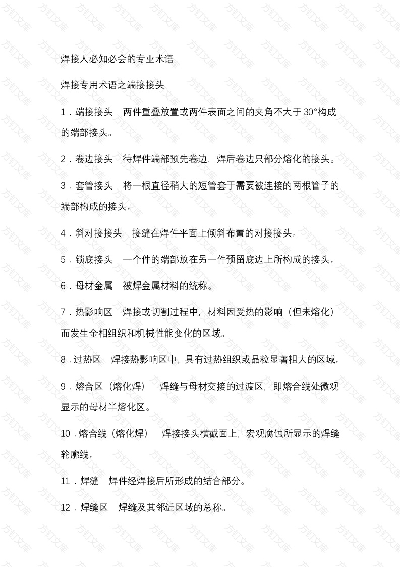 焊接人必知必会的专业术语万万焊接专用术语之端接接头1·端接接头两件重叠放置或两件表面之间的夹角不大于30°构成的端部接头。卷边接头待焊件端部预先卷边,焊后卷边只部分熔化的接头。套管接头、将一根直径稍大的短管套于需要被连接的两根管子的端部构成的接头。4.斜对接接头接缝在焊件平面上倾斜布置的对接接头。5.锁底接头一个件的端部放在另一件预留底边上所构成的接头。6.母材金属被焊金属材料的统称。7.热影响区焊接或切割过程中,材料因受热的影响(但未熔化)而发生金相组织和机械性能变化的区域。8.过热区焊接热影响区中,具有过热组织或晶粒显著粗大的区域。9.熔合区(熔化焊)焊缝与母材交接的过渡区,即熔合线处微观显示的母材半熔化区。10.熔合线(熔化焊)焊接接头横截面上,宏观腐蚀所显示的焊缝轮廓线。11焊缝焊件经焊接后所形成的结合部分焊缝区焊缝及其邻近区域的总称。万文万万焊缝金属区在焊接接头横截面上测量的焊缝金属的区域。熔焊时,由焊缝表面和熔合线所包围的区域。电阻焊时,指焊后形成的熔核部分。14定位焊缝焊前为装配和固定构件接缝的位置而焊接的短焊缝。焊接专用术语之承载焊缝承载焊缝焊件上用作承受载荷的焊缝。2连续焊缝◇连续焊接的焊缝。3.断续焊缝焊接成具有一定间隔的焊缝。4.纵向焊缝沿焊件长度方向分布的焊缝。横向焊缝垂直于焊件长度方向的焊缝环缝沿筒形焊件分布的头尾相接的封闭焊缝螺旋形焊缝用成卷板材按螺旋形方式卷成管接头后焊接所得到的焊缝密封焊缝主要用于防止流体渗漏的焊缝。9.对接焊缝在焊件的坡口面间或一零件的坡口面与另一零件表面间焊接的焊缝10角焊缝沿两直交或近直交零件的交线所焊接的焊缝。万万文正面角焊缝焊缝轴线与焊件受力方向相垂直的角焊缝。12侧面角焊缝焊缝轴线与焊件受力方向相平行的角焊缝13.并列断续角焊缝T形接头两侧互相对称布置、长度基本相等的断续角焊缝。14.交错断续角焊缝「形接头两侧互相交错布置、长度基本相等的断续角焊缝。15.凸形角焊缝焊缝表面突起的角焊缝。方焊接专用术语之凹形角焊缝凹形角焊缝焊缝表面下凹的角焊缝。方端接焊缝构成端接接头所形成的焊缝万文3塞焊缝两零件相叠,其中一块开圆孔,在圆孔中焊接两板所形成的焊缝,只在孔内焊角焊缝者不称塞焊。4槽焊缝板相叠,其中一块开长孔,在长孔中焊接两板的焊缝只焊角焊缝者不称槽焊。5·焊缝正面焊后从焊件的施焊面所见到的焊缝表面。6,焊缝背面焊后,从焊件施焊面的背面所见到的焊缝表面。7焊缝宽度焊缝表面两焊趾之间的距离。8.焊缝厚度在焊缝横截面中,从焊缝正面到焊缝背面的距离。9焊缝计算厚度设计焊缝时使用的焊缝厚度。对接焊缝焊透时它等于焊件的厚度;角焊缝时它等于在角焊缝横截面内画出的最大直角等腰三角形中,从直角