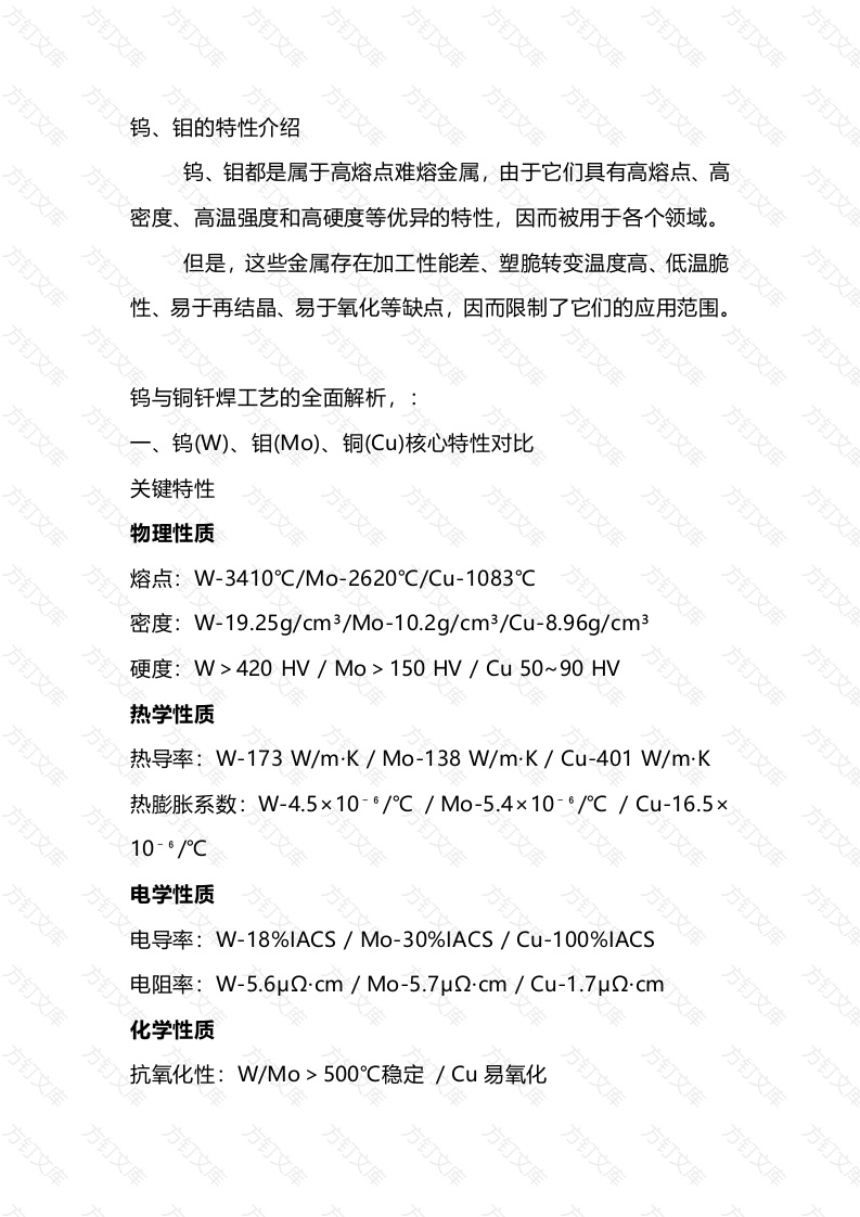 钨钼的特性介绍钨、钼都是属于高熔点难熔金属,由于它们具有高熔点、密度、高温强度和高硬度等优异的特性,因而被用于各个领域。但是,这些金属存在加工性能差、塑脆转变温度高、低温脆性、易于再结晶、易于氧化等缺点,因而限制了它们的应用范围。钨与铜钎焊工艺的全面解析,钨W)、钼(Mo)、铜(CU)核心特性对比关键特性物理性质熔点:W-3410℃/Mo-2620℃/Cu-1083℃密度:W-19.25g/cm3/Mo-10.2g/cm3/Cu-8.96g/cm3硬度:W>420HV/Mo>150HV/Cu50~90HV热学性质热导率:W-173W/mK/Mo-138W/mK/Cu-401W/mK热膨胀系数:W-4.5×10-6/°℃/Mo-5.4×10-/℃/Cu-16.5×电学性质电导率:W-18%lACS/Mo-30%1ACS/Cu-100%1ACS电阻率:W-5.6μ2cm/Mo-5.7μ2cm/Cu-1.7μ2cm化学性质抗氧化性:W/Mo>500C稳定/Cu易氧化万万耐腐蚀性:W/Mo耐酸碱/Cu耐非氧化酸钨和钼的电导率差不多,但是热导率不同。同样的尺寸和外形所产生的热量相当,但是钨电极却可以达到更高的温度,因为钨的热导率更高。要注意的是,热导率越低,电阻越大。二、钨与铜钎焊(电极)关键技术电极又叫焊针,作为电阻焊接过程中的重要部件,其性能直接关系到焊接质量和生产效率。铜镶钨/钼电极是精密电阻点焊电极的一种,在某些特殊焊接工艺下,具有相对较高的导电性,同时还有优异的高温稳定性。铜镶钼电极使用钼作为电极端部,杆部采用紫铜或铬锆铜,保持高导电、高散热的特性。镶钼电极同比于镶钨电极,钼的硬度比钨高,但钼材料在焊接时容易开裂。因此,与传统电极(如:铜及其合金)相比,其使用寿命更文物理性能极差(CTE不匹配)W:4.5×10-6/℃温差1200C时应力可达400MPa(超铜屈服强度)界面反应障碍万万W-Cu常温下互不相溶需形成WCU4等过渡相(需>万万导热导电需求接头需保持>85%铜的导电率(57MS/m)(二)先进钎焊解决方案1.梯度过渡层设计工艺参数:真空度:10-3Pa温度梯度:800-870℃保温时间:20min方2.钎料体系银基钎料接头强度(MPa)≥1803.复合中间层技术Mo箔过渡层:方订厚度0.1mm时应力下降62%方CTE过渡:4.5→7.2→16.5(×10-6/°℃)功能梯度材料(FGM):层数:5层(W100%→W70Cu30→W30Cu70→Cu100%)烧结温度:1300℃×2h三)烧结工艺控制三、工业应用案例指标传统工艺Cu镶钨电极万