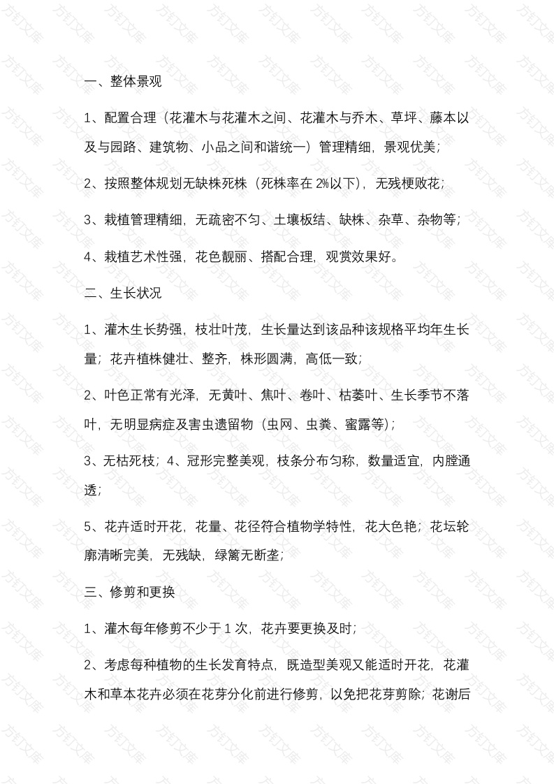 整体景观1、配置合理(花灌木与花灌木之间、花灌木与乔木、草坪、藤本以及与园路、建筑物、小品之间和谐统一)管理精细,景观优美2、按照整体规划无缺株死株(死株率在2%以下),无残梗败花3、栽植管理精细,无疏密不匀、土壤板结、缺株、杂草、杂物等4、栽植艺术性强,花色靓丽、搭配合理,观赏效果好。生长状况1、灌木生长势强,枝壮叶茂,生长量达到该品种该规格平均年生长量;花卉植株健壮、整齐,株形圆满,高低一致2、叶色正常有光泽,无黄叶、焦叶、卷叶、枯萎叶、生长季节不落叶,无明显病症及害虫遗留物(虫网、虫粪、蜜露等);3、无枯死枝;4、冠形完整美观,枝条分布匀称,数量适宜,内膛通透5、花卉适时开花,花量、花径符合植物学特性,花大色艳;花坛轮廓清晰完美,无残缺,绿篱无断垄修剪和更换1、灌木每年修剪不少于1次,花卉要更换及时;考虑每种植物的生长发育特点,既造型美观又能适时开花,花灌木和草本花卉必须在花芽分化前进行修剪,以免把花芽剪除;花谢后要及时剪掉残花老枝;科学合理,适时适度;3、灌木剪口芽留芽方位准确,芽长势饱满4、用花质量高,5、灌木冠形优美,内膛通透,枝条数量适宜、分布匀称,修剪强度适宜6、枯死枝、内膛乱枝、交叉枝、平行枝、横跨枝、衰弱枝、病虫枝和其它影响树势、树形的枝条修除率95%以上;7、绿篱和花坛整形根据植物生长量,新梢生长6一10cm修剪一次直线面处要拉线修剪,上面平整度在10米长度内高差不超过0.5cm;侧面整齐度在10米长度内高差不超过1cm;弧线部分要圆滑美观符合造景要求;8、球类植物光滑美观,符合造型要求,无冒条现象;万操作标准,工具齐全方四、施肥1、灌木每年施肥不少于1次;花卉每次栽植前施足底肥2、灌木在花芽分化期要适当控水肥以促进花芽分化,花芽分化后必须适当施肥,以使花多色艳,其余花灌木要求在春、秋季重点施肥各1次(农家肥和无机肥合理配施);肥料种类适宜,方法合理,肥料种类以有机肥、生物肥/生态肥为4、肥料施放要方法科学合理,不能裸施,可采用埋施或水施等方法;埋施要先挖穴开沟,开沟时要注意沟的深度,不能伤及植物根系;施肥后要回填土、塌实、浇足水、找平;一般可结合除草松土进行施肥5、施肥量要把握好,无缺肥、无漏肥、无肥害。五、灌溉因生长季节天气情况、花卉灌木种类恰当进行,每天的浇水量不低于该规格植物的蒸腾量,土壤含水量控制在6一12%,喷水、淋水及时有效,无旱无涝。六、栽植1、栽植科学,疏密有度,花卉更换及时合理;成活率:易成活树种成活率100%,不易成活树种成活率要在95%以上3、常绿及反季节栽植的花灌木带土球,土球直径不小于冠径的1/3,且须根保留完好;树坑直径大于土球直径50cm以上,封土深度以盖住土球上部510cm为宜补植文及时清理死苗,并在三天内补植和原来植物种类相同的苗木,力