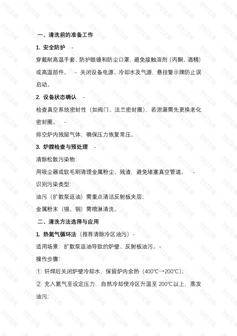 清洗前的准备工作安全防护穿戴耐高温手套、防护眼镜和防尘口罩,避免接触溶剂(丙酮、酒精)或高温部件。关闭设备电源、冷却水及气源,悬挂警示牌防止误启动。2.设备状态确认检查真空系统密封性(如阀门、法兰密封圈),若泄漏需先更换老化密封圈。排空炉内残留气体,确保压力恢复常压。3.炉膛检查与预处理万清除松散污染物避免堵塞真空管道。方用吸尘器或软毛刷清理金属粉尘、残渣,识别污染类型油污(扩散泵返油)需重点清洁反射板夹层金属粉末(锡、铜)需喷淋清洗。二、清洗方法选择与应用1.热氮气循环法(推荐清除冷区油污)适用场景:扩散泵返油导致的炉壁、反射板油污。操作步骤:方1钎焊后关闭炉壁冷却水,保留炉内余热(400℃→200℃)2充入氮气至设定压力,自然冷却使冷区升温至200℃以上,蒸发油污文文万启动旋片泵抽真空至10Pa以下,排出油蒸汽无需拆卸设备,高效清除夹层油污。手工擦洗法适用场景:局部油污或氧化物,如加热元件表面、炉门密封槽。溶剂选择:丙酮、酒精或异丙醇(禁用易燃溶剂)。工具:无纺布、细长刷或棉签清洁死角(如多层反射板夹缝)3喷淋/浸渍法适用场景:金属粉末(锡、铅)或烧结残留物。操作:高压喷淋清洁液(含悬浮剂)冲击污染物,或注入清洁液搅拌混合后排出。4.吸尘辅助法作为补充手段,清除沉积在炉底的松散粉尘。方法对比与选择建议方法保作复杂度洗效果反射板、手工擦沈油污、氧化物烧结物高吸尘法松散粉尘低底部、角落策略建议日常维护以吸尘+手工擦拭为主;万万深度清洗(每300小时)优先用热氮气法严重污染需拆卸部件喷淋清洗。三、关键注意事项万1.温度与冷却控制热氮气清洗时需关闭冷却水,确保冷区升温至200℃以上铝钎焊后需快速降温至400℃以减少硅扩散,再转入慢冷阶段。2.抽真空处理蒸发后的油污需通过粗真空(≤10P)彻底排出,防止二次吸附。扩散泵每年拆卸清洗,使用硅基油(如SW1-ZKY)减少返油。3.污染预防措施工件预处理入炉前需脱脂、超声波清洗或干打磨,避免带入碳氢化合物、锌/镉等高蒸气压元素材料限制:禁用含锌、镉、铅的钎料;铸件需预先除气夹具管理:同步清洁夹具并选用耐高温材料(如石墨),避免青铜、铝件高温熔化污染炉膛。4.冷却系统维护水压保持0.15~0.3MPa,定期清理蛇形管(用稀醋酸防矿物质沉积)。每月检测水质pH值,防止管路堵塞导致扩散泵过热,四、安全与维护规范万文