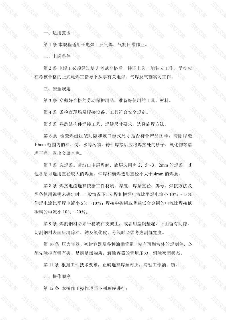 适用范围第1条本规程适用于电焊工及气焊、气割日常作业。上岗条件万文第2条电焊工必须经过培训考试合格后,持证上岗,能独立工作。学徒应在考核合格的正式电焊工指导下从事有关电焊、气焊及气割实习工作。三、安全规定第3条穿戴好合格的劳动保护用品,准备好使用的工具、材料第4条条检查现场及焊接设备、工具符合安全规定。第5条熟悉结构件焊接工艺、焊缝尺寸要求,选择施焊方法,第6条检查焊缝组装间隙和坡口形式尺寸是否符合产品图样,清除焊缝10mm范围内的油、锈、水等污物。铸件焊接后应将焊接处的砂子、氧化物等清理干净,露出金属本色。第7条选焊条。带坡口多层焊时,底层选用声2.5~3.2mm的焊条,其他各层可选用直径较大的焊条。仰焊和横焊选用直径不大于4mm的焊条第8条焊接电流选择依据工件材质、厚度、焊条直径、牌号。焊接方法及焊条使用说明未确定时,一般情况下,立焊和横焊电流比平焊电流小10%~15%:仰焊电流比平焊电流小5%一10%:焊接中碳钢或普通低合金钢的电流比焊接低碳钢的电流小10%~20%。第9条焊割钢材必须平稳放在支架上,或者用型钢垫起,下面留有间隙切割钢材表面应清除油、锈及氧化皮,号线时必须考虑割缝宽度。第10条压力容器、密封容器及各种油桶管道,粘有可燃液体的焊割件,必须先除掉有毒有害、易燃易爆物质,解除容器的管道压力,消除密闭状态。第11条根据工件技术要求,正确选择焊丝材质,清理工作油、锈。文四、操作顺序第12条本操作工操作遵照下列顺序进行:电焊:调节电流>合闸开启焊机→施焊>关闭焊机>拉闸>整理现场。气焊、气割:开启氧气阀门→启氧气减压器,调至所需压力开启乙炔阀开启乙炔减压器,调至所希压力打开焊割炬氧阀门打开焊割炬乙阀门>点火焊割关闭焊割炬氧气关乙炔)阀门关闭氧气乙炔)阀门整理现场五、正常操作第13条手工电弧焊施焊(1)引弧。手工电弧焊根据工件情况采用划擦法和敲击法引弧,引弧点般选在离焊缝起点10~20mm的待焊部位,引燃后移至焊缝起点处进行正常焊接焊缝连接时,引燃点要选在前段焊缝的弧坑前方10~20mm,引燃后移至坑处,待填满弧坑后再继续向前焊接。(2)平焊。采用左向焊法,如间隙过大,可适当横向摆动,但幅度不要太大。中厚板V形坡口对接时,底面焊缝采用直线运动,上层焊缝可采用横向摆的多层焊。平角焊和搭角焊时,左、右向焊均可,焊枪位置倾角允许在30。50。左右。多层焊时,每焊完一层后要彻底清除前层焊缝的熔渣和飞溅物,若发现有缺陷时,要立即铲除和补焊,否则不得焊下一层。每层焊缝的起点,要错开300mm以上。首末层焊缝不得锤击,焊件在200~250℃不许锤击。(3)立焊与横焊。对熔深较大时,控制熔宽,改善焊缝成形,采用上立焊操作方法,适当作三角摆动,上立焊焊枪与工作垂线相对位置为5。~10。左右。对于薄板,焊接要求熔深较小,一般采用下立焊法,焊枪一般不做横向摆动,横焊多用左向焊法,焊枪做直线运动,必要时可做小幅度的摆动,焊枪与垂线相对位置为5。一10。(4)仰焊。仰焊采用较小的焊接电流,对于薄板多采用小幅度往复摆动:对于中厚板,适当横向摆动,并在接缝或坡口两侧稍停片刻,以防金属下淌,焊枪与工作垂直线相对位置为5。~10。。5)对接接头。对接焊时,先焊对接缝,后焊角缝。对纵横交错的焊缝,先焊所有的横缝,后焊纵缝。焊缝长度大于100mm时,采用逆向分段法进行焊由中间向两端。重要零件的对接接头要求两面焊时,正面焊缝的熔深要大于工件厚度的一半,焊后将工件翻过来,清除焊缝部的熔渣、焊瘤及未焊透部分,直至露出金属。如因结构限制不能两面焊时,焊接正面焊缝,必须保证焊缝的根部焊透。焊接过程中,如发现焊缝有气孔产生,立即停止焊接,查明原因,消除气泡,方可施焊。(6)收弧。使用低氢型焊条采用回焊收弧法,当焊条移至焊缝终止位置时,稍作停留,改变焊接角度,向与焊接相反方向回焊很小一段后再拉断电弧。重要结构焊接采用收弧板,用收弧板将不合要求的焊缝引在工作焊缝之外,然后切除。对厚板焊接采用划圈收弧法。当焊条移至焊缝终止位置时,焊条沿弧坑做圆圈运动,直到熔金属填满弧坑再熄灭电弧。薄板和大电流焊接,在弧坑处频繁熄灭和引燃弧,直到填满弧坑。第14条气割操作用氧化焰氧焊时,根据不同的材质选用不同的火焰,预热用中性焰,根据割件厚度选择预热时间。第15条预热火焰尖端离工件2~4mm。气焊时,利用焊丝作填料,保证母材和焊丝同时熔化。第16条根据工件情况,选择焊割方法,厚度较大的工件用右向焊法,薄件用左向焊法。第17条根据割件厚度选择割嘴切割倾角。小于6mm钢板,割嘴向后倾5。10。;6~30mm钢板,割嘴垂直于割件;大于30mm时,开始时割嘴向前倾斜5。10。,待割穿时垂直于工件,快割完时,逐渐向后倾斜5°~10°圆和曲线形件,割嘴垂直于工件表面。第18条切割圆截面零件时要不断地变换割嘴角度,可采用分断切割,第19条气割需从钢板内部开始时,必须在靠近割缝的附近适当位置预先制子L。制孔时先预热再开切割氧阀门,割嘴偏转避免发生回火。第20条大厚度工件焊接时,将焊接区域预热,火焰集中在焊缝上进行焊接。大厚度工件气割时,随时携带探针,需要随时冷却割嘴。切割大件时,注意支撑可靠,防止因自重而产生过大变形