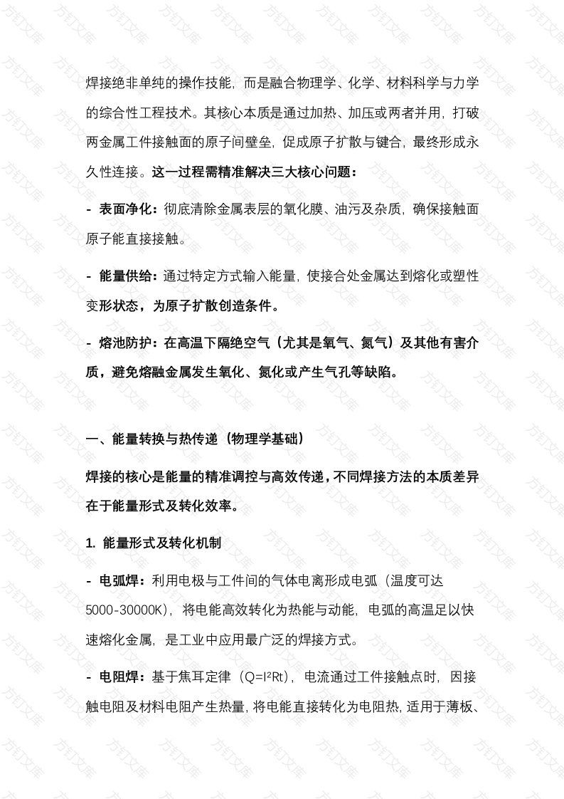 焊接绝非单纯的操作技能,而是融合物理学、化学、材料科学与力学的综合性工程技术。其核心本质是通过加热、加压或两者并用,打破两金属工件接触面的原子间壁垒,促成原子扩散与键合,最终形成永久性连接。这一过程需精准解决三大核心问题:表面净化:彻底清除金属表层的氧化膜、油污及杂质,确保接触面原子能直接接触。能量供给:通过特定方式输入能量,使接合处金属达到熔化或塑性变形状态,为原子扩散创造条件。熔池防护:在高温下隔绝空气(尤其是氧气、氮气)及其他有害介质,避免熔融金属发生氧化、氮化或产生气孔等缺陷。能量转换与热传递(物理学基础)焊接的核心是能量的精准调控与高效传递,不同焊接方法的本质差异在于能量形式及转化效率。1.能量形式及转化机制电弧焊:利用电极与工件间的气体电离形成电弧(温度可达5000-30000K),将电能高效转化为热能与动能,电弧的高温足以快速熔化金属,是工业中应用最广泛的焊接方式。电阻焊:基于焦耳定律(Q=Rt),电流通过工件接触点时,因接触电阻及材料电阻产生热量,将电能直接转化为电阻热,适用于薄板、线材的批量连接(如汽车车身焊点)高能束焊(激光/电子束):激光焊将光能聚焦于微小区域(光斑直径可小至0.1mm),电子束焊则利用高速电子撞击工件产生动能-热能转换,两者均能实现局部高温、小热影响区的精密焊接,常用于航空航天等高端制造领域。摩擦焊:通过工件间的高速相对摩擦(转速可达数千转/分钟),将机械能转化为热能,使接触面达到塑性状态后施加轴向压力完成连接无需填充材料,接头强度高。2.热传导规律热量从热源向工件传递的过程决定了焊接质量:热输入量(如电流、电压、焊接速度)直接影响熔深热输入过大易导致烧穿或晶粒粗化,过小则可能未焊透;热传导的方向性(如电弧焊中热量向母材四周扩散)会形成特定的温度场,进而决定热影响区的范围与组织分布二、金属组织与性能演变(冶金学核心焊接过程相当于“微型冶炼,金属经历快速加热-熔化凝固-冷却的极端热循环,微观组织的变化直接决定接头性能。1.熔池的形成与凝固特性热源作用下,母材与填充材料(如焊条、焊丝)熔化形成熔池,其形状受热源移动速度、能量密度影响(如激光焊熔池呈深窄形,电弧焊则较宽浅)热源移开后,熔池从熔合线(熔池与未熔化母材的交界)向中心定向凝固,因冷却速度快(可达10-1000℃/s),易形成柱状晶组织,若冷却过快可能产生过饱和固溶体或非平衡相(如马氏体)。2.热影响区(HAZ)的组织分层热影响区是母材未熔化但受高温影响的区域,按温度梯度可分为:过热区:温度接近金属熔点(如钢约1300-1400℃),晶粒因高温急剧粗化,力学性能显著下降(韧性降低、脆性增加),是接头的薄弱环节。正火区:温度处于相变点以上(如钢的Ac3以上)发生完全重结晶,晶粒细化,强度与韧性均较好。不完全相变区:温度在相变点区间(如钢的Ac1-Ac3),仅部分组织发生相变(如珠光体转变成奥氏体),导致组织与性能不均匀。回火区:针对淬火钢,温度达到回火温度(如200-600℃)时,马氏体分解为回火索氏体,硬度下降但韧性提升。3.合金元素的作用与控制填充材料中的合金元素(如锰、硅可脱氧,铬、镍能提高耐腐蚀性)会融入熔池,调整焊缝成分以匹配母材性能。高温下部分元素(如碳、磷)可能烧损或蒸发,需通过焊材成分设计(如低氢型焊条)补偿,避免焊缝性能劣化。库