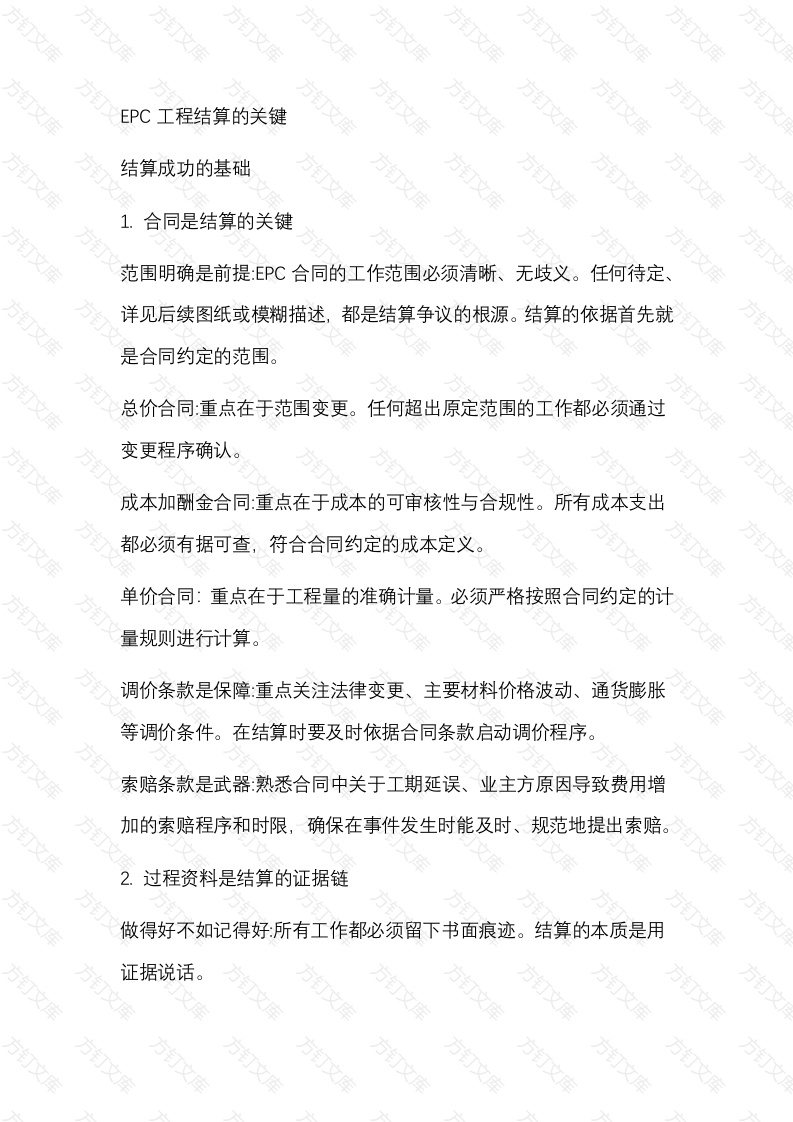 EPC工程结算的关键方结算成功的基础万1.合同是结算的关键范围明确是前提EPC合同的工作范围必须清晰、无歧义。任何待定详见后续图纸或模糊描述,都是结算争议的根源。结算的依据首先就是合同约定的范围。总价合同:重点在于范围变更。任何超出原定范围的工作都必须通过变更程序确认。成本加酬金合同:重点在于成本的可审核性与合规性。所有成本支出都必须有据可查,符合合同约定的成本定义单价合同:重点在于工程量的准确计量。必须严格按照合同约定的计量规则进行计算。调价条款是保障:重点关注法律变更、主要材料价格波动、通货膨胀等调价条件。在结算时要及时依据合同条款启动调价程序。索赔条款是武器:熟悉合同中关于工期延误、业主方原因导致费用增加的索赔程序和时限,确保在事件发生时能及时、规范地提出索赔。2.过程资料是结算的证据链做得好不如记得好:所有工作都必须留下书面痕迹。结算的本质是用证据说话。文设计变更与工程指令:所有对原设计的修改,必须经由业主/监理正式批准。现场签证:记录施工过程中遇到的与合同约定或图纸不符的实际情况并完成签字确认。会议纪要:重要的决议、承诺和指令,尤其是涉及费用和工期的,须在会议纪要中明确体现。往来函件:所有与业主、分包商、供应商的正式沟通,特别是涉及费用确认、工期确认的,都必须通过书面函件。影像资料:施工前、中、后的照片和视频,是证明现场情况最直观的证据。执行过程中的关键点设计管理的深度介入从源头控制成本与变更EPC项目的优势在于设计和施工的深度融合。结算人员应提前介入设计阶段,理解设计意图,评估不同设计方案对成本和施工难度的影响。限额设计:确保设计成果在合同总价的控制范围内,避免因超标设计导致成本超支而无法结算。设计优化:在满足功能和安全的前提下,通过设计优化降低成本,这部分节约的效益是EP℃项目的利润来源之一,但任何优化都必须获得业主的认可。文变更与索赔的主动管理动态控制现金流建立变更预警机制:一旦发现工作范围可能超出合同,应立即启动内部评估,准备变更申请资料。先批准,后施工原则:对于重大变更,务必坚持获得业主书面批准后再施工,避免干了白干的风险。索赔的时效性与程序性:严格遵守合同约定的索赔时限,按照规定的格式和程序提交索赔报告,做到有理有据。3.竣工结算资料的完整性与规范性结算书是最终交付的成果,其质量直接关系到回款速度和金额。竣工图必须准确反映最终的施工成果,所有变更都已在图上标注清晰,并得到监理和业主的签章确认。这是工程量计算的直接依据。工程量计算书:计算过程清晰、逻辑严谨,便于业主和审计方核对。材料价格确认单对于合同约定可调价的主要材料,其采购发票、价格确认单等资料必须齐全。支撑性文件汇编:将整个项目周期内的所有变更、签证、索赔、会议纪要等证据性文件,按照结算顺序进行系统整理、编号、装订,形成份强有力的证据链4.沟通与谈判的策略前期沟通:在结算报告正式提交前,可与业主方造价人员进行非正式万文
