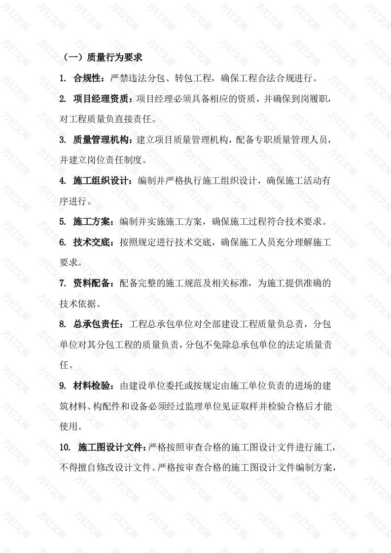 质量行为要求合规性:严禁违法分包、转包工程,确保工程合法合规进行。2.项目经理资质:项目经理必须具备相应的资质,并确保到岗履职,对工程质量负直接责任。3.质量管理机构:建立项目质量管理机构,配备专职质量管理人员,并建立岗位责任制度。施工组织设计:编制并严格执行施工组织设计,确保施工活动有序进行。5.施工方案:编制并实施施工方案,确保施工过程符合技术要求。6技术交底:按照规定进行技术交底,确保施工人员充分理解施工要求。7.资料配备:配备完整的施工规范及相关标准,为施工提供准确的技术依据。8.总承包责任:工程总承包单位对全部建设工程质量负总责,分包单位对其分包工程的质量负责,分包不免除总承包单位的法定质量责任。9.材料检验:由建设单位委托或按规定由施工单位负责的进场的建筑材料、构配件和设备必须经过监理单位见证取样并检验合格后才能10.施工图设计文件:严格按照审查合格的施工图设计文件进行施工,不得擅自修改设计文件。严格按审查合格的施工图设计文件编制方案,并组织实施,若在施工过程中出现应修改的内容,需按审查程序报送建设单位进行变更。11.施工技术标准:严格按照施工技术标准进行施工,确保施工质量。12.施工记录:做好各类施工记录,实时记录施工过程质量管理的内由施工技术管理人员编写,并对其真实性负责。13.隐蔽工程检查:按规定进行隐蔽工程质量检查和记录,确保隐蔽工程质量。14.质量报验:做好检验批、分项工程、分部工程的质量报验工作。15.质量问题处理:处理质量问题和质量事故,并做好记录。16.样板引路制度:实施样板引路制度,设置实体样板和工序样板,提高施工质量。17.不合格试验报告处理:收到不合格试验报告时,立即停止施工,分析原因并提出整改方案,建设单位或监理单位应督促施工单位依法处理不合格情况。18.质量监督通知:根据质量监督计划,在工程隐蔽前通知质量监督机构。19.竣工图绘制:工程完工后,绘制竣工图时应包含图纸会审、设计变更及技术核定涉及的内容。(二)安全行为要求1.安全生产管理机构:设立安全生产管理机构,按规定配备专职安全生产管理人员。万万万万2负责人资质一致性:项目负责人、专职安全生产管理人员资质与施工安全监督手续资料一致。3.安全生产责任制度:建立健全安全生产责任制度,并按要求进行考核。4.安全生产教育:按规定对从业人员进行安全生产教育、培训和安全技术交底。5.安全技术措施:在施工组织设计中编制安全技术措施、施工现场临时用电方案和专项施工方案,对超过一定规模的危险性较大的分部分项工程组织专家论证。6.安全生产协议:实行施工总承包的,总承包单位与分包单位签订安全生产协议书,明确安全生产职责。7.劳动防护用品:按规定为作业人员提供合格的劳动防护用品,并监督、教育作业人员正确使用。8.消防与安全警示:在施工现场设置消防通道、消防水源、配备消防设施和灭火器材,并在有较大危险因素的场所设置安全警示标志。9.安全生产费用:按规定提取和使用安全生产费用,制定使用计划,并建立安全措施费台账。10.隐患排查治理:建立健全生产安全事故隐患排查治理制度,进行安全检查,并做好检查记录,及时消除安全隐患。11.负责人带班制度:执行建筑施工企业负责人及项目负责人施工现场带班制度。万万万万