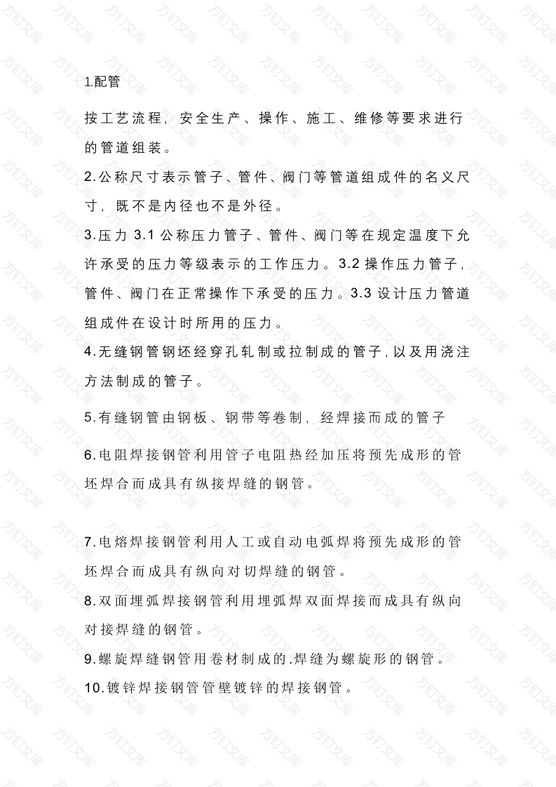 1.配管V按工艺流程,安全生产、操作、施工、维修等要求进行的管道组装。2.公称尺寸表示管子、管件、阀门等管道组成件的名义尺寸,既不是内径也不是外径。3.压力3.1公称压力管子、管件、阀门等在规定温度下允许承受的压力等级表示的工作压力。3.2操作压力管子,管件、阀门在正常操作下承受的压力。3.3设计压力管道组成件在设计时所用的压力。4.无缝钢管钢坯经穿孔轧制或拉制成的管子,以及用浇注方法制成的管子。5.有缝钢管由钢板、钢带等卷制,经焊接而成的管子6.电阻焊接钢管利用管子电阻热经加压将预先成形的管坯焊合而成具有纵接焊缝的钢管。7.电熔焊接钢管利用人工或自动电弧焊将预先成形的管坯焊合而成具有纵向对切焊缝的钢管。8.双面埋弧焊接钢管利用埋弧焊双面焊接而成具有纵向对接焊缝的钢管。9.螺旋焊缝钢管用卷材制成的.焊缝为螺旋形的钢管。10.镀锌焊接钢管管壁镀锌的焊接钢管。11.架空管道离开地面敷设的,一般下方可以过人或车辆的管道。12.沿地管道接近地面或贴地敷设的管道13.管沟管道敷设在管沟中的管道。方14.埋地管道埋设在地下的管道。15.旁通管从管道一侧,绕过阀门或设备接到另一侧,具有备用或调节等功能的管道,如调节阀的旁通管。16.低压管道管内介质压力为0~2.5Mpa的管道。17.中压管道管内介质压为为2.5~10mpa的管道18.高压管道管内介质压力大于等于10mpa的管道。19.真空管道管内绝对压力低于大气压力的管道。20.气液两相流管道输送气液混相流体的管道。21.平衡液体管道输送泡点状态下液体的管道。22.取样管为取出管道内用于分析化验的介质而设置的管道。23.排液管为管道或设备低点排液而设置的管道。24.放气管为管道或设备高点排气而设置的管道。25.异径弯头两端直径不同的弯头。26.长半径弯头弯头半径等于1.5倍管子公称尺寸的弯头。27.短半径弯头弯头半径等于管子公称尺寸的弯头。万万万28.等径三通直径相同的三通。29.异径三通直径不同的三通30.等径四通直径相同的四通。31.异径四通直径不同的四通。32.同心大小头中心线重合的异径管33.偏心大小头中心线不重合且一侧平直的异径管34.管箍用于连接两根管段的带有内螺纹或承口的管件有双头螺纹管箍,单头螺纹管箍,双承口管箍,单承口管箍,异径双承口管箍,异径螺纹管箍。35.内外丝用于连接直径不同的管子,一端为内螺纹一端为外螺纹的管接头36.短节带外螺纹的直通管件。有单头螺纹短节和双头螺纹短节37.支管台焊接在主管分支处,起加强对作用的管接头有螺纹支管台,对焊支管台,承插焊支管台,弯头支管台,斜接支管台。38.丝堵用于堵塞管子端部的外螺纹管件,有方头管堵六角管堵等。39.管帽与管子端部焊接或螺纹连接的帽状管件。40.法兰按形式有平焊法兰对焊法兰、承插焊法兰螺纹法兰、松套法兰按密封面有全平面、突面、凹凸面,榫槽面,环连接面。万V