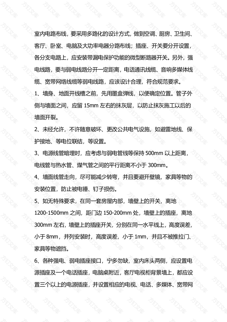 室内电路布线,要采用多路化的设计方式,做到空调、厨房、卫生间、客厅、卧室、电脑及大功率电器分路布线;插座、开关要分开设置,各分支电路上,应安装带漏电保护功能的微型断路器开关。另外,强电线路,要与弱电线路分开一定距离,电话通讯线缆、音响多媒体线缆、宽带网络线缆等弱电线路,应该设计合理,符合规范要求。1、墙身、地面开线槽之前,先用墨盒弹线,以便确定位置。管子外侧与墙面之间,应留15mm左右的抹灰层,以防止抹灰施工以后的墙面开裂。2、未经允许,不许随意破坏、更改公共电气设施,如避雷地线、保护接地、等电位联结,等设置。3、电源线管暗埋时,应考虑与弱电管线等保持500mm以上距离电线管与热水管、煤气管之间的平行距离不小于300mm。4、墙面线管走向,尽可能减少转弯,并且要避开壁镜,家具等物的安装位置,防止被电锤、钉子损伤。5、如无特殊要求,在同一套房屋内部,墙壁上的开关,离地1200-1500mm之间,距门边150-200mm处,墙壁上的插座,离地300mm左右,墙壁上的插座开关,分别在同一水平线上,高度误差小于8mm,并列安装时,高度误差,小于1mm,并且不被推拉门家具等物遮挡。6、各种强电、弱电插座接口,宁多勿缺,室内床头两侧,应设置电源插座及一个电话插座,电脑桌附近,客厅电视柜背景墙上,都应设置三个以上的电源插座,并设置相应的电视、电话、多媒体、宽带网络等插座。7、电视、电话、多媒体音响、宽带网络等弱电线路的铺设方法及要求,与电源线的铺设方法相同,其插座或线盒,与电源插座并列安装但是,强电线路与弱电线路,不允许共用一套管子。8、所有入墙电线,采用直径16mm以上的PVC阻燃管埋设,导线占管径<40%空间,与盒底连接,使用专用接口件。9、使用导线管时,电源线管从地面穿出应做合理的转弯半径,特别注意,在地面下,必须使用套管,并加胶连接紧密,地面没有封闭之前,必须保护好PVC管套,不允许有破裂损伤;铺地板砖时,PVC套管,应被水泥沙浆完全覆盖。10、配线时,相线与零线的颜色应不同;同一住宅相线火线(L)颜色应统一,比如,相线火线,使用黄色,或者使用绿色,或者使用红色零线(N)用淡蓝色,保护接地线(PE)用黄绿双色线。11、线管穿线之前,应将直接头打上PVC胶水,以免进水。电源线穿管时,应将导线取直再穿管,不可中途拔、拉管接头;弱电线路中,穿线时用力时不可过猛,以免导线断心。12、电源分支接头,应接在插座盒、开关盒、灯头盒内,每个接头接线,不宜超过两根,线在盒内,应有适当的余量。13、音响线出入墙面,应做底盒。多芯电话线的接头处,护套管口用胶带包扎紧,以免电话线受潮,发生串音等故障。14、电视天线接线,必须采用分支器,并留有检查口。15、管中电源线,不可有接头、不可将电源线,裸露在吊顶上或直接抹入墙中,以保证电源线訶以拉动或更换。16、导线连接坚固,接头不受拉力,包扎严密www.diangon.com采用螺钉(螺帽)连接时,电线无绝缘距离不大于3mm,铜芯线间连接,应用压接或绞接法,绞接长度,不小于5圈,裸露电线,必须先用防水胶带包扎后,再缠绕黑胶布,无绝缘层破损等缺陷,经检验认可。17、穿管的电线、信号线、电话线等都进行检测,以确认是否线间短路、对地短路、断线等,确认无误后再进行埋线管。18、单相两孔插座的接线,面对插座:左零右相(即,左边为零线右边为火线),单相三孔,正上方为地线。所有单相插座,均符合“左零右相,接地在上"的原测。19、插座、开关安装,要牢固,四周无缝隙,厨房、卫生间内及室内及室外安装的开关,应采用带防溅盒的开关20、空调供电,用16A三孔插座,高度在1500mm以下的所有插座应安装具有保护挡板的插座,以免儿童摸,卫生间内部,宜作局部等电位联结端子,插座采用防水防溅型,并远离水源。照明开关,应设在门外,镜前灯、浴霸,卫生间内部,宜选用防水开关。21、为了生活舒适方便,卧室应采用双控开关,厨房电源插座,,应并列设置开关,控制电源通断。22、插座、开关面板固定时,应用配套的螺钉,不得使用木螺钉或石膏板螺丝代替,以免损坏底盒,开关安装方向一致。23、配电箱,应根据室内用电设备的不同功率,分别配线供电;大功