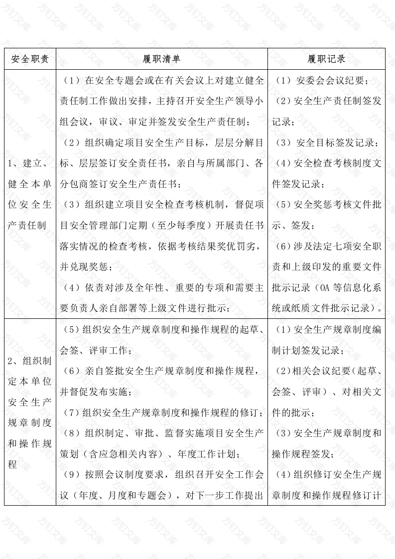 安全职责履职清单履职记录(1)在安全专题会或在有关会议上对建立健全(1)安委会会议纪要;责任制工作做出安排,主持召开安全生产领导小(2)安全生产责任制签发组会议,审议、审定并签发安全生产责任制;(2)组织确定项目安全生产目标,层层分解目(3)安全目标签发记录;1、建立、标、层层签订安全责任书,亲自与所属部门、各(4)安全检查考核制度文健全本单分包商签订安全生产责任书:件签发记录:位安全生(3)组织建立项目安全检查考核机制,督促项(5)安全奖惩考核文件批产责任制目安全管理部门定期(至少每季度)开展责任书示、签发;落实情况的检查考核,依据考核结果奖优罚劣,(6)涉及法定七项安全职并兑现奖惩;责和上级印发的重要文件(4)依责对涉及全年性、重要的专项和需要主批示记录(OA等信息化系要负责人亲自部署等上级文件进行批示:统或纸质文件批示记录)。(5)组织安全生产规章制度和操作规程的起草、(1)安全生产规章制度编会签、评审工作;制计划签发记录;2、组织制(6)亲自签批安全生产规章制度和操作规程,(2)相关会议纪要(起草、定本单位并督促发布实施;会签、评审)、对相关文安全生产(7)组织安全生产规章制度和操作规程的修订:件的批示:规章制度(8)组织制定、审批、监督实施项目安全生产(3)安全生产规章制度和和操作规策划(含应急相关内容)、年度工作计划:操作规程签发;程(9)按照会议制度要求,组织召开安全工作会(4)组织修订安全生产规议(年度、月度和专题会),对下一步工作提出章制度和操作规程修订计万划的签批记录:(10)依据安全生产领导小组制度规定,主持召(5)安全生产策划:开4次安全生产领导小组会议,研究解决阶段性(6)年度工作计划及签批安全问题:(11)按照集团和公司标准化、应急能力建设管(7)年度、月度和专题会理办法规定,组织开展安全生产标准化及应急能记录(签到表、照片、会力建设工作:议材料)、纪要;方(8)组织制定、审批、监督实施项目安全生产策划(含应急相关内容)、年度工作计划:(9)安全生产领导小组会(10)亲自签发、组织、参与安全生产标准化及应急能力建设的过程记录。3、组织制(12)审批签发年度教育培训计划:(1)年度教育培训计划签定并实施(13)确保教育培训计划实施的人、财、物等资批记录:本单位安源,督促相关部门按计划开展培训工作,经常过(2)对涉及教育培训所需全生产教问了解培训计划实施情况,解决遇到的问题:人、财、物相关文件的批育和培训(14)按要求参加法定(如三类人员)、公司、示,对相关文件的批示或计划分公司组织开展的安全教育培训:会议纪要;万万方万方万方(3)参加安全教育培训的万文报名、签到记录、培训合格证件。(15)确保安全资源的有效配置,按照集团公司、公司、分公司和相关方要求建立项目安全生产管(1)项目安全管理组织机理组织机构(含分包商),配备数量及能力满足构图、安全管理人基本信要求的安全管理人员(含分包商):息台账(含分包商):(16)审定签发、督促实施年度安全生产费用计(2)签发安全生产费用预4、保证本单位安全(17)组织制定安全生产费用月度计划,签批季(3)安全生产费用月度计生产投入度安全生产费用投入报表:划、季报表;报销或支付的有效实(18)督促财务部门定期对安全生产费用使用统签字;施计情况进行核查:(4)相关会议纪要或检查(19)定期监督检查项目(含分包商)安全生产投入使用情况,及时解决安全费用预算、使用不(5)年度安全工作会议材料。(20)在年度安全工作会议或安全工作总结中公布安全生产费用实施情况:5、督促、(21)组织开展项目安全风险评估,制定风险管(1)安全风险评估相关文检查本单件签发记录;(2)年度安位的安全22)组织制定、签发年度安全检查工作计划、全检查工作计划、隐患排生产工作,隐患排查治理方案;查治理方案的签发记录: