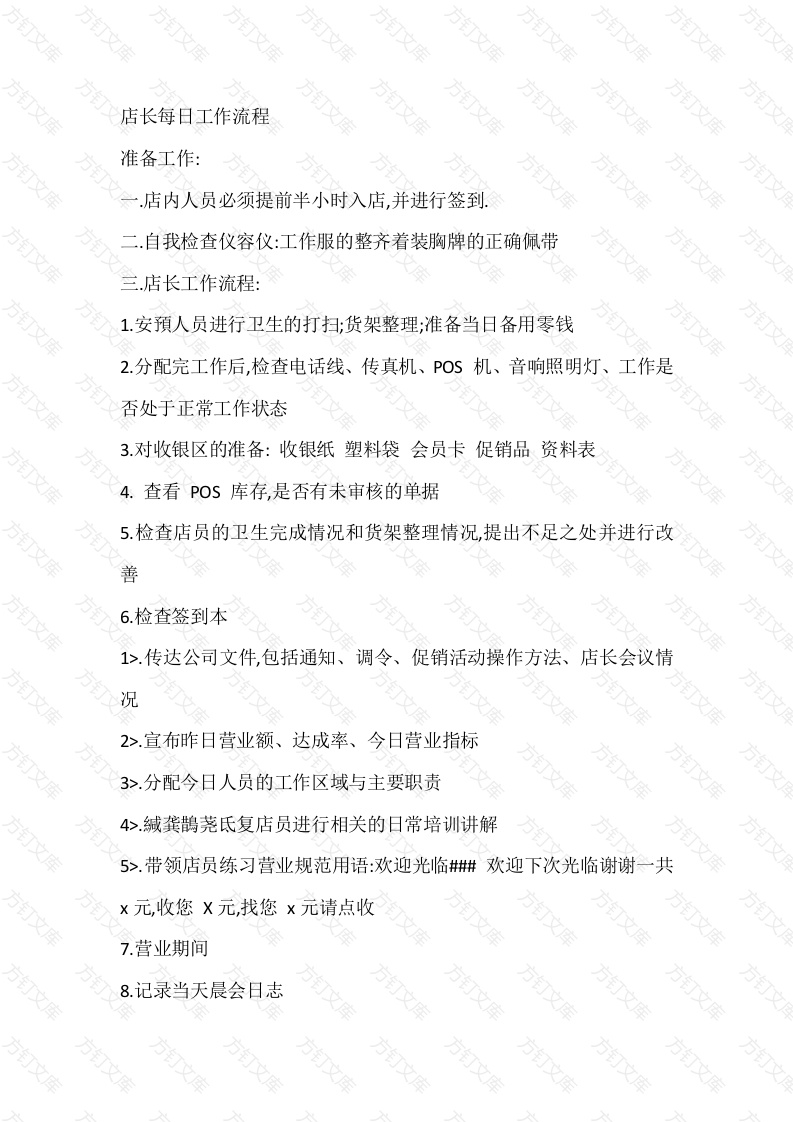 文店长每日工作流程方准备工作:店内人员必须提前半小时入店,并进行签到二自我检查仪容仪:工作服的整齐着装胸牌的正确佩带三店长工作流程:1.安預人员进行卫生的打扫;货架整理;准备当日备用零钱2.分配完工作后,检查电话线、传真机、POS机、音响照明灯、工作是否处于正常工作状态3对收银区的准备:收银纸塑料袋会员卡促销品资料表查看POS库存,是否有未审核的单据5.检查店员的卫生完成情况和货架整理情况,提出不足之处并进行改善6.检查签到本1>.传达公司文件,包括通知、调令、促销活动操作方法、店长会议情2>.宣布昨日营业额、达成率、今日营业指标3>.分配今日人员的工作区域与主要职责4>.緘龚鵲荛氏复店员进行相关的日常培训讲解5>.带领店员练习营业规范用语:欢迎光临琳欢迎下次光临谢谢一共x元,收您X元,找您×元请点收7.营业期间8.记录当天晨会日志万万万方万万9时刻检查及货架上有无空缺商品,提醒店员及时补10.监督促销活动的实施1.关注促销活动的进展,提醒店员及时向顾客做好介绍与宣传11.促销商品的摆放醒目,促销价格标牌的摆放醒目方12.促销商品及时补货上架13.处理营业中的顾客投诉1>.端正自己的心态,认真听取投诉情况2>不与顾客抵触,始终保持微笑,并认真讲解3>.不要轻意向顾客做出承诺14.对新员工进行相应的指导与培训包括:日工作流程、礼仪、商品基本知识等15.接收货品,安排人员点货验收1>.察看箱子外包装有无破损方可收货万2>.察看箱子外包装为红色封箱带,上下共8条方可收货3>,店内点货按箱中出库清单,逐一点货方4>.对照点货数量,审核POS中的单据,如有差异及时联系总部16.时刻维持店生卫生状况17.午餐期间1>.合理安排店员轮流外出进餐方2>.监督检查B班人员签到情况3>.收银员交接工作的及时监督18.检查营业高峰期零钱备用情况万万19.店长外出,安排代管人员负责门店管理20.营业高峰期1>.查看截止销售额2>.关注目前为止的销售情况,离今日营业指标还有多少方丁方3>.将情况通知店员,激励店员再接再励21.为高峰期做准备1>.空缺商品再次检查并补货2>.零钱的及时检查与兑换3>.促销活动资料的关注目前为止的销售情况,离今日营业指标还有多4>.将情况通知店员,激励店员再接再励22.对周边信息的收集1.竞争对手的商品情况/促销情况方2.周边同一业态商家的促销情况23.促销活动的执行及跟踪24.晚餐期间1>.合理安排店员轮流进餐2>.监督交接班情况3.P0S的现时销售情况,再次激励店员加油努力25.营业结束1.安排卫生的打扫2.清点当日收银现金,确认后并锁入保险箱内万万