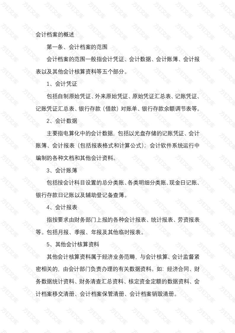 会计档案的概述第一条、会计档案的范围会计档案的范围一般指会计凭证、会计数据、会计账簿、会计报表以及其他会计核算资料等五个部分。1、会计凭证包括自制原始凭证、外来原始凭证、原始凭证汇总表、记账凭证、记账凭证汇总表、银行存款(借款)对账单、银行存款余额调节表等。2、会计数据主要指电算化中的会计数据,包括以光盘存储的记账凭证、会计账簿、会计报表(包括报表格式和计算公式);会计软件系统运行中编制的各种文档和其他会计资料。3、会计账簿包括按会计科目设置的总分类账、各类明细分类账、现金日记账、银行存款日记账以及辅助登记备查簿。4、会计报表指按要求由财务部门上报的各种会计报表、统计报表、劳资报表等。包括月报、季报、年报及其他临时报表。5、其他会计核算资料其他会计核算资料属于经济业务范畴,与会计核算、会计监督紧密相关的,由会计部门负责办理的有关数据资料。如:经济合同、财务数据统计资料、财务清查汇总资料、核定资金定额的数据资料、会计档案移交清册、会计档案保管清册、会计档案销毁清册。第二主要会计档案的生成记账凭证根据原始凭证在计算机上直接编制记账凭证,由计算机打印输出。2、会计账簿现金、银行存款日记账由出纳员根据已经办理完毕的收付款凭证逐笔顺序登记。各账户的明细账由计算机按月打印输出。总账由计算机按月打印出科目余额表替代。3、会计报表会计报表由计算机按报表填报的要求打印输出。第三条、会计档案的装订1、会计凭证的装订会计凭证每月装订一次,装订好的凭证按年分月归档。(1)装订前的准备工作①分类整理,按顺序排列,检查日期、编号是否齐全②摘除凭证内的金属物,对大的张页或附件要折叠成同记账凭证大小,且要避开装订线,以便翻阅时保持数字完整③整理检查凭证顺序号,如有颠倒要重新排列。发现缺号要查明原因。再检查附件是否漏缺;④记账凭证上有关人员的印章是否齐全。2)装订时的要求万①用“三针中引线”法装订③凭证外面要加封面,文万3装订凭证厚度一般为1.5厘米。3)装订后的注意事项①每本封面上填写好凭证种类、起止号码、凭证张数、会计主管人员和装订人员签章;②在封面上编好卷号,按编号顺序入柜,并在显露处标明凭证种类编号。2、会计帐簿及报表的装订各种会计账簿由计算机打印输出后,按月装订成册。各类报表在报送后将留存的报表按月装订成册。第四条、会计档案的保管1、存储在计算机中的会计数据要每日进行机内数据库备份,半月进行光盘刻录。2、账表打印和日常核算同步进行,记账凭证、刻有数据的光盘、打印出的各种账表(经会计主管和系统管理员签章后)按《会计档案管理办法》的规定进行保管。3、会计档案保管人员依据会计岗位工作职责的规定,对所保管的档案内容及范围负相应的责任。4、各种会计资料包括打印出来的会计资料以及存储会计资料的光盘等,未经单位领导同意,不得外借和拿出单位。方万方万万