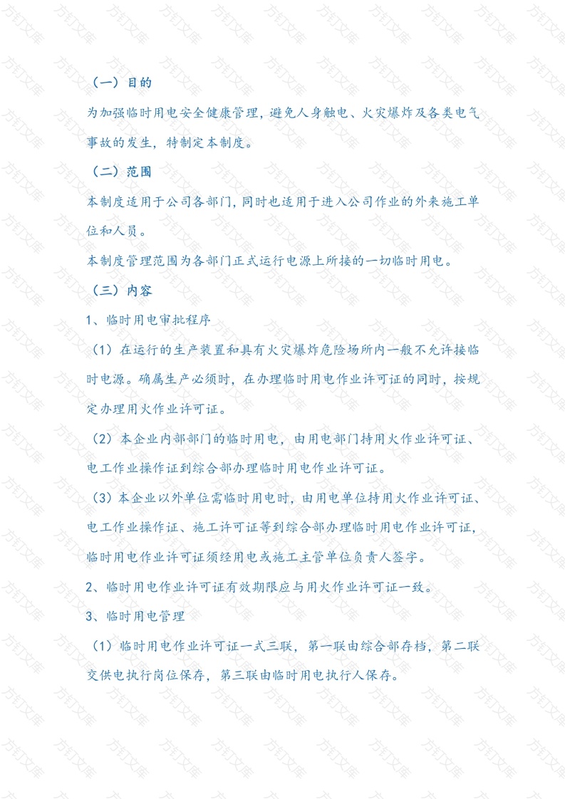 目的为加强临时用电安全健康管理,避免人身触电、火灾爆炸及各类电气事故的发生,特制定本制度。(二)范围本制度适用于公司各部门,同时也适用于进入公司作业的外来施工单位和人员。文本制度管理范围为各部门正式运行电源上所接的一切临时用电。(三)内容1、临时用电审批程序(1)在运行的生产装置和具有火灾爆炸危险场所内一般不允许接临时电源。确属生产必须时,在办理临时用电作业许可证的同时,按规定办理用火作业许可证。(2)本企业内部部门的临时用电,由用电部门持用火作业许可证、电工作业操作证到综合部办理临时用电作业许可证。(3)本企业以外单位需临时用电时,由用电单位持用火作业许可证、电工作业操作证、施工许可证等到综合部办理临时用电作业许可证,临时用电作业许可证须经用电或施工主管单位负责人签字。2、临时用电作业许可证有效期限应与用火作业许可证一致。3、临时用电管理(1)临时用电作业许可证一式三联,第一联由综合部存档,第二联交供电执行岗位保存,第三联由临时用电执行人保存。万文2)临时用电结束后,临时用电作业许可证第一联由供电执行岗位签字后,由用电执行人交供电主管部门综合部注销。(3)临时用电作业许可证保存期为1年。4、有自备电源的施工队其自备电源不得接入电网电源。5、用电结束后,临时施工用的电气设备和线路应立即拆除,由用电执行岗位的技术人员、供电执行部门综合部共同检查验收签字。6、临时用电必须严格确定用电时限,超过时限要重新办理临时用电作业许可证的延期手续,同时办理相关的继续用火作业许可证手续。安装临时用电线路的作业人员,必须具有电工操作证方可施工严禁擅自接用电源,对擅自接用的按严重违章和窃电处理。电气故障应由电工排除(关注公众号:应急管理大百科)。8、临时用电设备和线路必须按供电电压等级正确选用,所用的电气元件必须符合国家规范标准要求,临时用电电源施工、安装必须严格执行电气施工、安装规范。(1)在防爆场所使用的临时电源,电气元件和线路要达到相应的防爆等级要求,并采取相应的防爆安全措施。(2)临时用电的单相和混用线路应采用五线制。3)临时用电线路架空时,不能采用裸线,架空高度在装置内不得低于2.5米,穿越道路不得低于5米;横穿道路时要有可靠的保护措施,严禁在树上或脚手架上架设临时用电线路。万4)采用暗管理埋设及地下电缆线路必须设有“走向标志”及安全标志。电缆埋深不得小于0.7米,穿越公路在有可能受到机械伤害的地段应采取保护套管、盖板等措施。(5)对现场临时用电配电盘、配电箱要有编号和防雨措施,配电盘箱门必须能牢靠关闭。(6)行灯电压不得超过36伏;在特别潮湿的场所或塔、槽、罐等金属设备内作业装设的临时照明行灯电压不得超过12伏。(7)临时用电设施必须安装符合规范要求的漏电保护器,移动工具、手持式电动工具应一机一闸一保护。9、临时供电执行岗位送电前要对临时用电线路、电气元件进行检查确认,满足送电要求后,方可送电。10、对临时用电设施要有专人维护管理,每天必须进行巡回检查,立检查记录和隐患问题处理通知单,确保临时供电设施完好。11、临时用电单位必须严格遵守临时用电的规定,不得变更临时用电地,点和工作内容,禁止任意增加用电负荷,一旦发现违章用电,供电执行岗位有权予以停止供电(关注公众号:应急管理大百科)。12、临时用电结束后,临时用电单位应及时通知供电执行岗位停电,由原临时用电单位拆除临时用电线路,其他单位不得私自拆除。私自拆除而造成的后果由拆除单位负责。13、临时用电单位不得私自向其它单位转供电。14、临时用电作业许可证是临时用电作业的依据,不得涂改、不得代签,要妥善保管,保存期为一